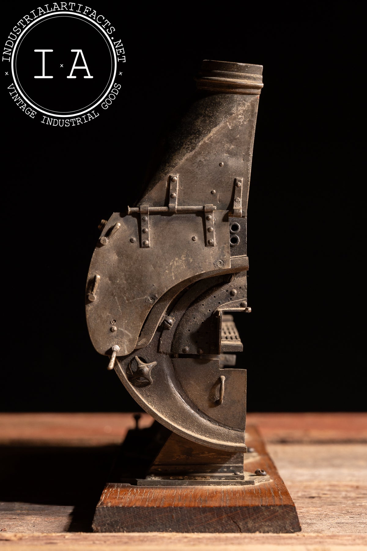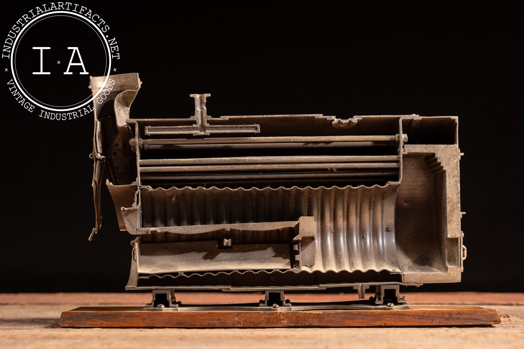 Cast metal salesman sample illustrating the internal construction of an industrial boiler, presented as a longitudinal cross-section mounted on its original wooden base. The model exposes flues, firebox passages, baffles, and heat chambers in layered relief, allowing customers to visually understand airflow, combustion, and heat transfer within the boiler shell. Details such as riveted seams, access ports, and stepped internal chambers closely mirror full-scale boiler construction of the period, translated into compact demonstration form.