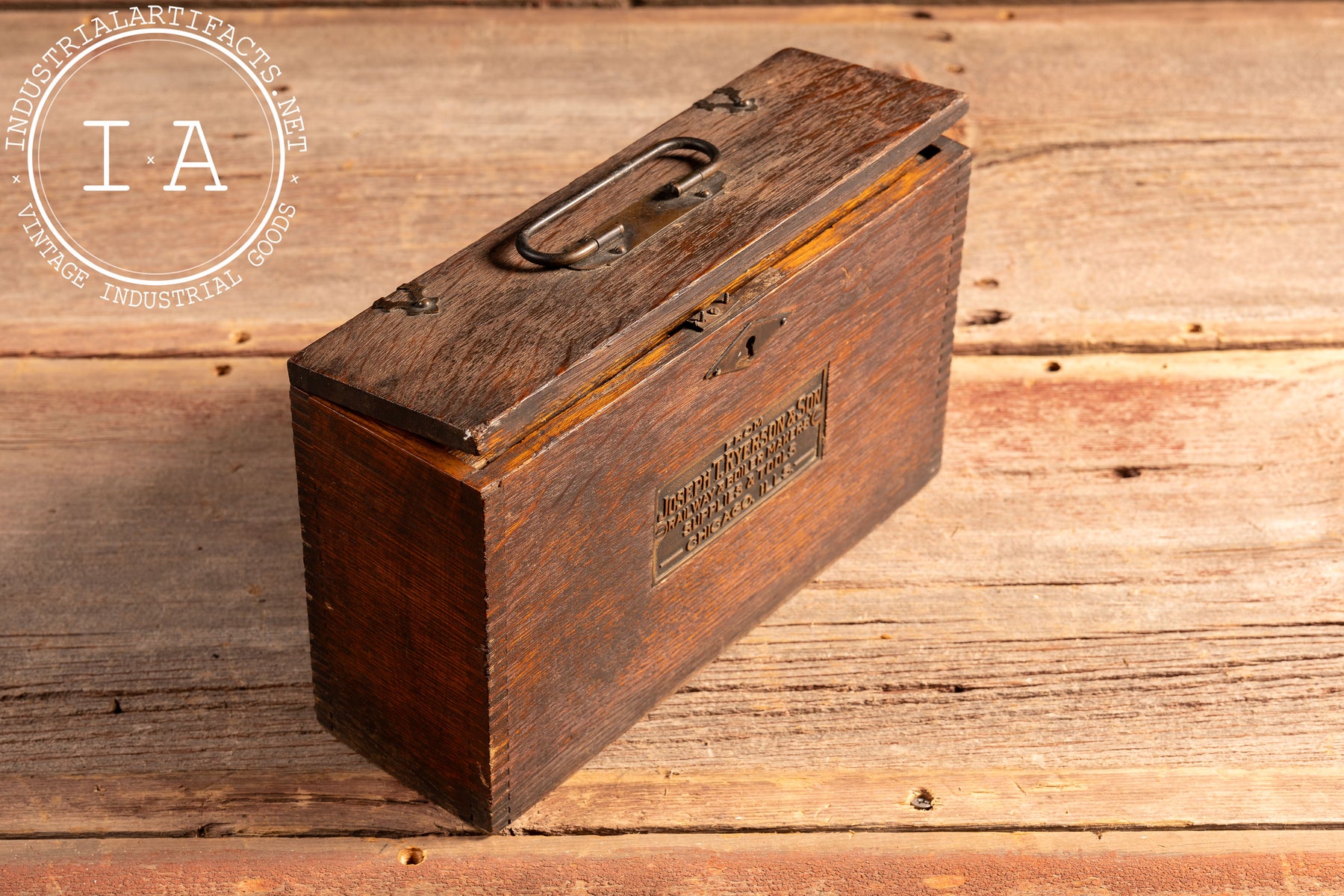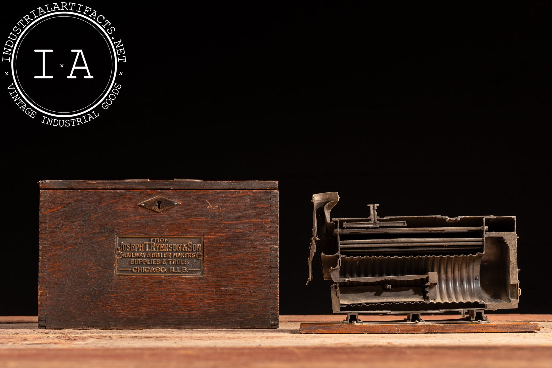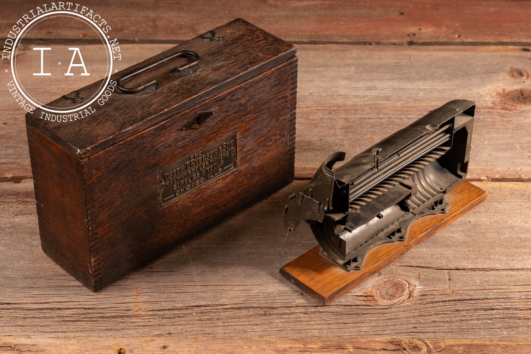 This model was supplied by Joseph T. Ryerson & Son, a major Chicago-based supplier of railway, boiler, and industrial equipment, as indicated by the original fitted wooden case bearing the firm's brass identification plaque. Ryerson salesmen used pieces like this during site visits and trade demonstrations to explain engineering advantages to railroad operators, factory owners, and municipal buyers at a time when boilers were critical infrastructure for power, heating, and transportation.