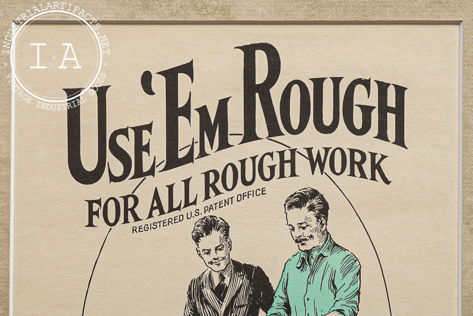 This original advertising print for the Amsterdam Broom Company promotes their line of durable household and industrial brooms with the slogan "Use 'Em Rough - For All Rough Work, Built to Endure." The lithographed illustration depicts three figures at work with brooms, underscoring the company's emphasis on toughness and reliability.
