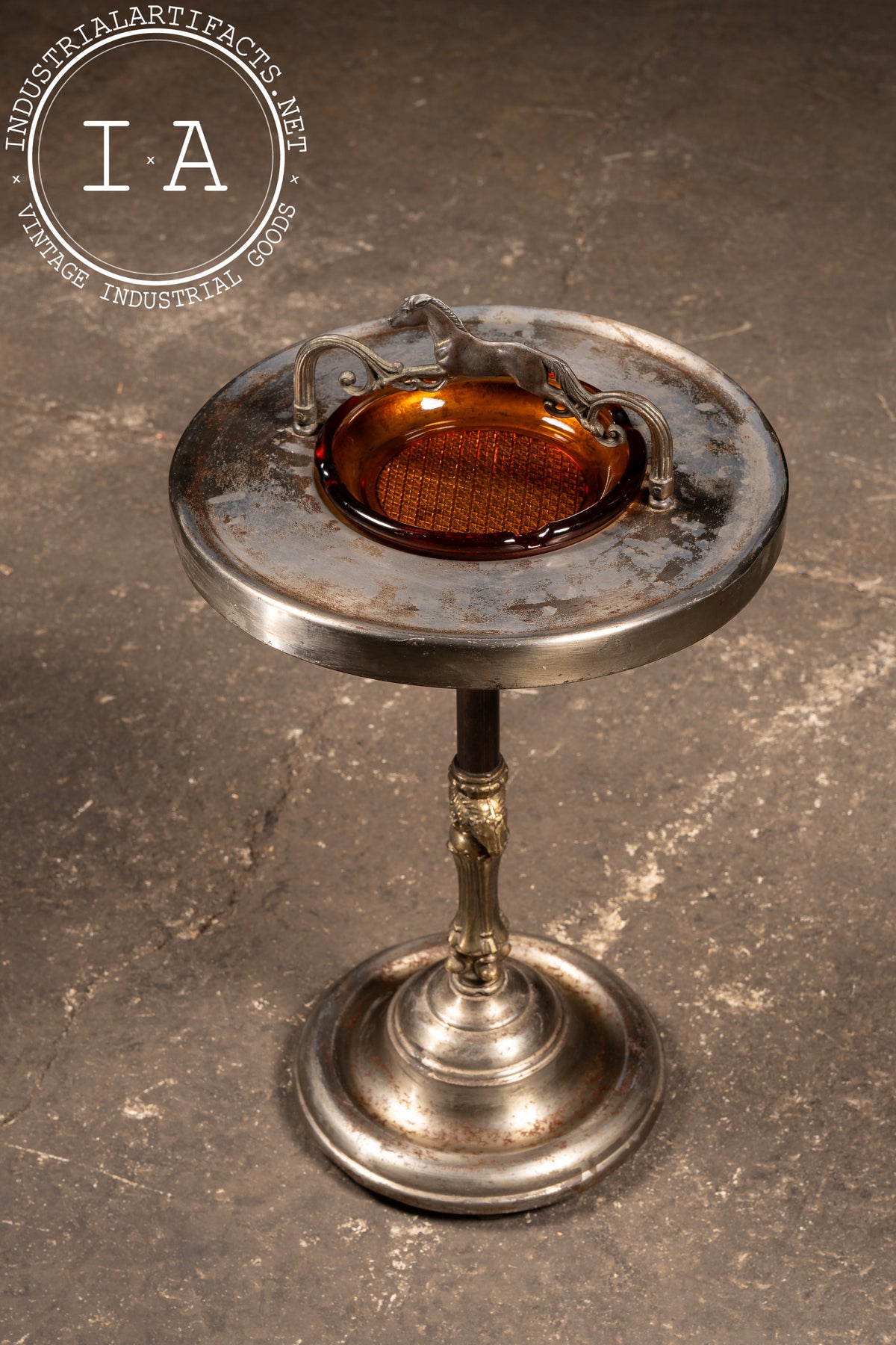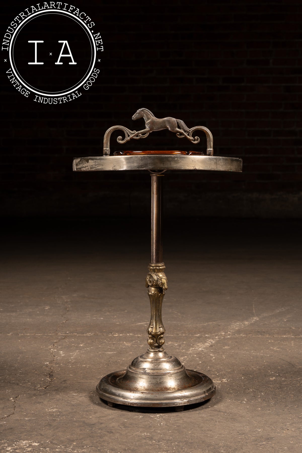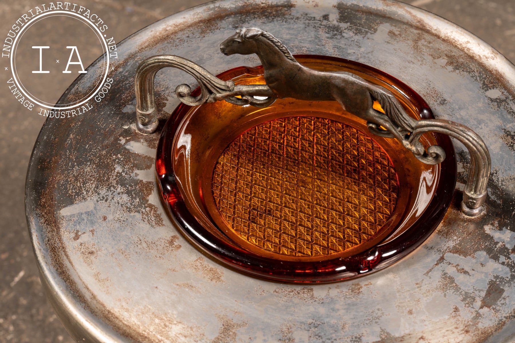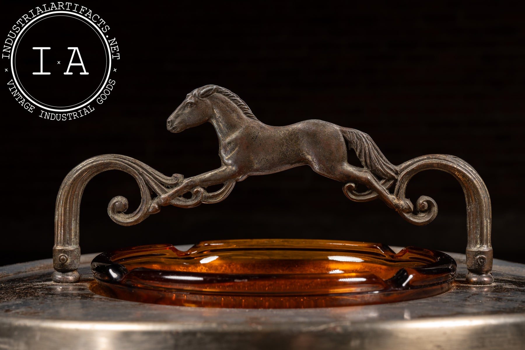 Striking metal smoking stand featuring a circular tray top fitted with a removable amber glass ash receiver, surmounted by a sculptural horse-form handle spanning two scrolling supports. The horse is modeled mid-stride, its mane and musculature crisply defined, lending the piece a dynamic, sporting character. The tray's broad rim shows honest wear and oxidation consistent with decades of use, reinforcing its utilitarian origins.