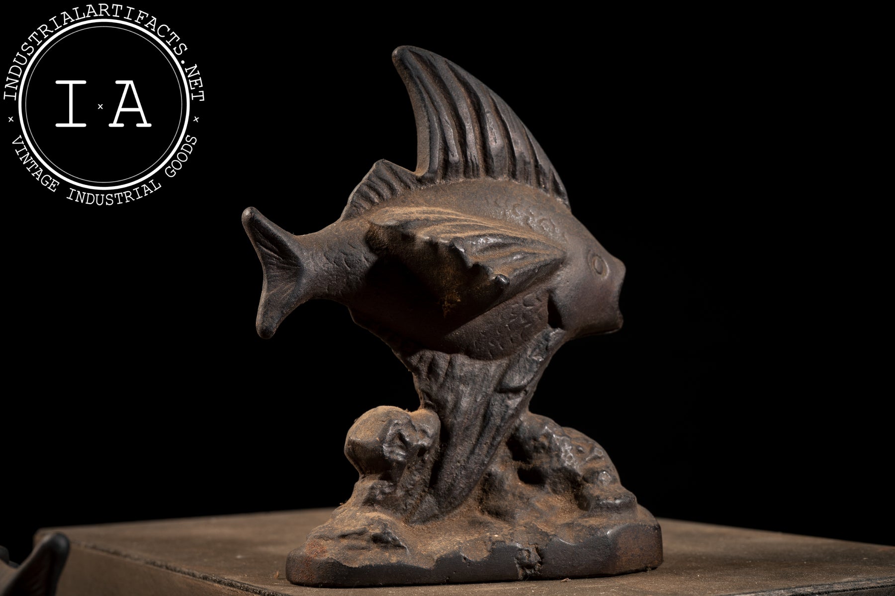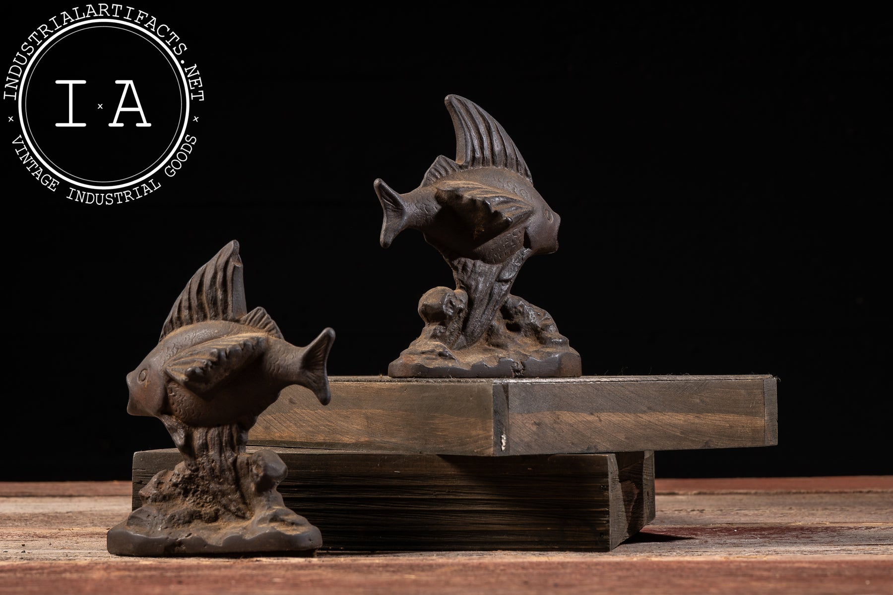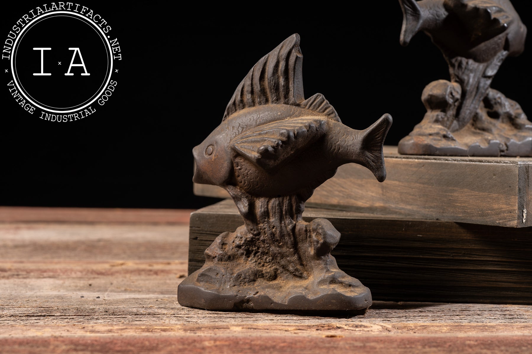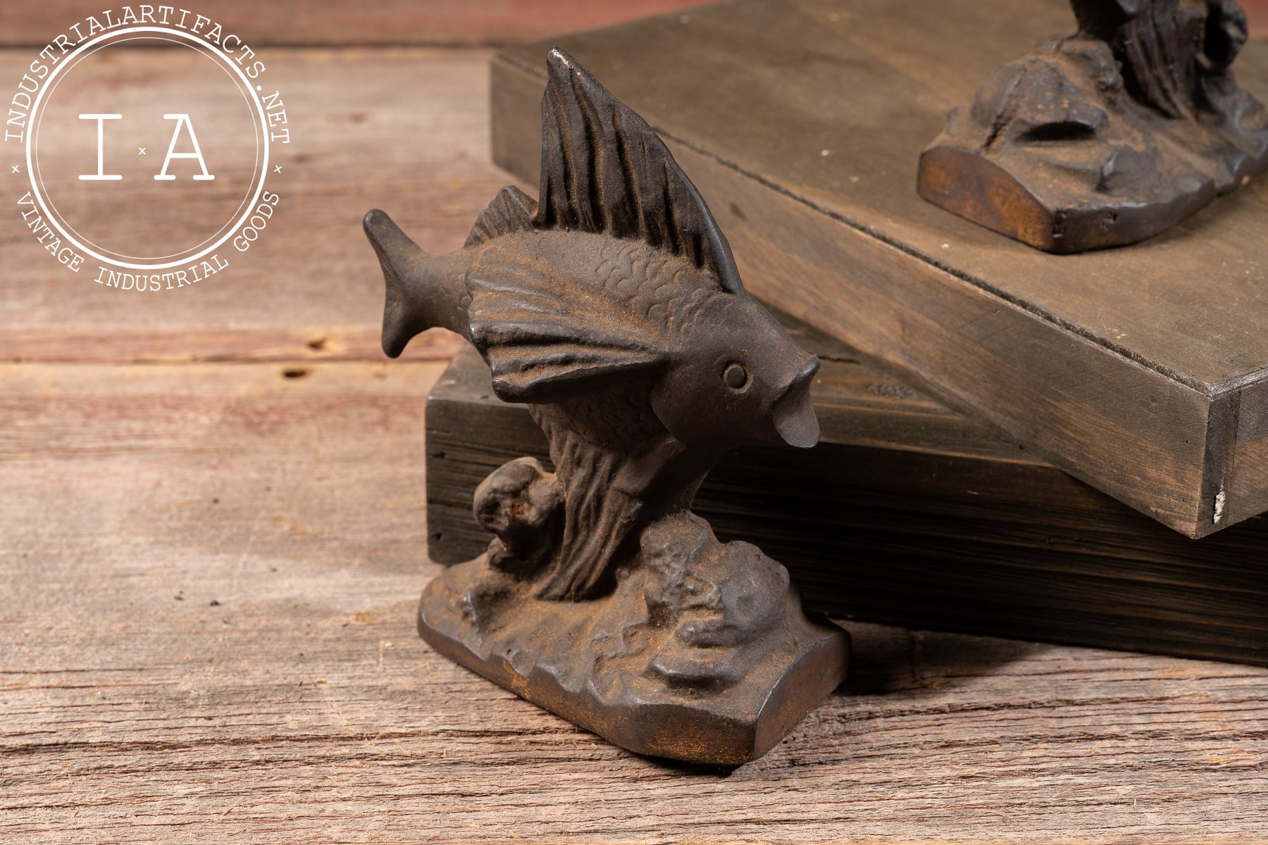 Fish-themed bookends were popular in the early 20th century, reflecting broader decorative trends that drew from nature, aquatics, and emerging Art Deco influences. Cast iron examples like this were produced to be both ornamental and durable, intended for everyday use on desks, shelves, or mantelpieces. The darkened surface and softened edges reflect decades of handling, giving the pair a warm, time-earned presence.