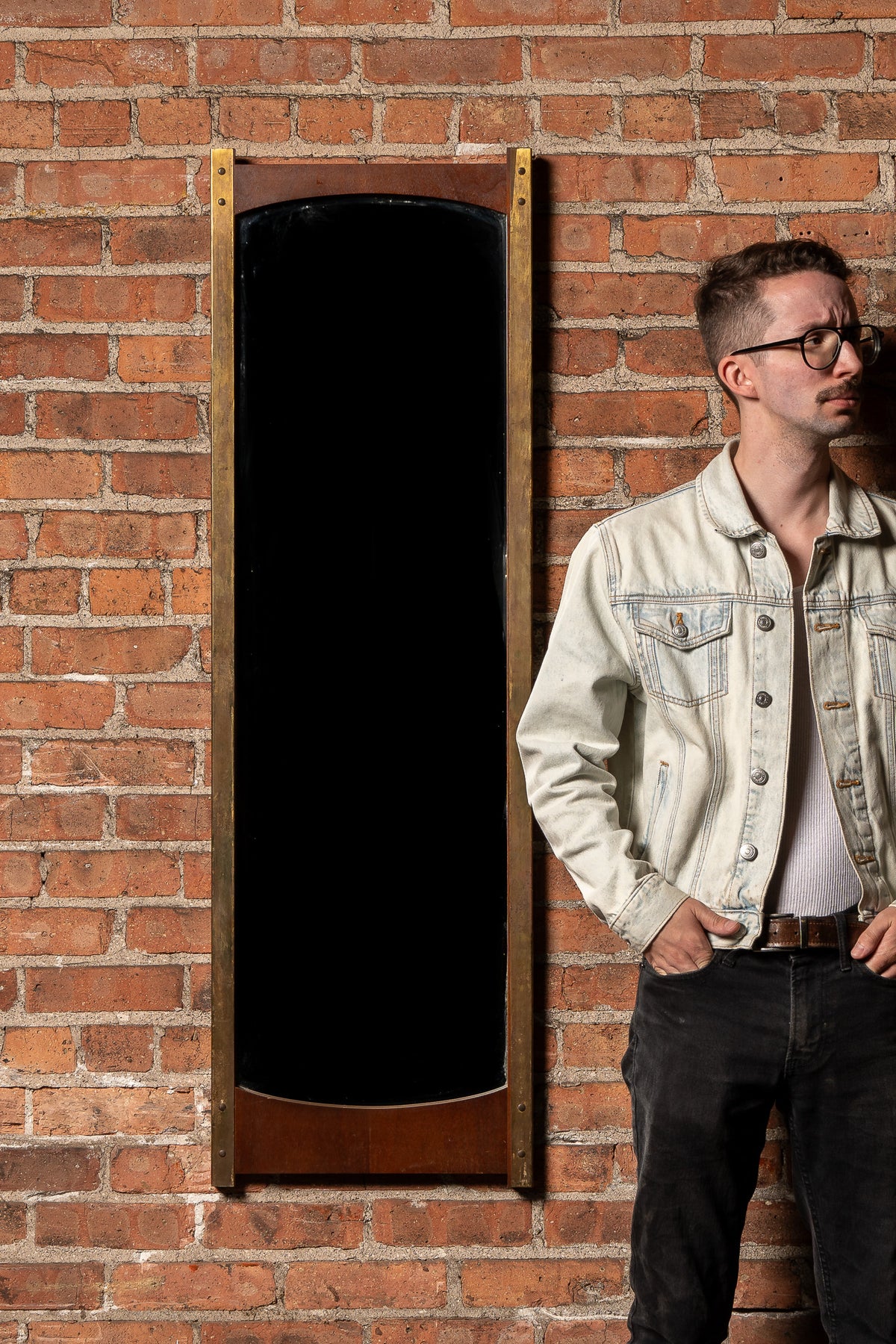 Tall rectangular mirror with brass side straps and riveted fastening, flanked by arched wood top and base elements.