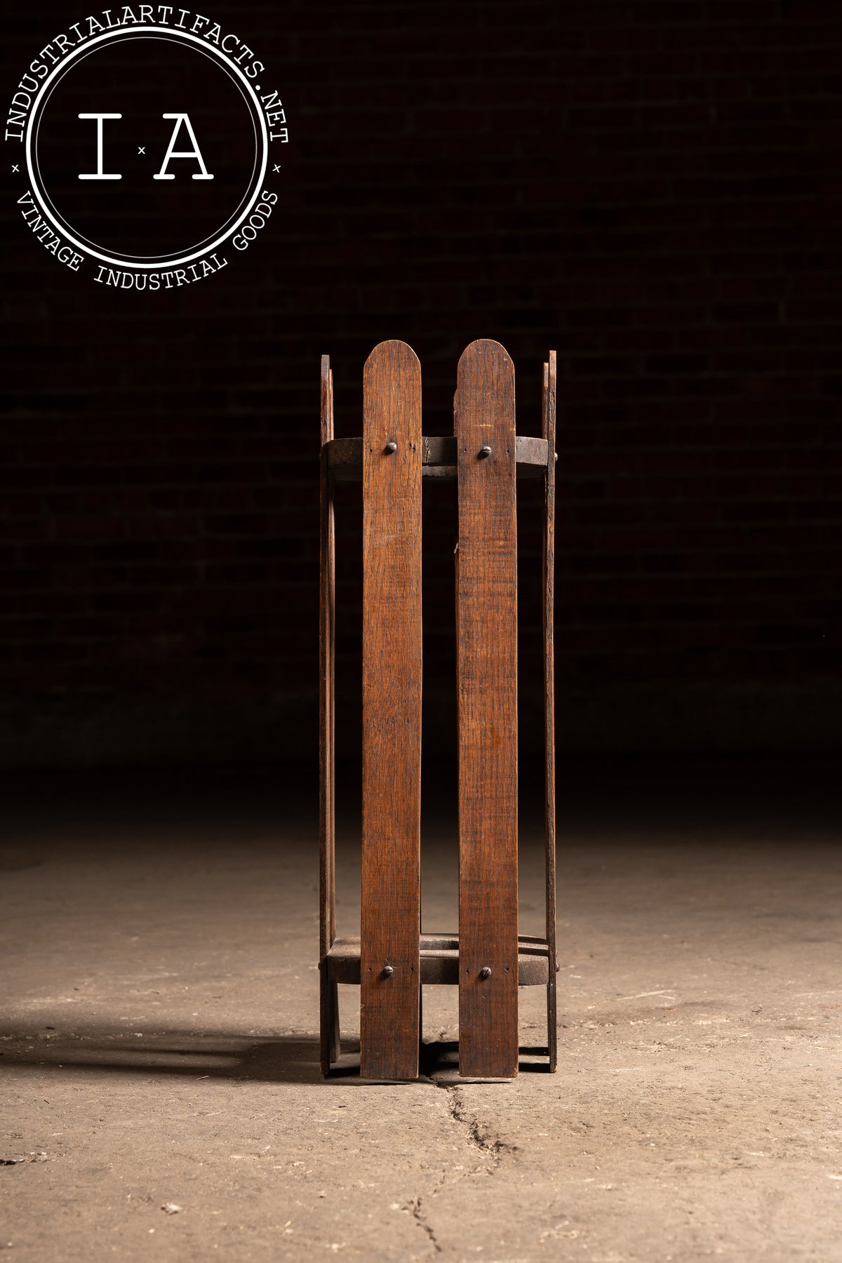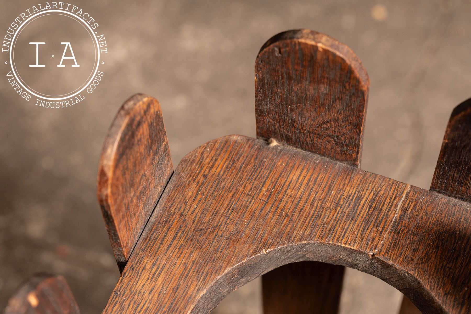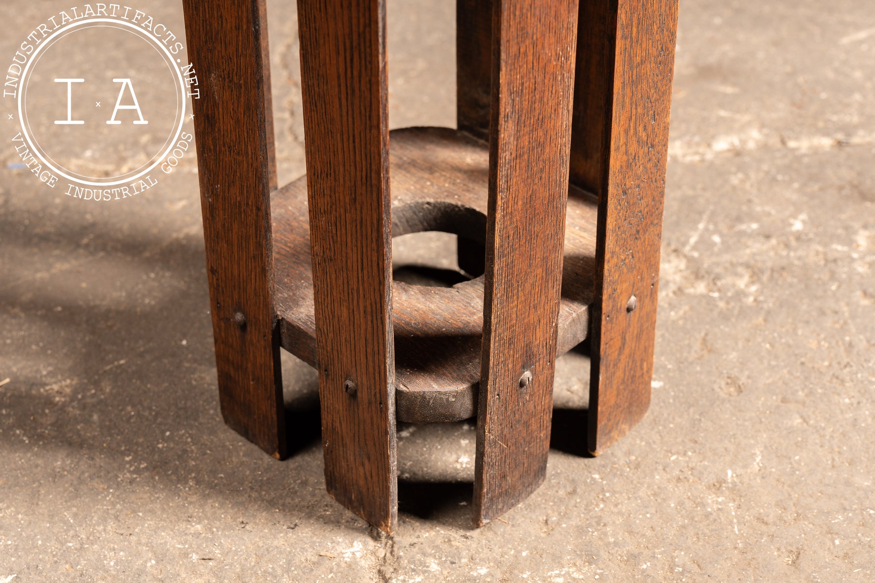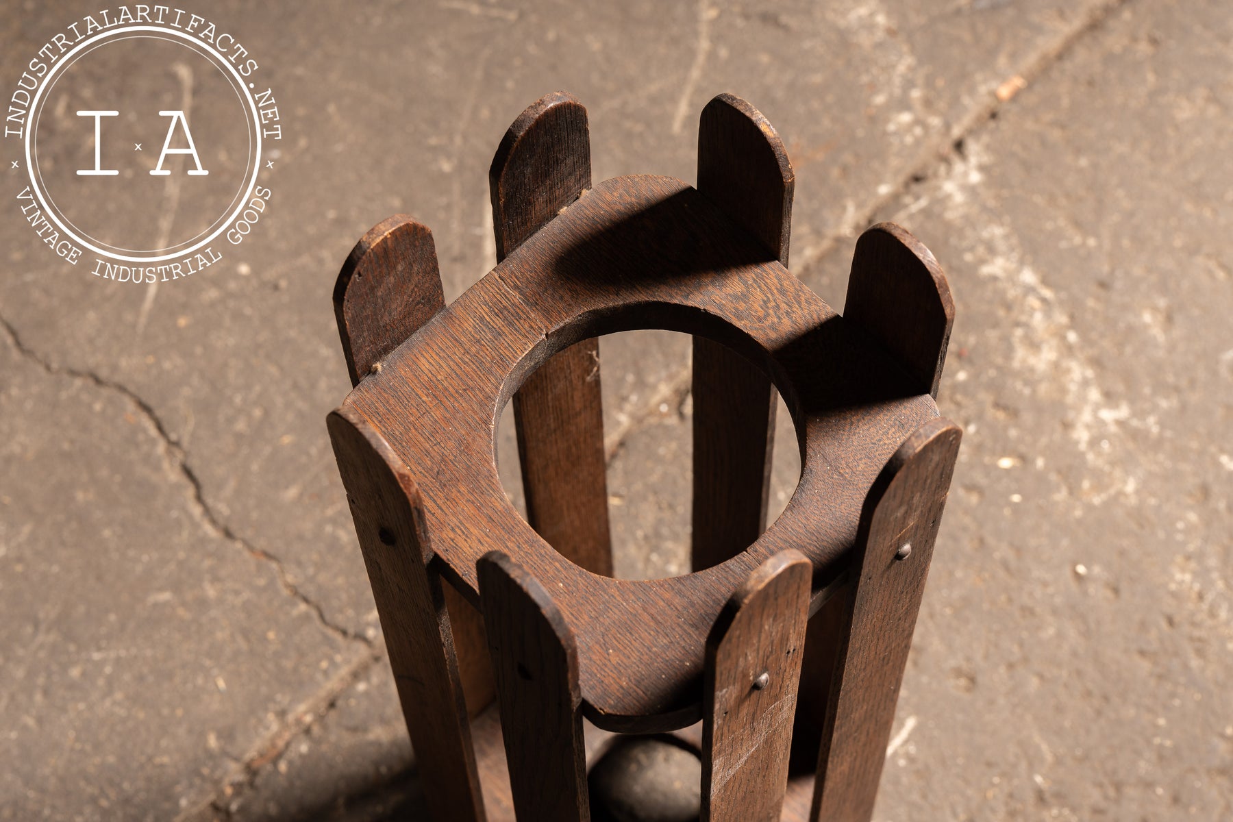 Stands of this type were commonly placed near doorways to collect wet umbrellas and canes, allowing airflow to aid drying while keeping floors clear. The solid hardwood construction and simple pegged fasteners reflect turn-of-the-century Mission/Arts & Crafts production. The proportions are compact but deliberate, with enough visual weight to read as furniture rather than an accessory.