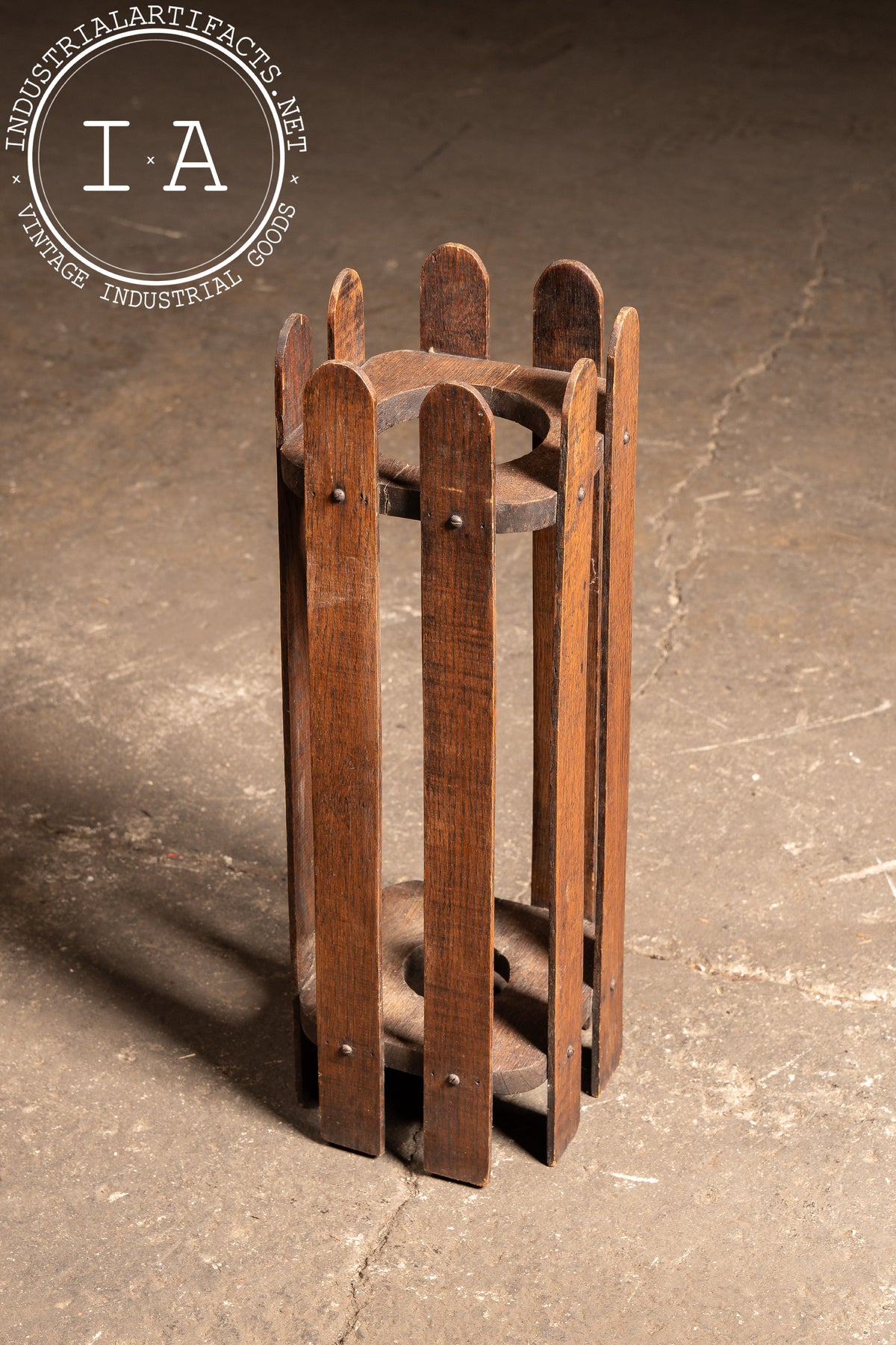 Tall, narrow wooden stand constructed in an open slat form, designed to hold umbrellas or walking sticks upright. The body is composed of vertically oriented boards with rounded tops, fastened through a circular upper collar and a matching lower ring, each pierced to accept individual shafts. The restrained geometry and exposed joinery emphasize function over ornament, giving the piece a quietly utilitarian presence well-suited to entry halls, offices, or commercial interiors of the period.