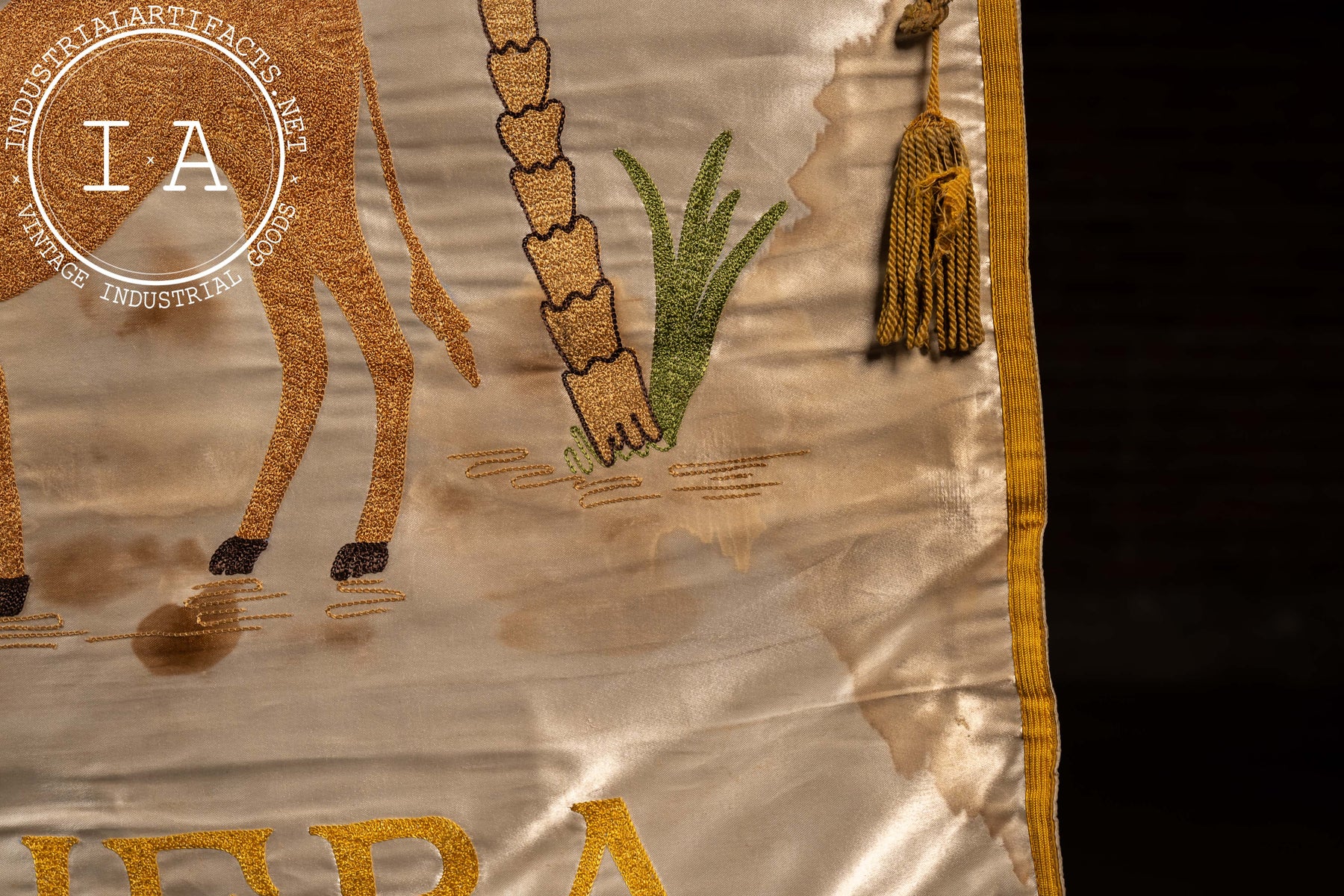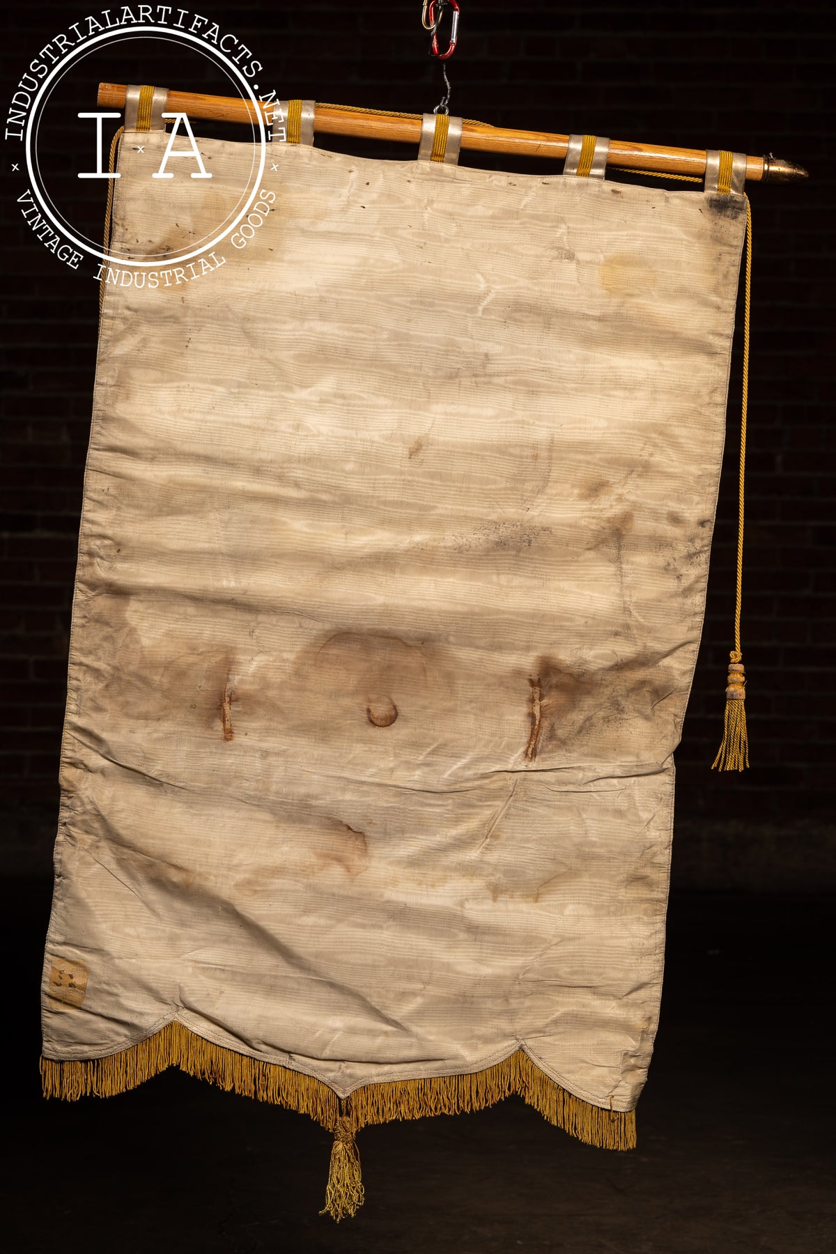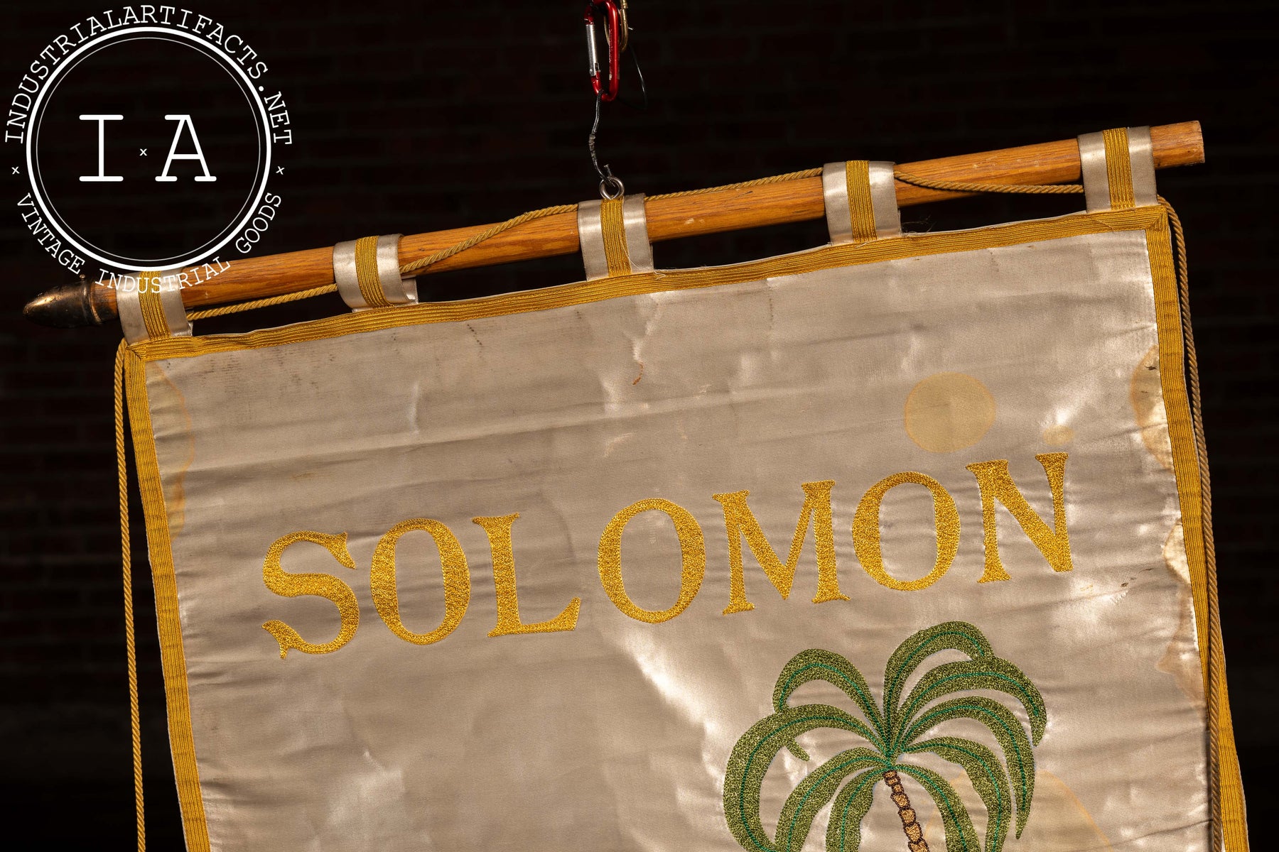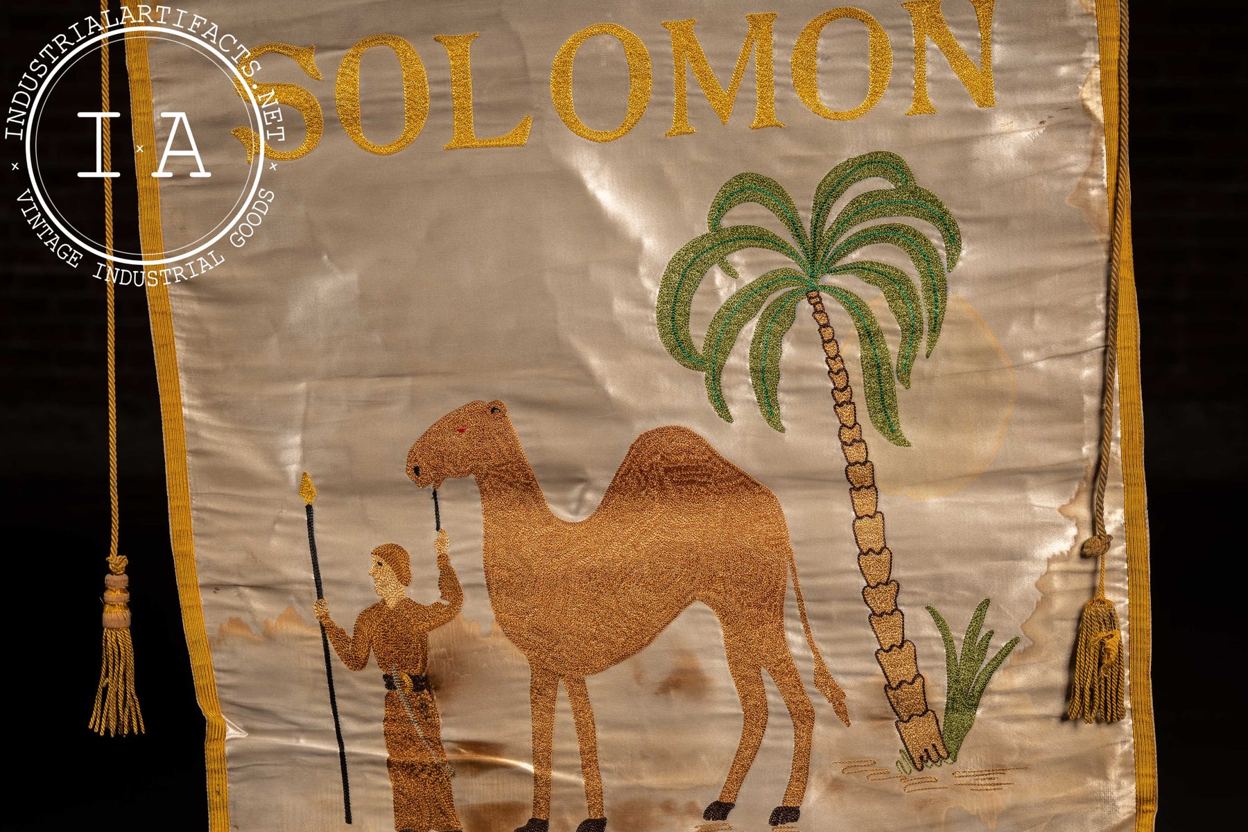 The Order of the Amaranth, an appendant Masonic body, places strong emphasis on biblical allegory and moral instruction. Silk banners depicting figures such as Solomon and Sheba were commonly commissioned for chapter rooms and ceremonial use during the late 19th and early 20th centuries, serving as symbolic teaching tools and visual focal points within lodge interiors.