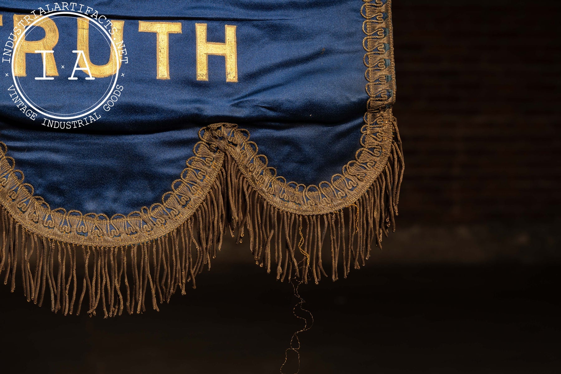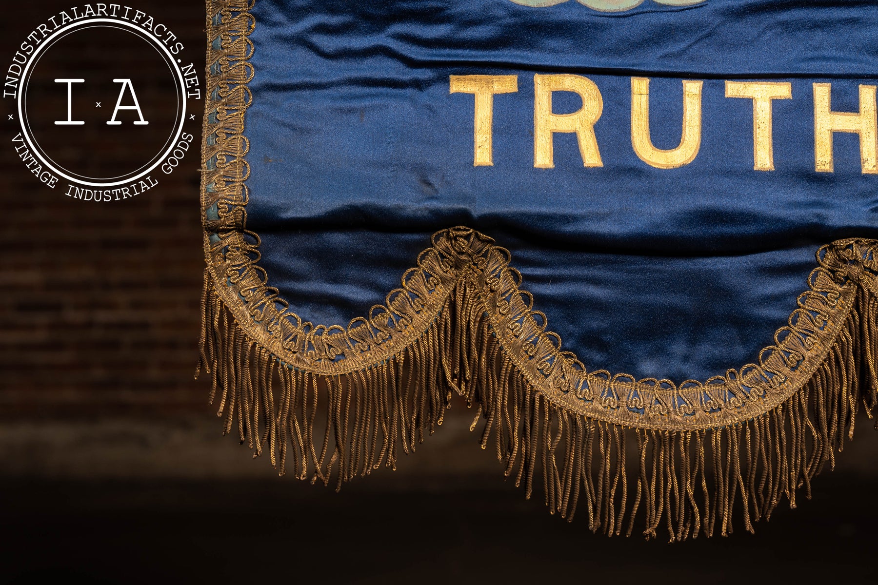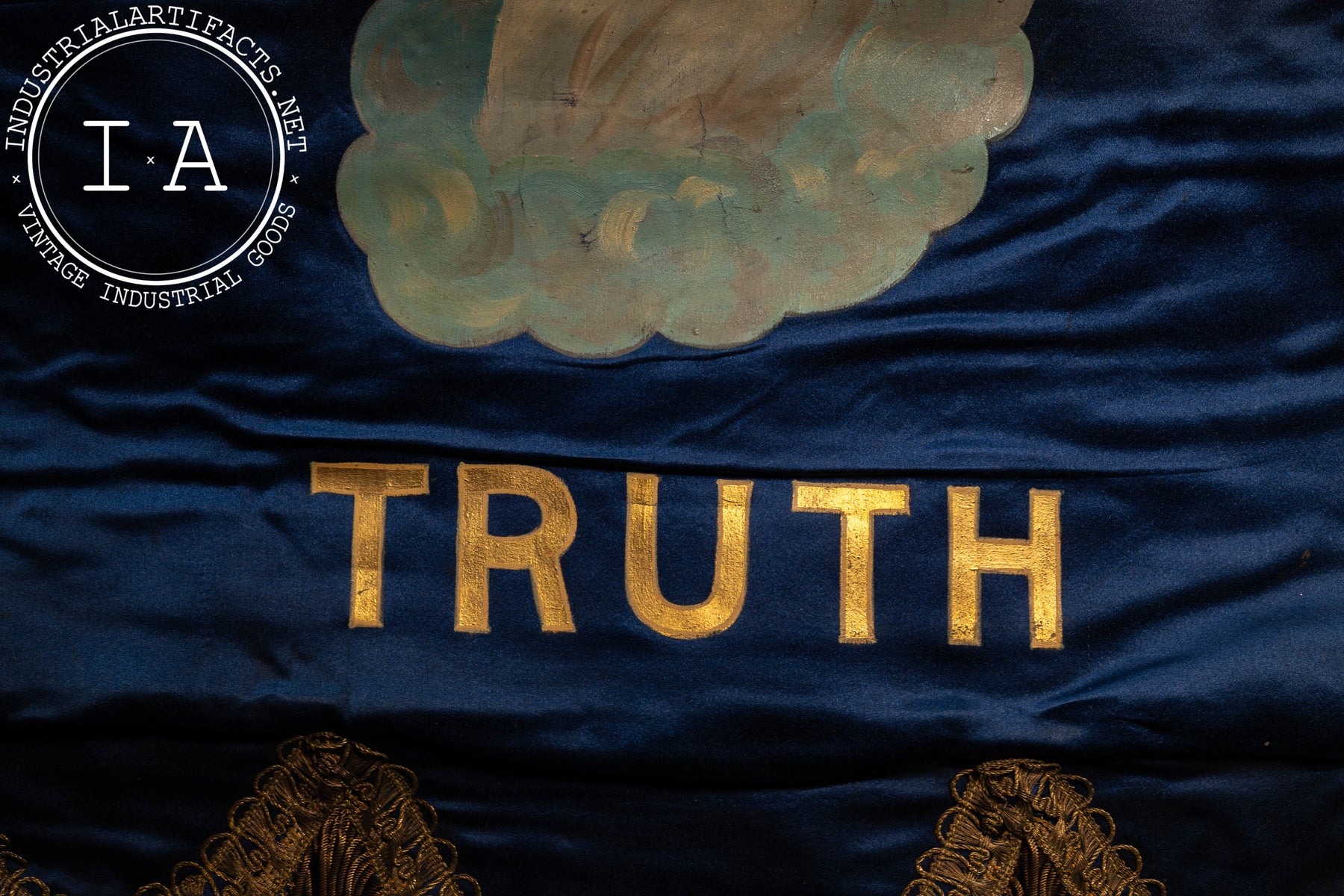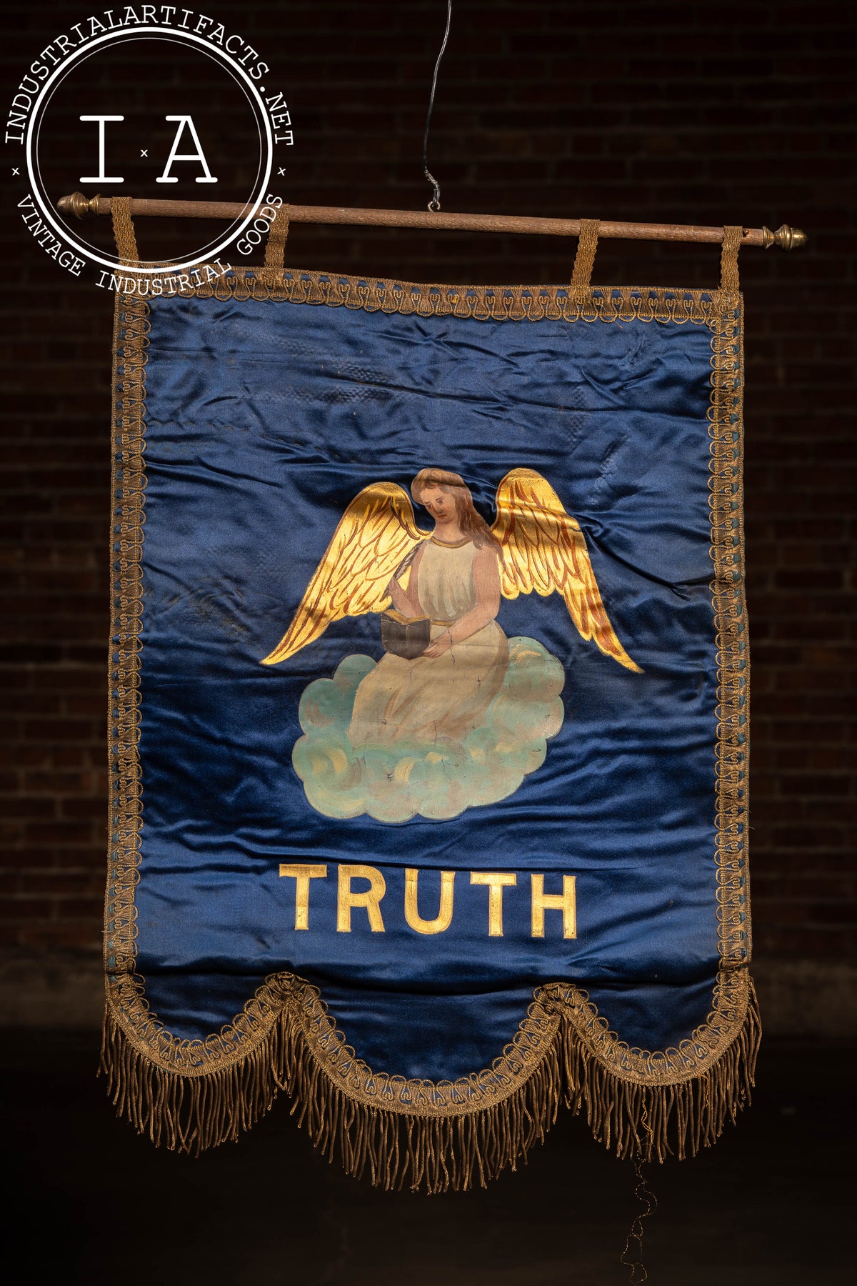 Vertical ceremonial banner constructed from deep blue silk or satin, hand-painted with an allegorical angelic figure representing Truth, seated upon clouds and rendered with gilded wings and soft polychrome detailing. The figure holds a book, a traditional symbol of knowledge, integrity, and revealed truth within fraternal iconography. The word TRUTH is boldly lettered below in gold. The banner is framed by ornate metallic braid, finished with a scalloped lower edge and dense gold bullion fringe. Mounted to a wooden dowel with fabric suspension loops, the banner was intended for wall display within a chapter room or ceremonial hall, forming part of a larger symbolic program emphasizing the core virtues of the Order.