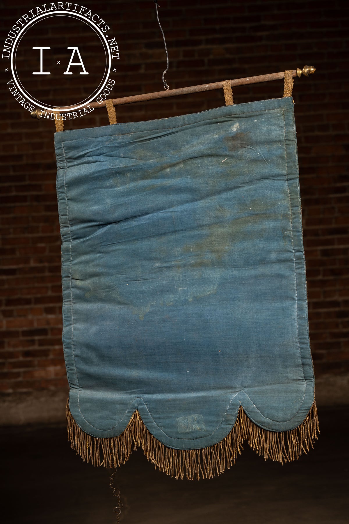 Shows staining, fabric discoloration, creasing, and areas of damage to the textile on both sides consistent with age and long-term display or storage; metallic trim and fringe remain largely intact despite wear.