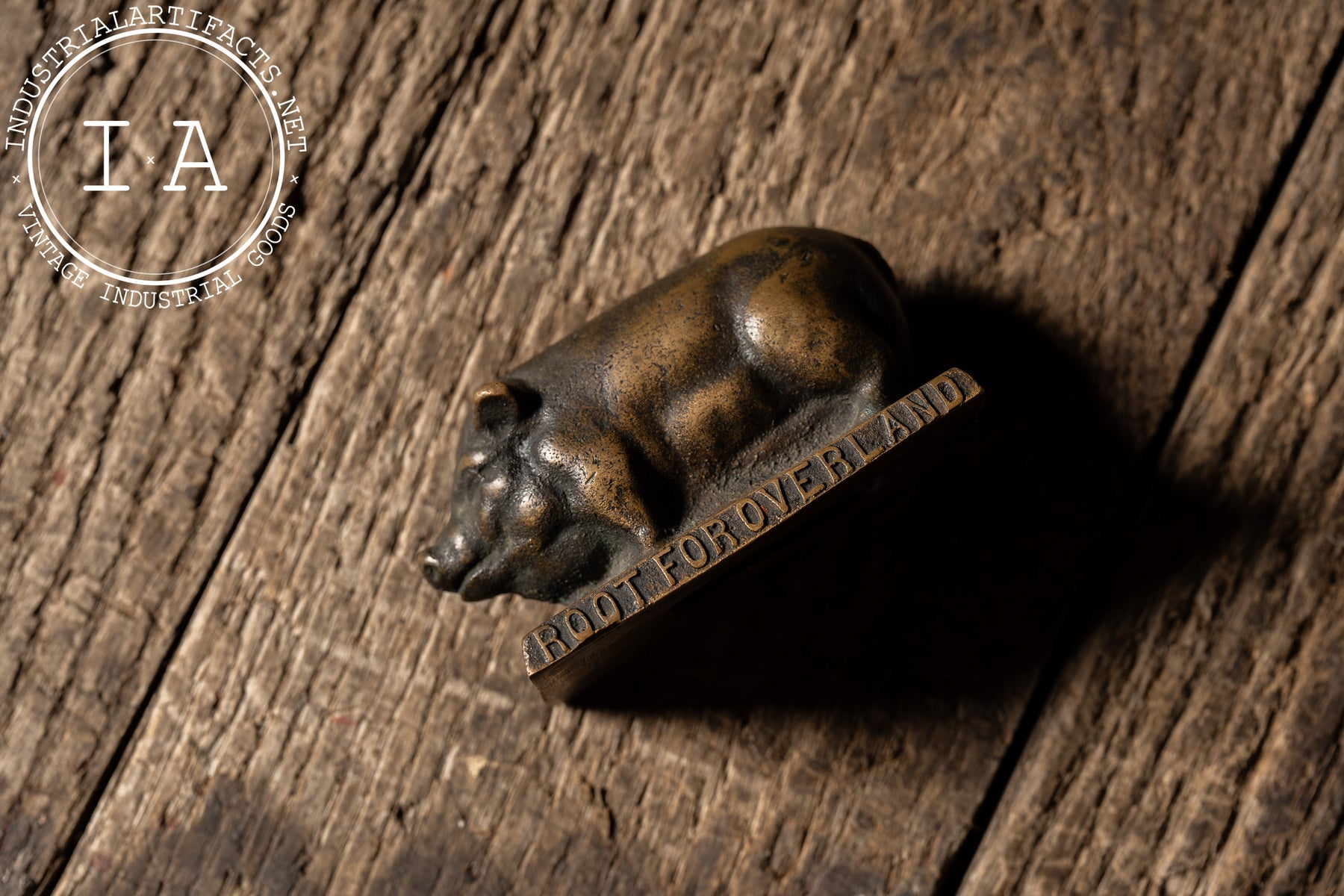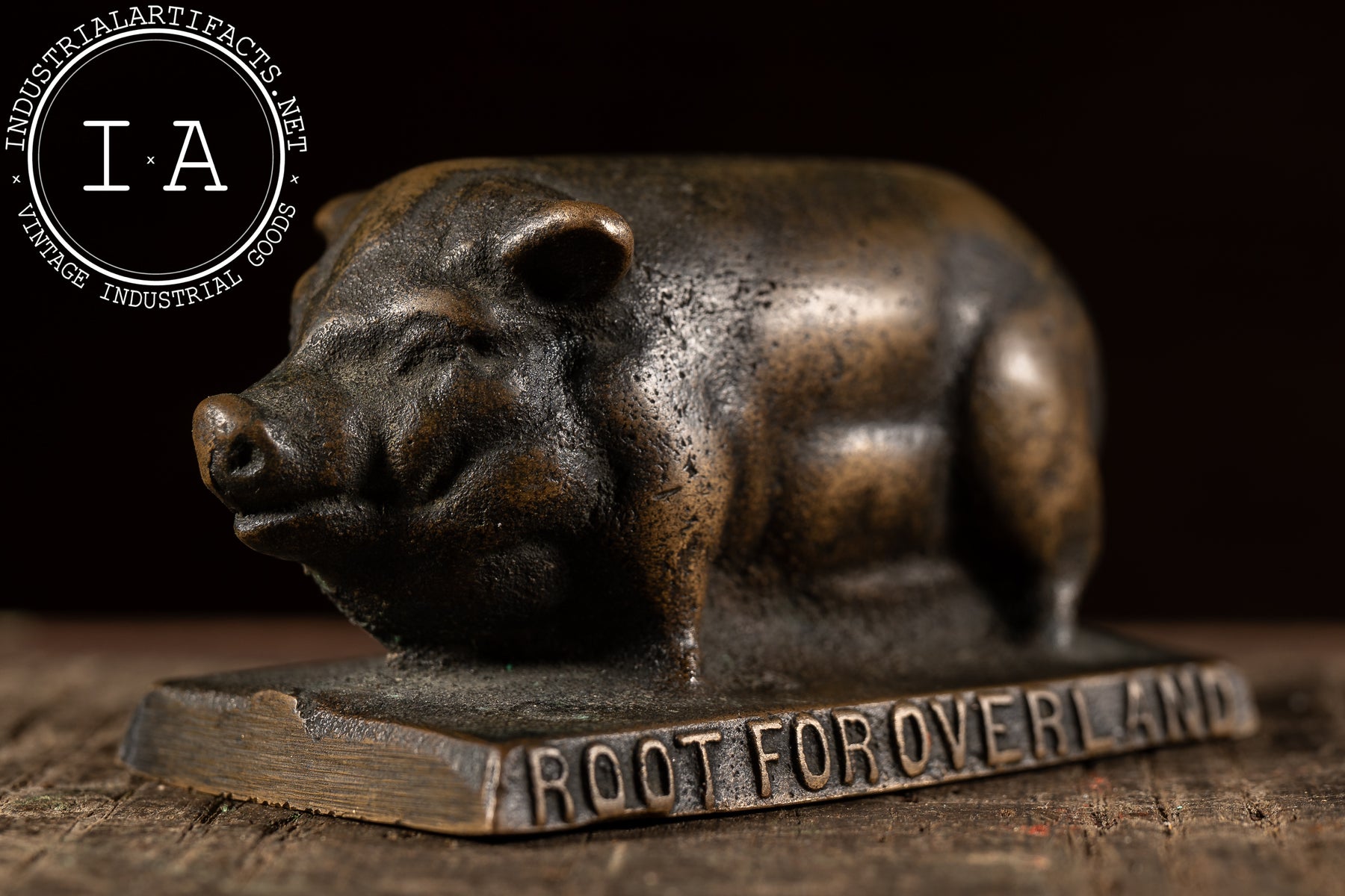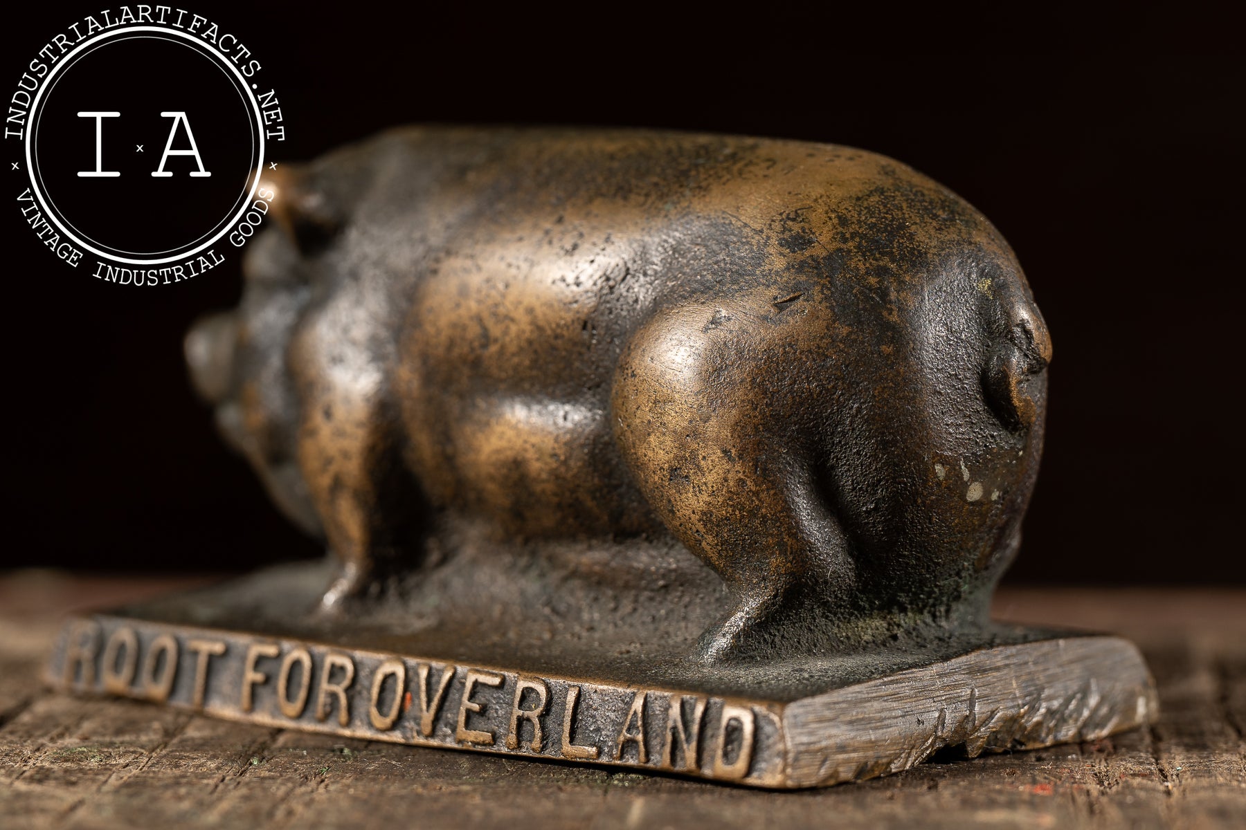 Heavy cast bronze figural paperweight modeled as a rooting hog, with raised lettering reading "ROOT FOR OVERLAND" and "OVERLAND ROOTER" along the base-an early dealership and promotional mascot used by the Willys-Overland Company, makers of the famed Overland and later Whippet automobiles.
