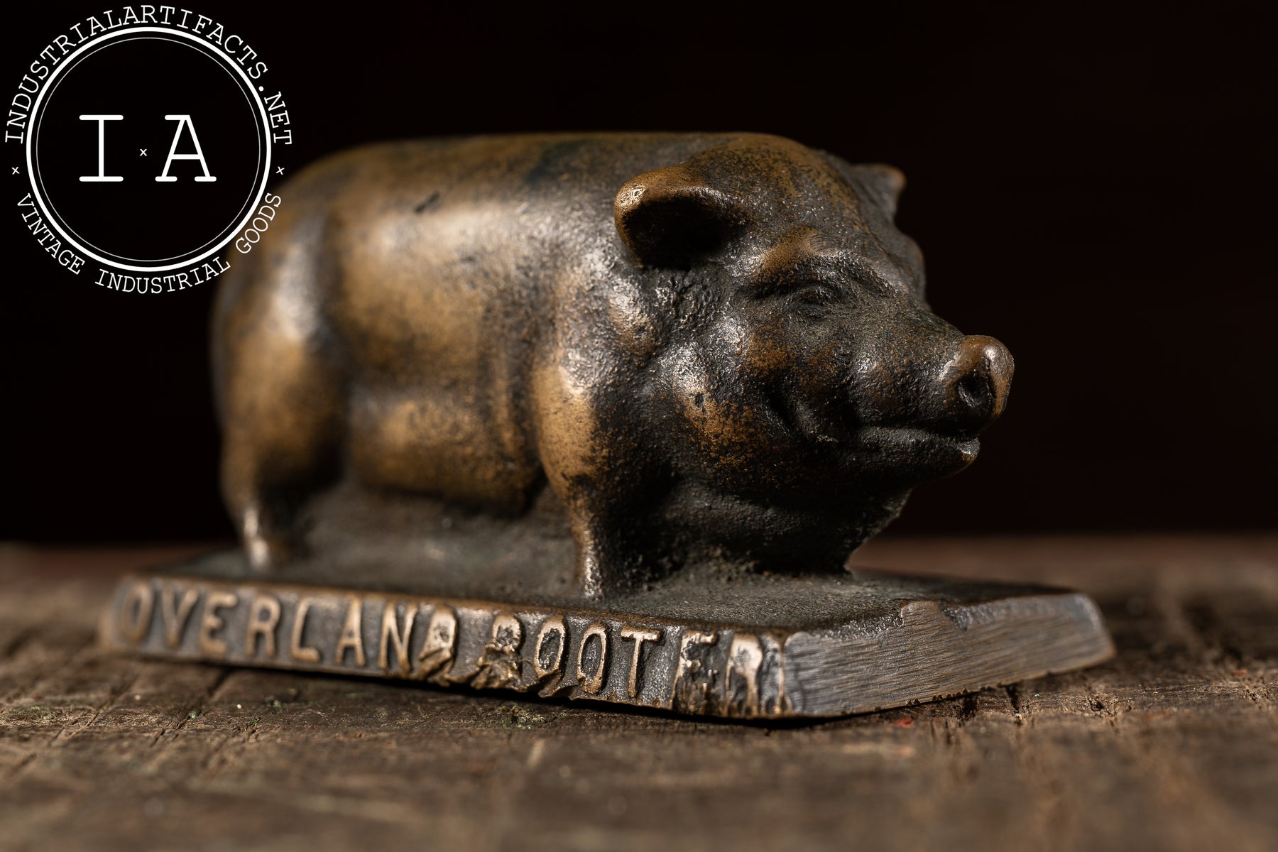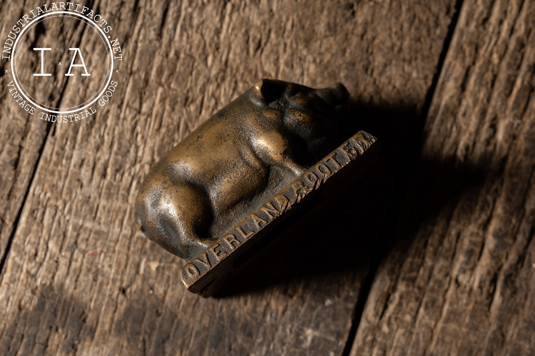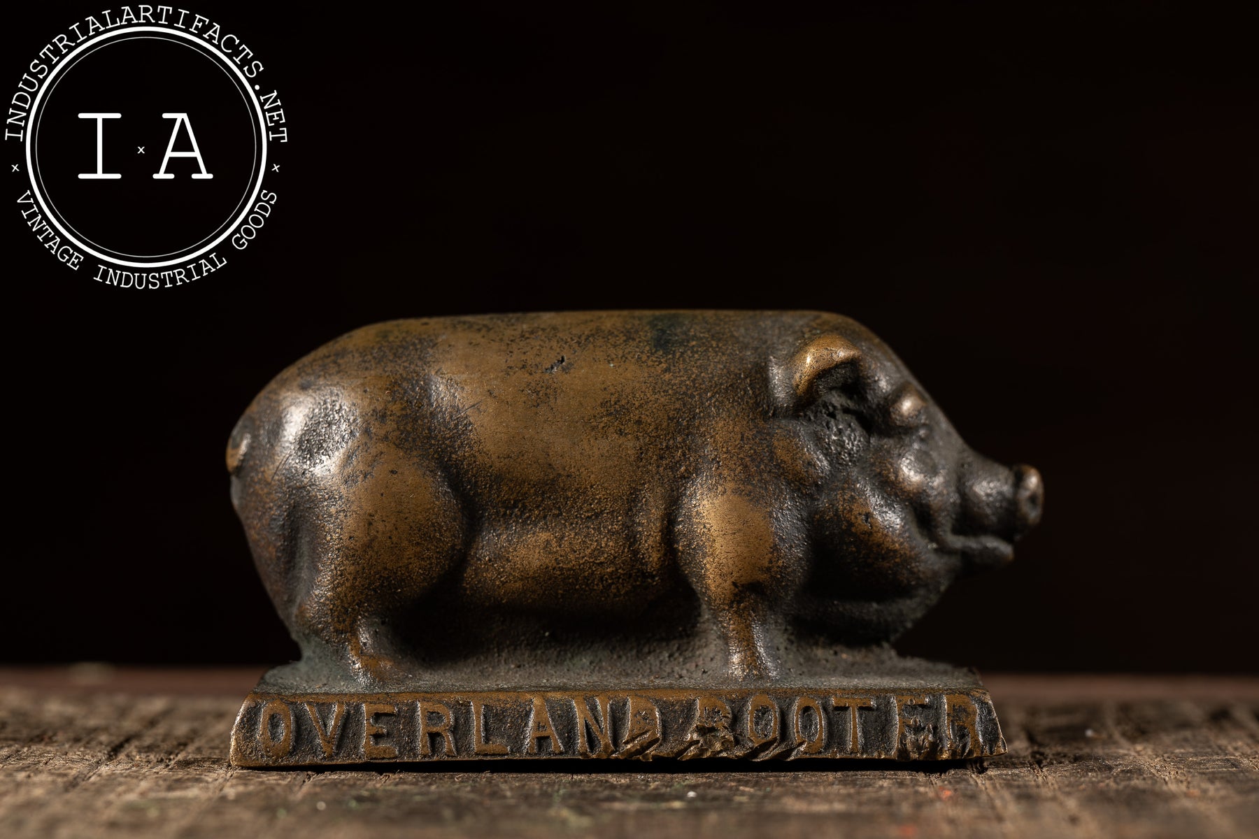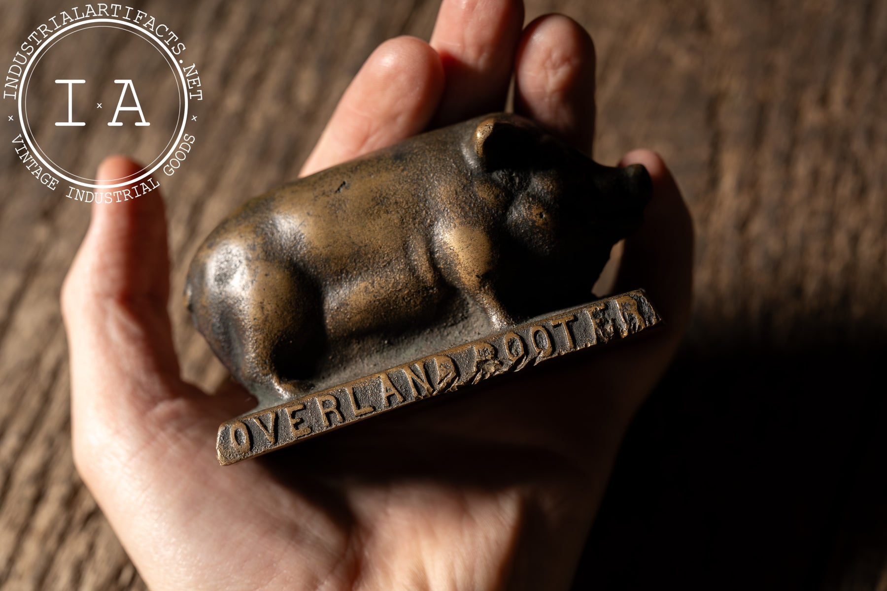 Heavy cast bronze figural paperweight modeled as a rooting hog, with raised lettering reading "ROOT FOR OVERLAND" and "OVERLAND ROOTER" along the base-an early dealership and promotional mascot used by the Willys-Overland Company, makers of the famed Overland and later Whippet automobiles.