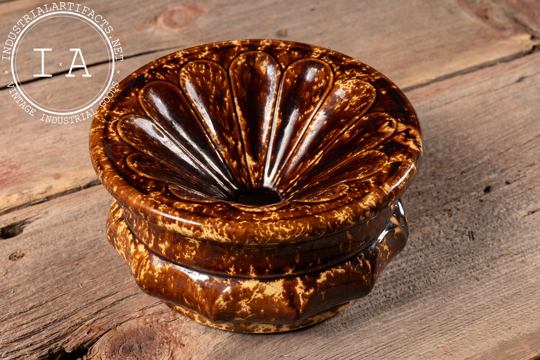Rockingham-glazed ceramic spittoon featuring a low, wide form with a scalloped body and integral splash guard. Finished in a mottled brown-over-cream glaze characteristic of Rockingham ware, the surface shows heavy, expressive spotting and pooling created during the firing process. The interior basin includes a central opening, designed to reduce splash and aid in cleaning, while the broad base provides stability for floor use.