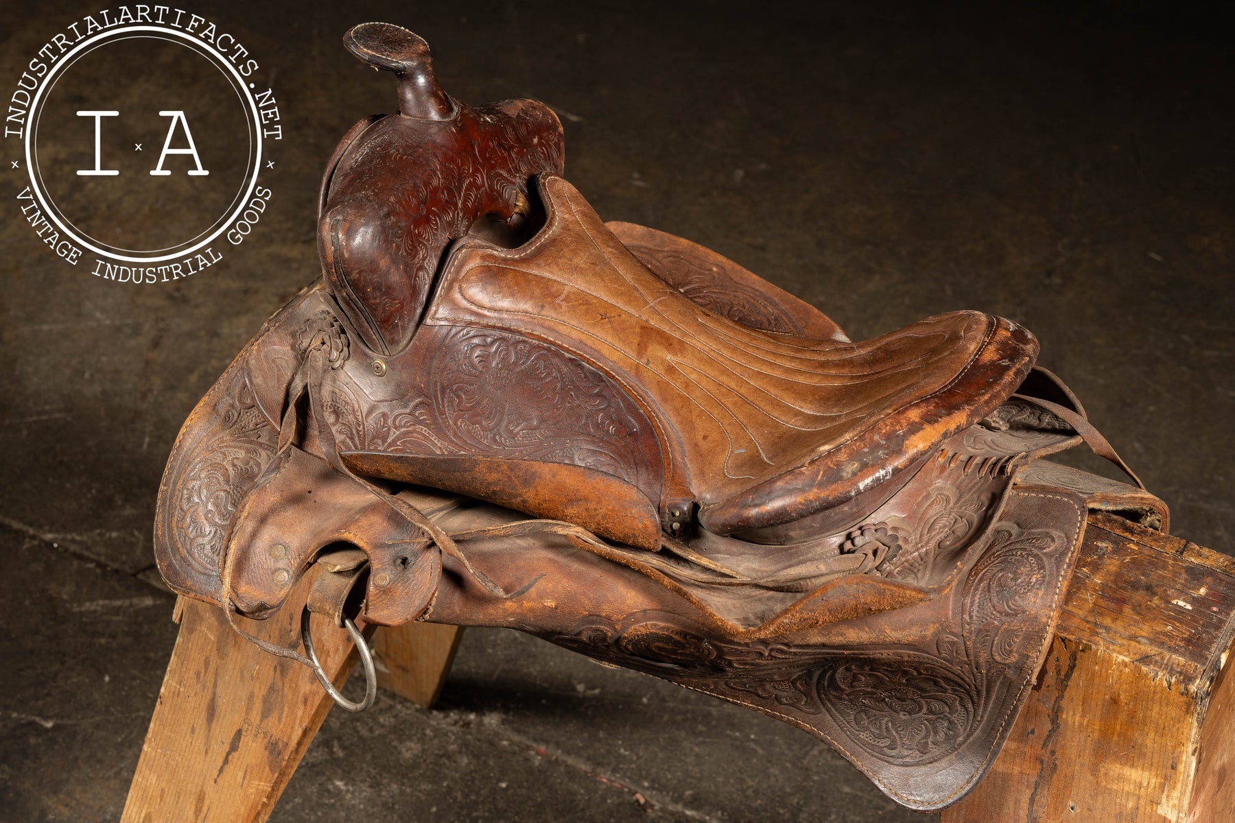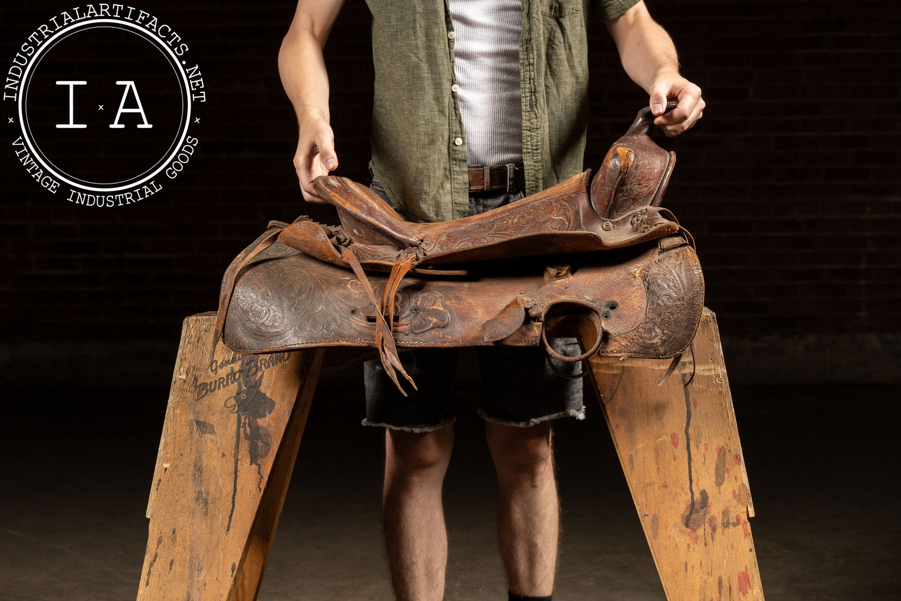 Likely produced by the Bona Allen Company-founded in 1873 and widely regarded as one of the premier American saddle makers of the early 20th century-this piece carries the heritage of a brand whose saddles were favored by working ranchers and even featured in Hollywood Westerns. Its rugged construction, decorative floral tooling, and aged leatherwork represent both utility and artistry.