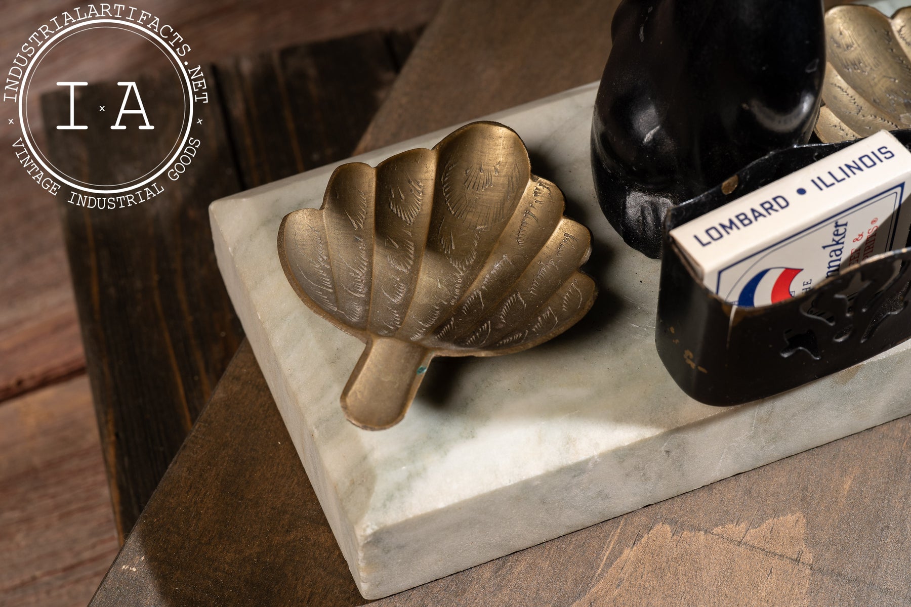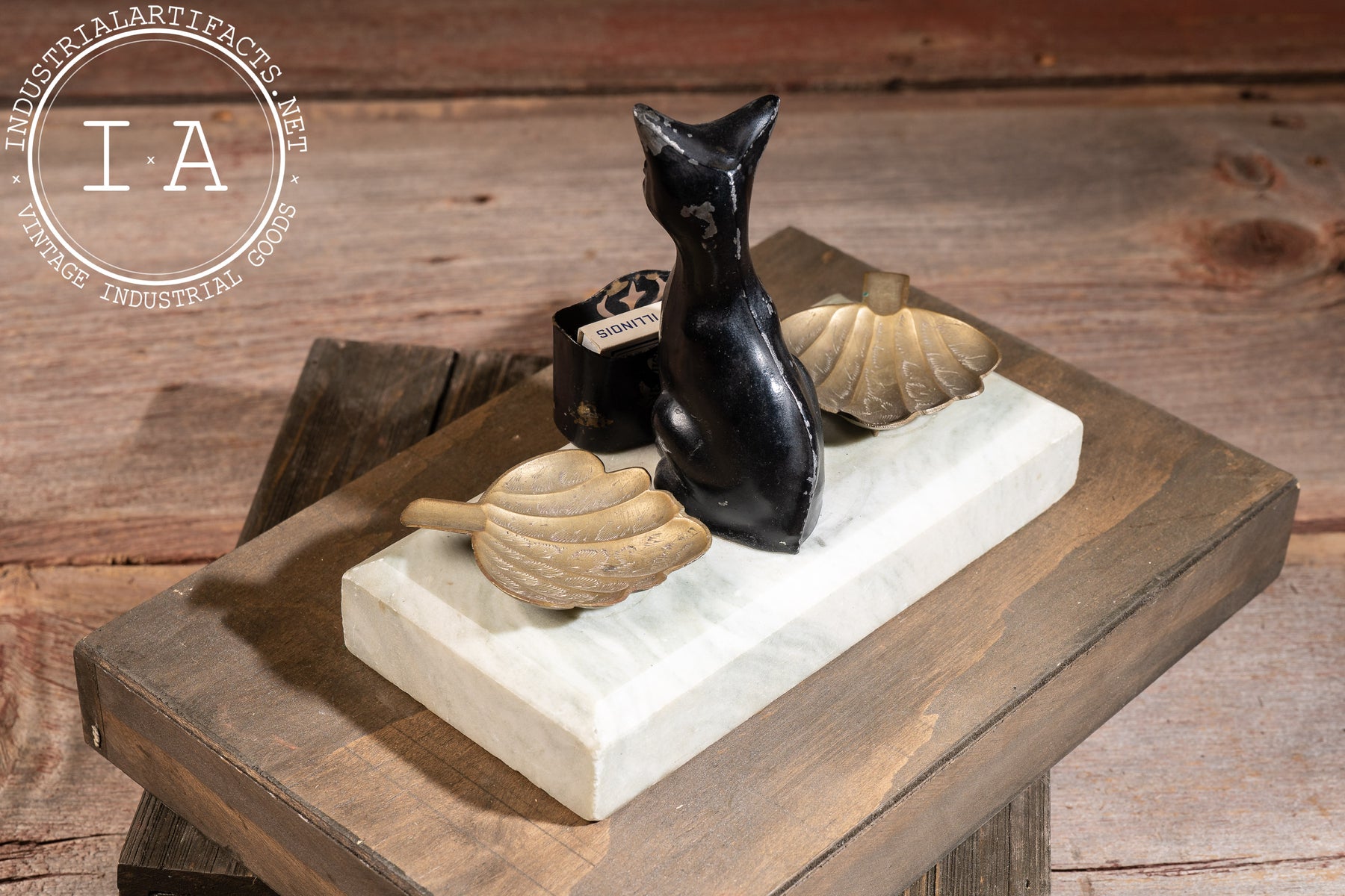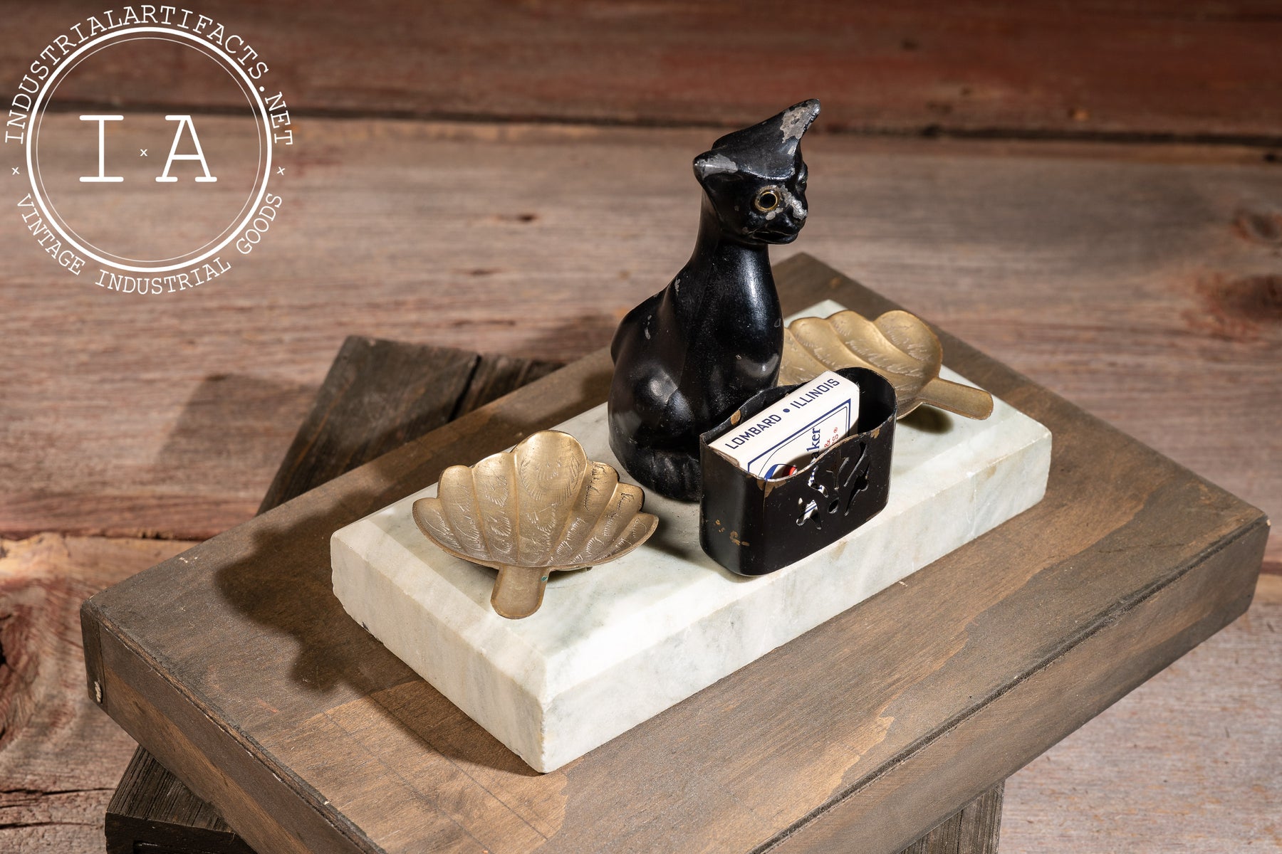 Figural tabletop smoking stand featuring a stylized black cat rendered in a glossy black finish, mounted atop a rectangular stone base and flanked by two shell-form metal trays. The cat's exaggerated expression-complete with asymmetrical eyes and an elongated neck-reflects the playful, slightly mischievous character common to novelty objects produced during the interwar and postwar years, when figural design leaned toward humor, charm, and a touch of the uncanny.