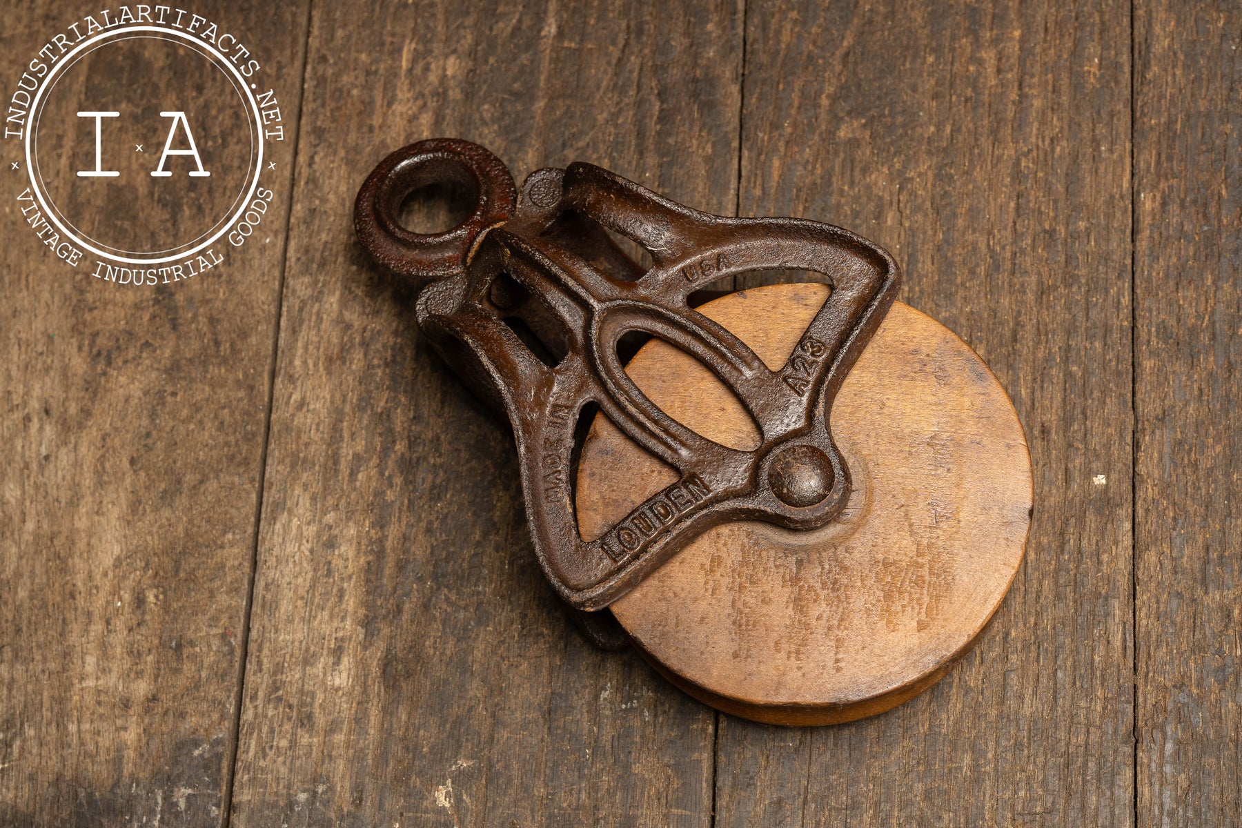 Cast-iron and wood barn pulley marked "Louden" and model "A23." This rugged utility device reflects Louden's legacy in revolutionizing farm productivity with their hay-carrier systems and industrial monorail equipment.