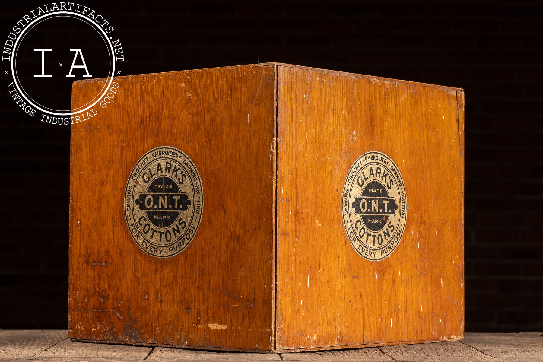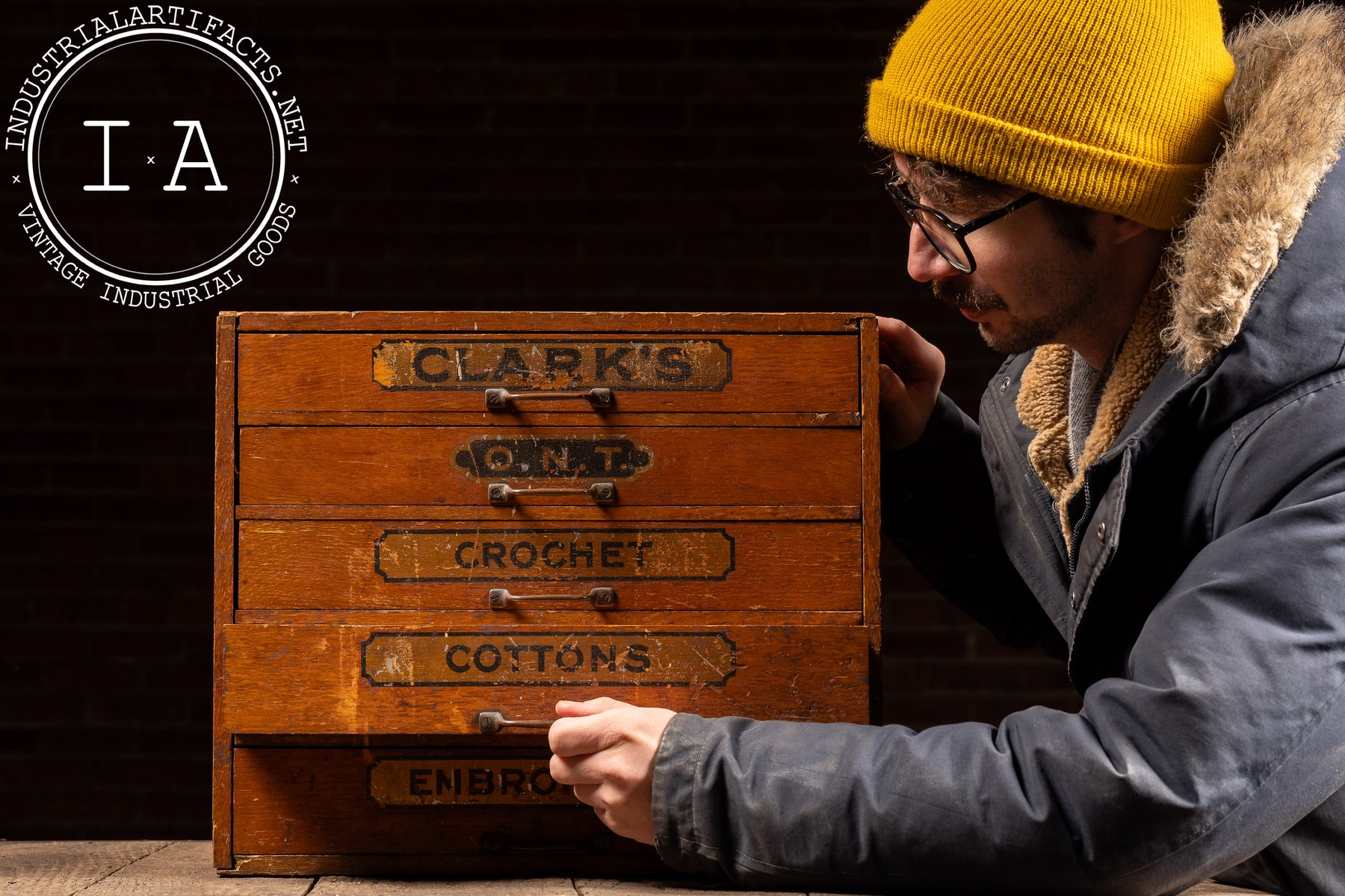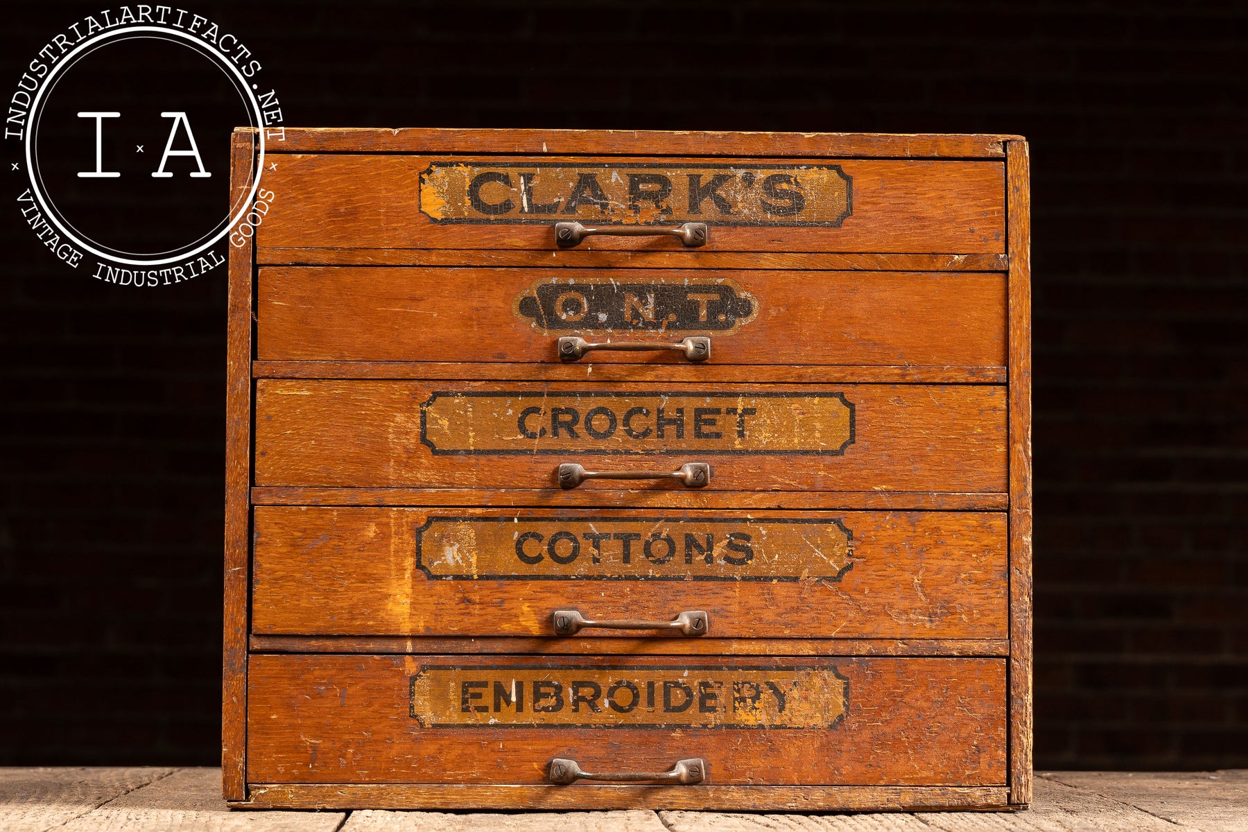 Compact countertop or store-cabinet drawer unit produced for retail display and storage of Clark's O.N.T. cotton thread and related sewing supplies. Constructed in hardwood with a warm, honeyed finish, the cabinet features five shallow drawers with original metal pulls and boldly stenciled labels reading CLARK'S, O.N.T., CROCHET, COTTONS, and EMBROIDERY. Both side panels retain the original circular Clark's O.N.T. paper labels, advertising the brand's use across sewing, crochet, embroidery, darning, and knitting. Drawer interiors are clean and unlined, consistent with light mercantile use.