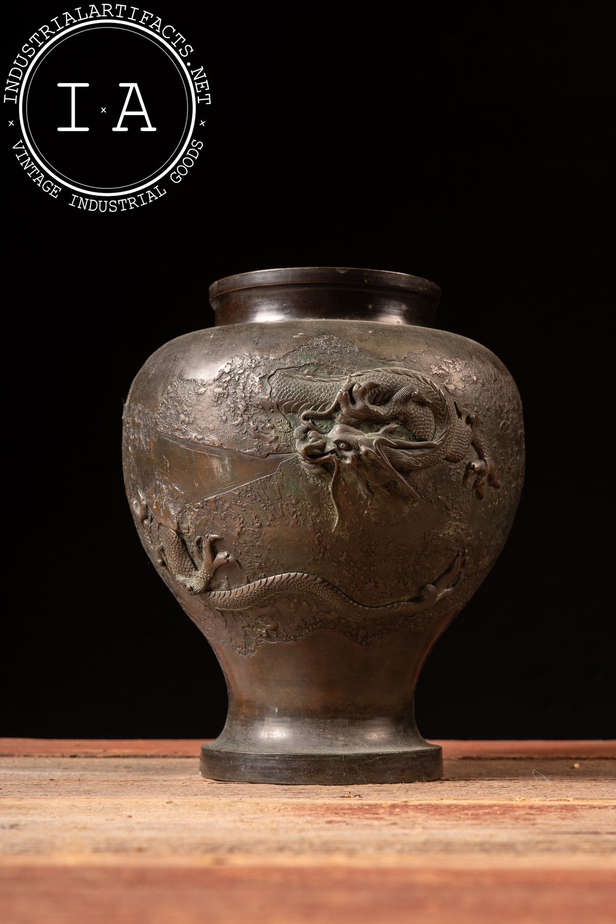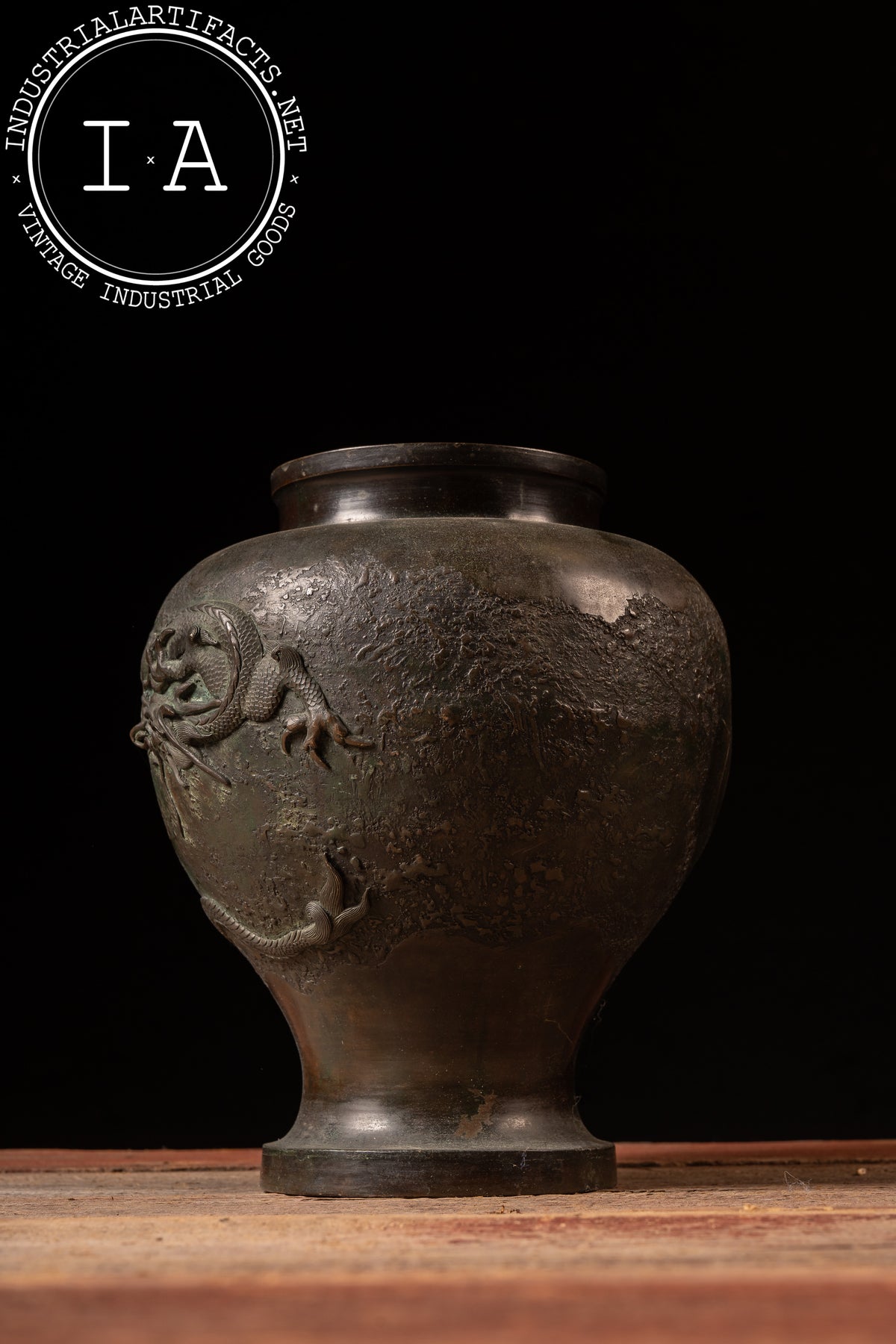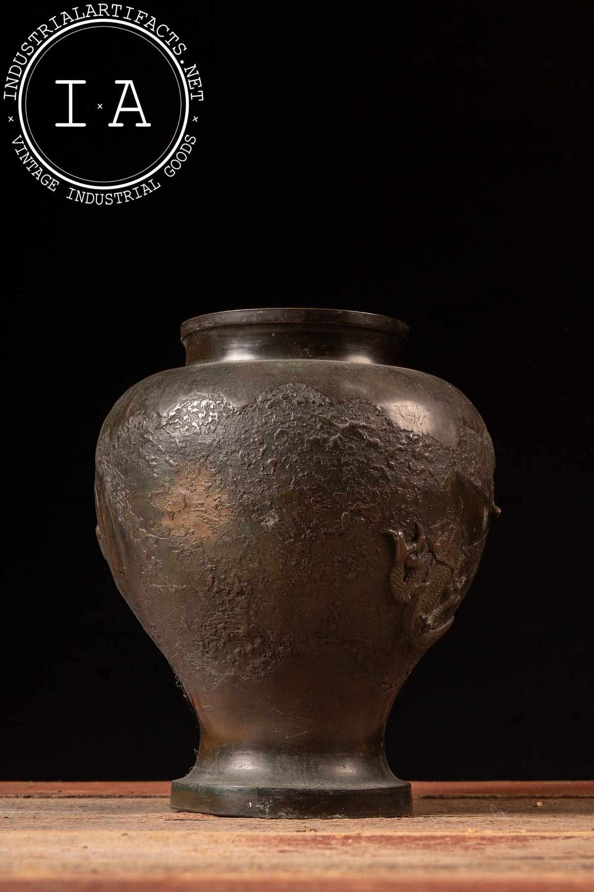 Cast bronze vase with high-relief dragon decoration encircling the shoulder, set against a deliberately textured ground and finished with a dark, time-softened patina. The form is classically baluster-shaped, rising from a flared foot to a wide, open mouth with a subtly rolled rim.