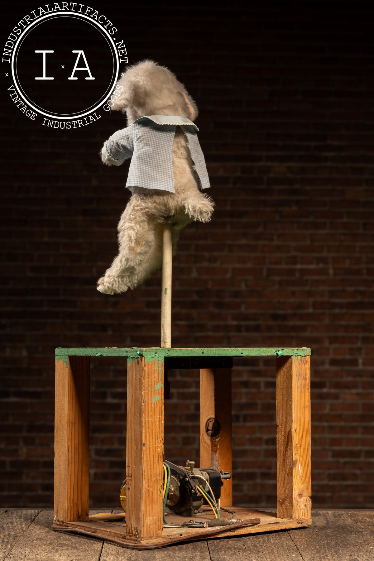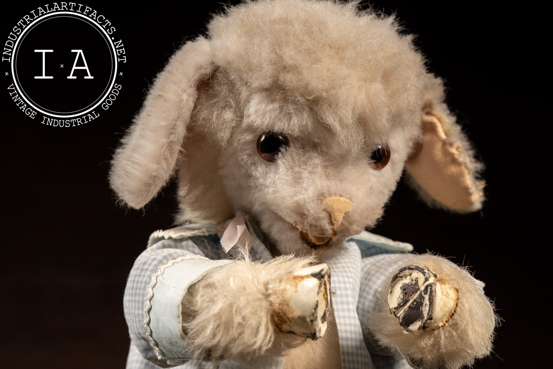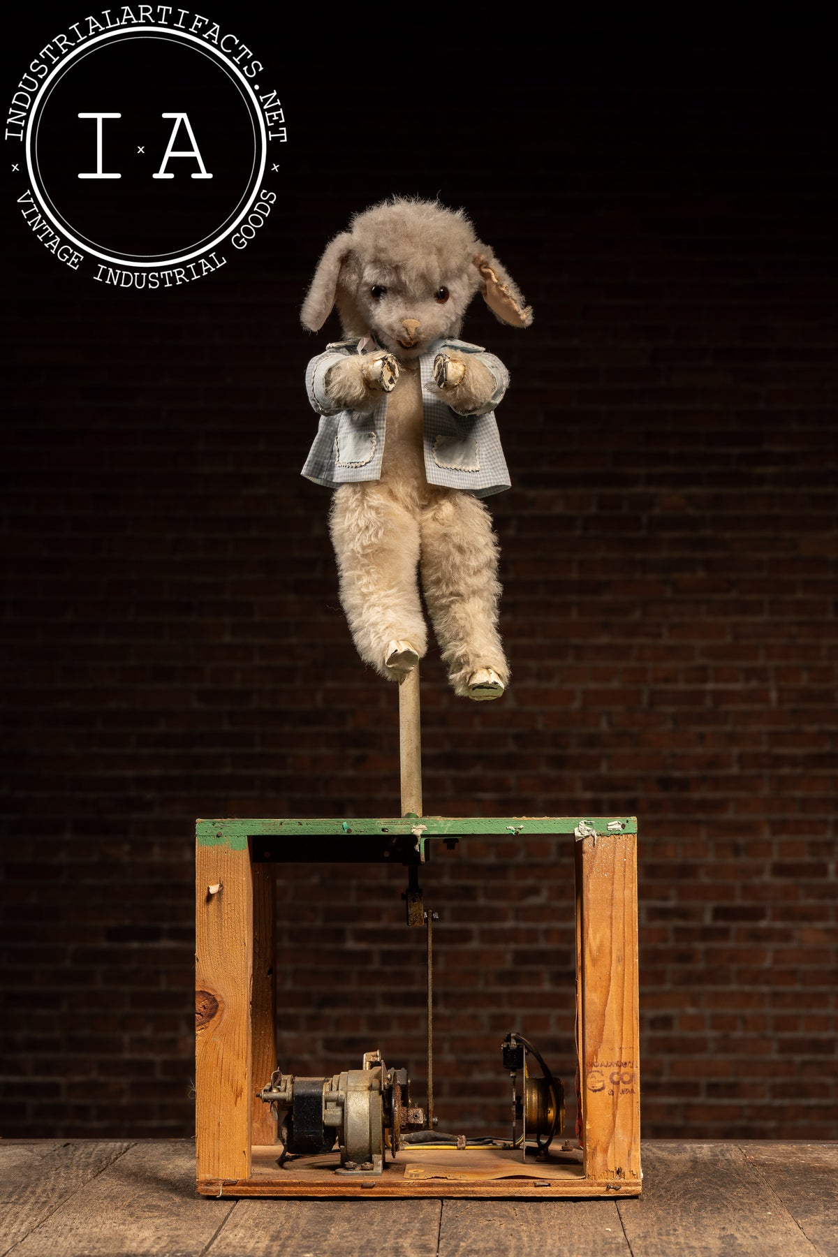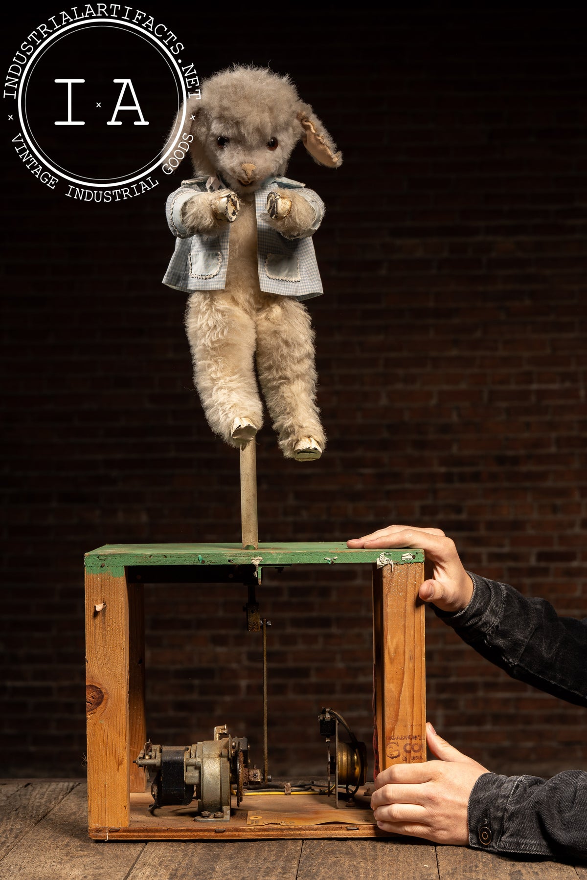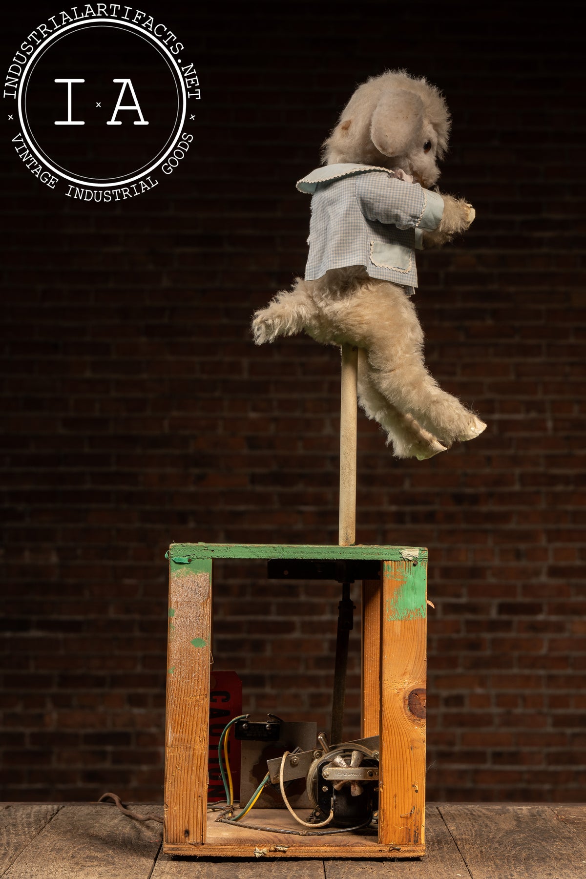 The stand shows minor wear, touch-ups, and age to the painted surface, while the lamb retains good plush condition with only light handling wear. Tested and working.
