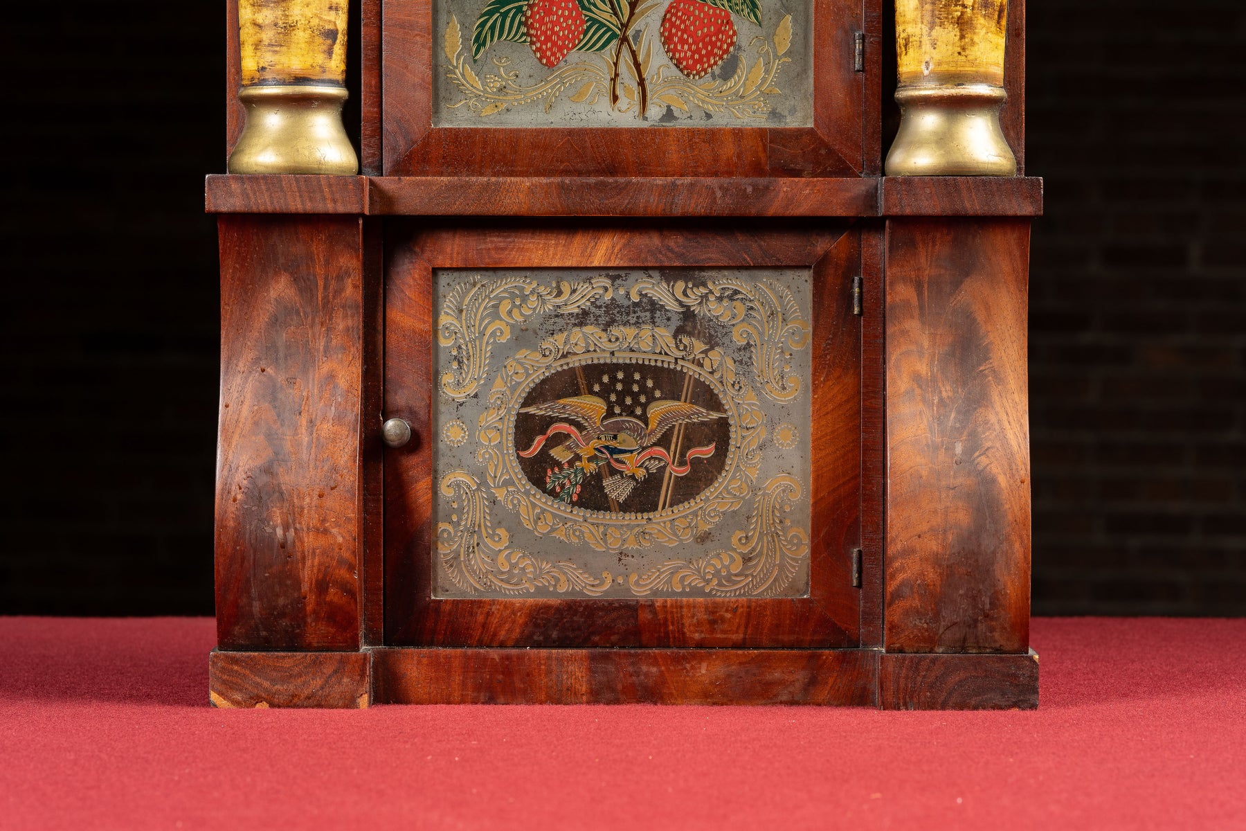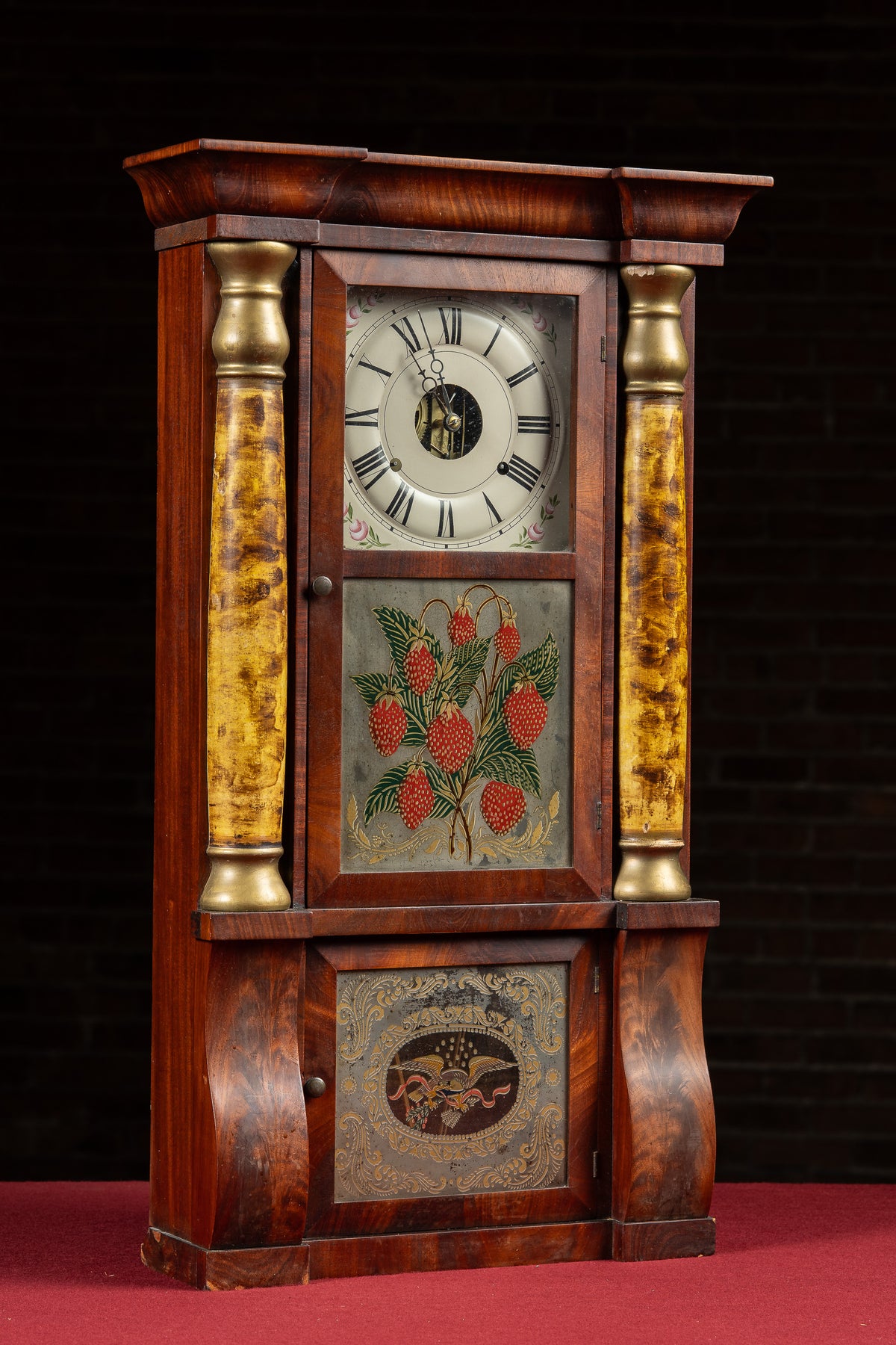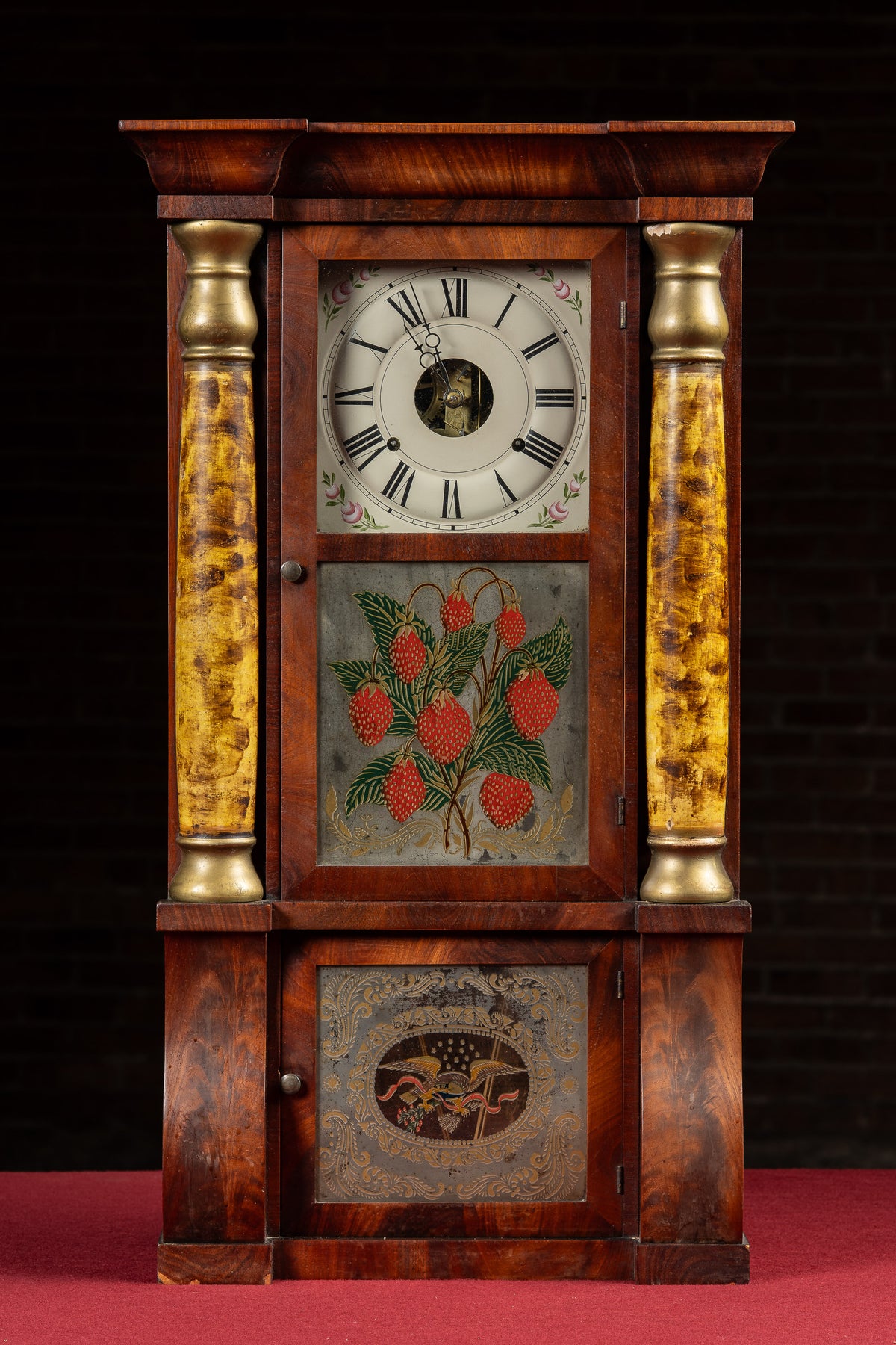 This striking mid-19th century shelf clock blends neoclassical lines with decorative folk charm. The painted wood case is finished in a faux mahogany grain, flanked by stenciled columns with gold and mustard swirls and turned gilt capitals. Its upper tablet features a crisp strawberry motif surrounded by floral sprays, while the lower door bears a reverse-painted patriotic emblem flanked by spears and a ribbon banner reading "SARATOGA." The Roman numeral dial and mechanical movement are visible behind the upper glass panel. Not tested, sold as is. Minor losses to the top molding and base do not detract from the presence or historical interest of this early American timepiece.