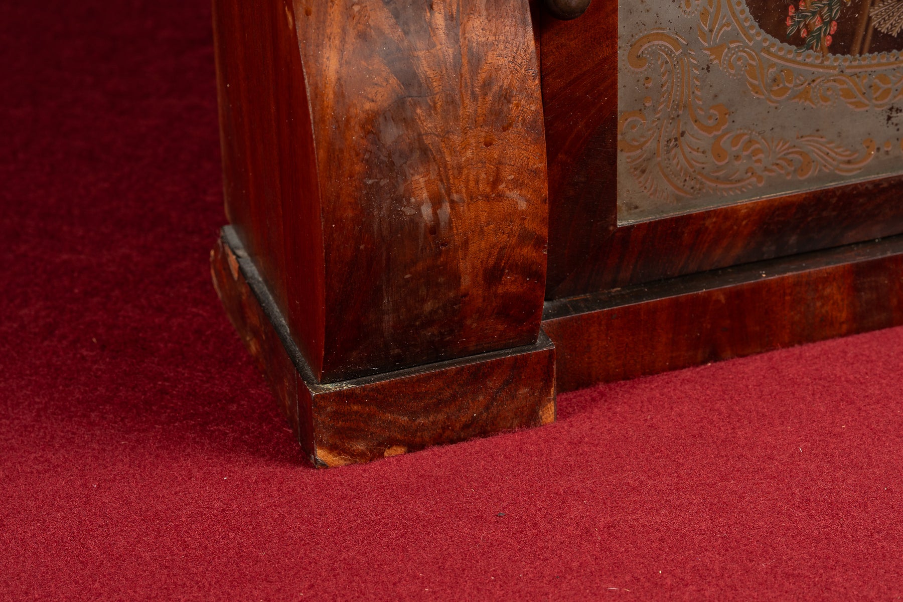 Empire-style column clock with reverse-painted floral tablet and stenciled gilt columns.