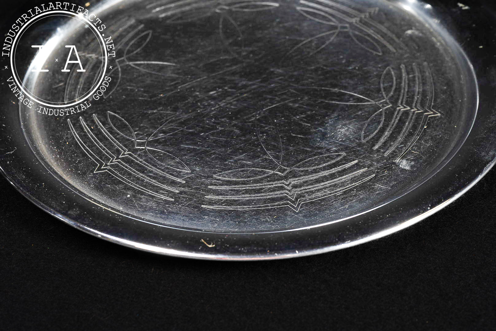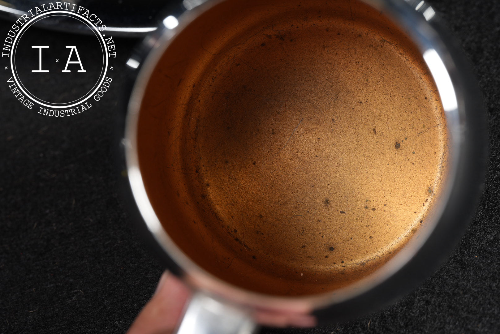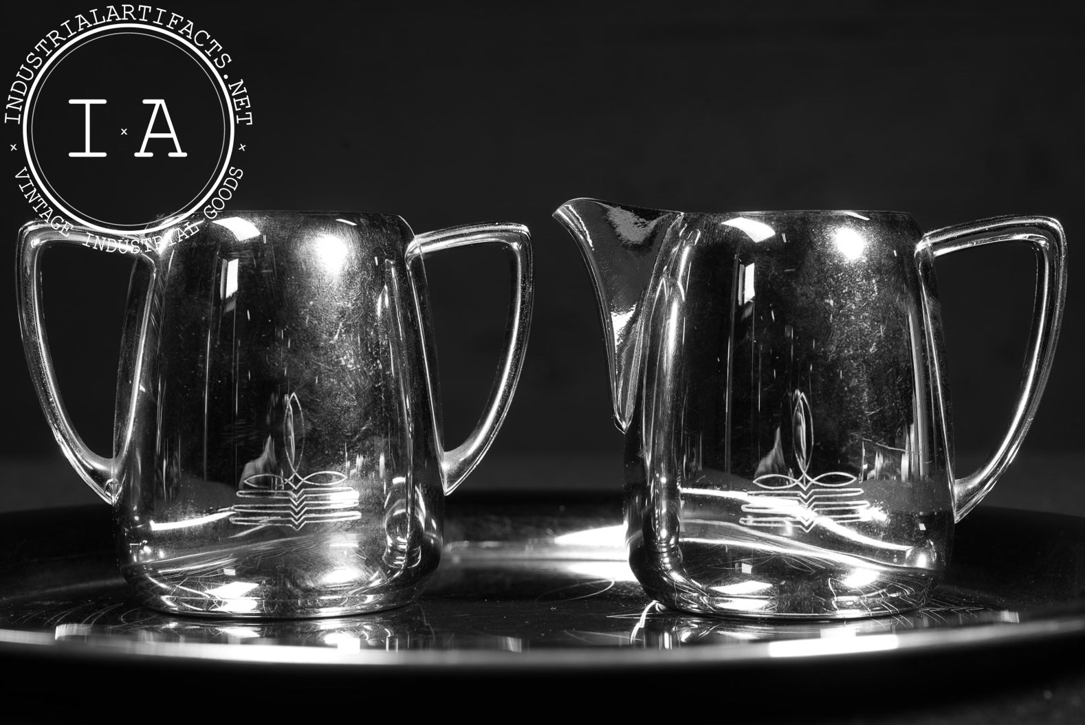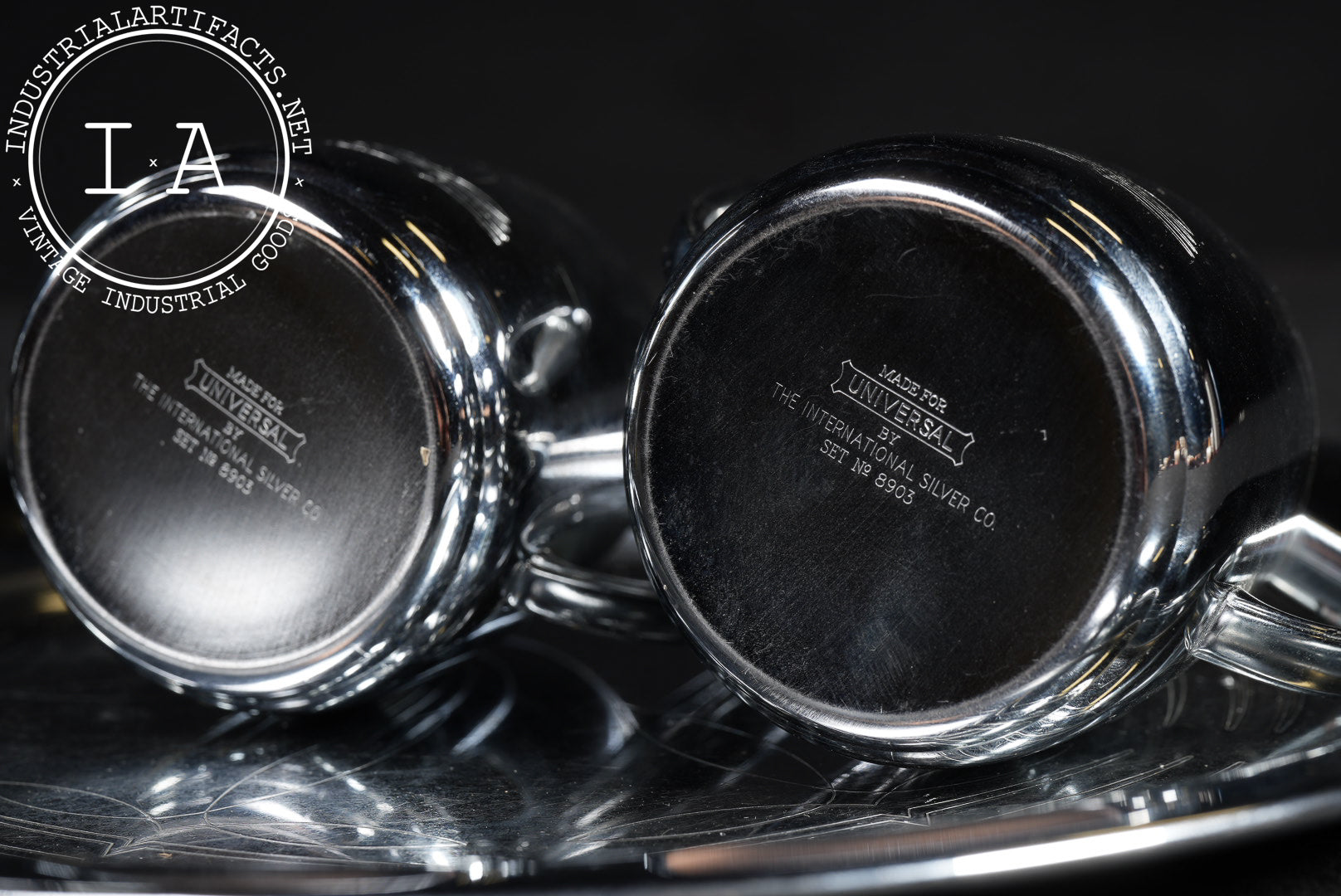 Streamlined chrome-plated electric percolator with matching cream and sugar service, presented on a circular serving tray. The Universal Coffeematic features a polished, rounded form with side handle and faceted glass finial, while its copper-tone control panel allows adjustment between "Mild" and "Strong." The base is marked Universal Coffeematic, a trademark of Landers, Frary & Clark, an American manufacturer widely recognized for their innovations in household electrics during the mid-20th century.