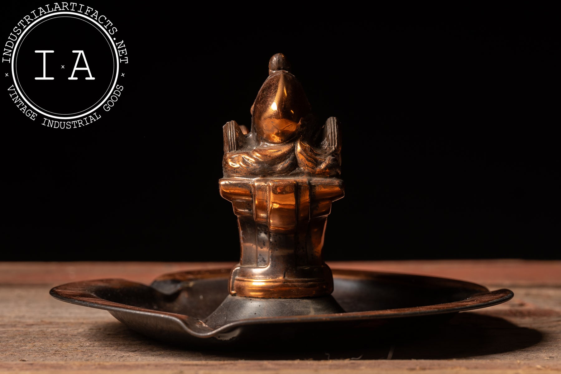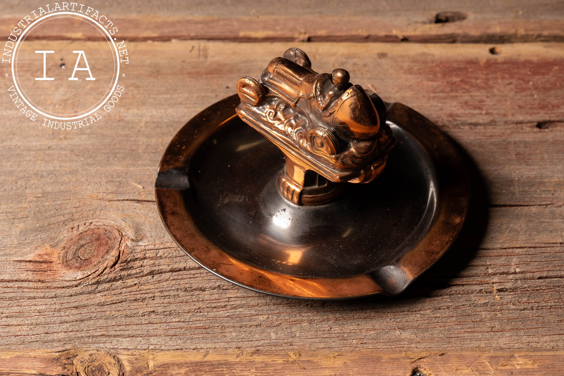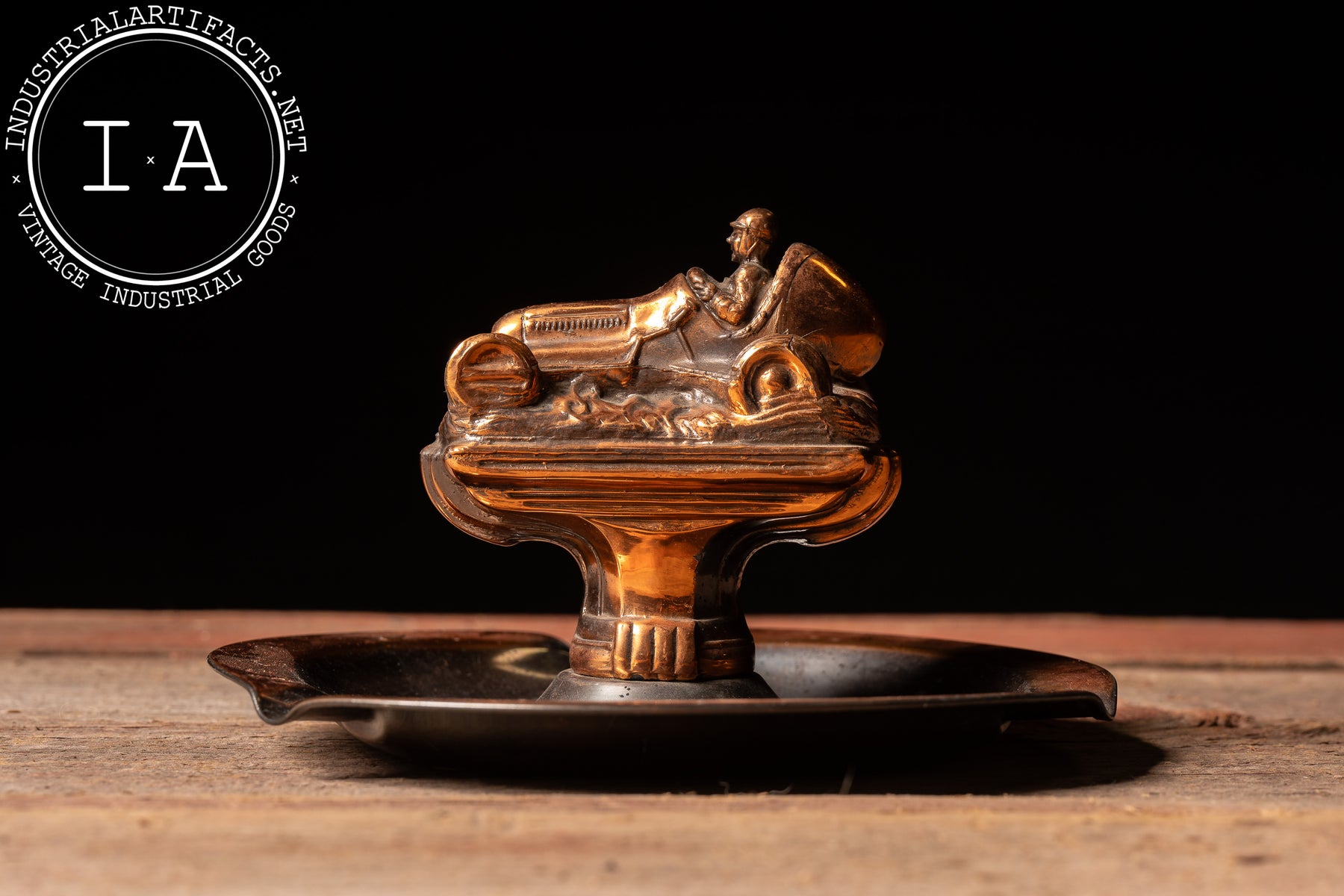 Flashed copper ashtray featuring a sculptural finial in the form of an open-wheel race car and driver, mounted above a circular dish with three cigarette rests. The car is rendered in streamlined midcentury fashion, complete with helmeted driver, rounded fenders, and simplified wheel forms, evoking postwar American hot rod and "midget" racer aesthetics. The finial rises from a stepped pedestal at the center of the dish, giving the piece the presence of a small trophy-unsurprising given its maker. The warm copper flash contrasts against darker oxidized recesses, highlighting the contours of the vehicle and driver.