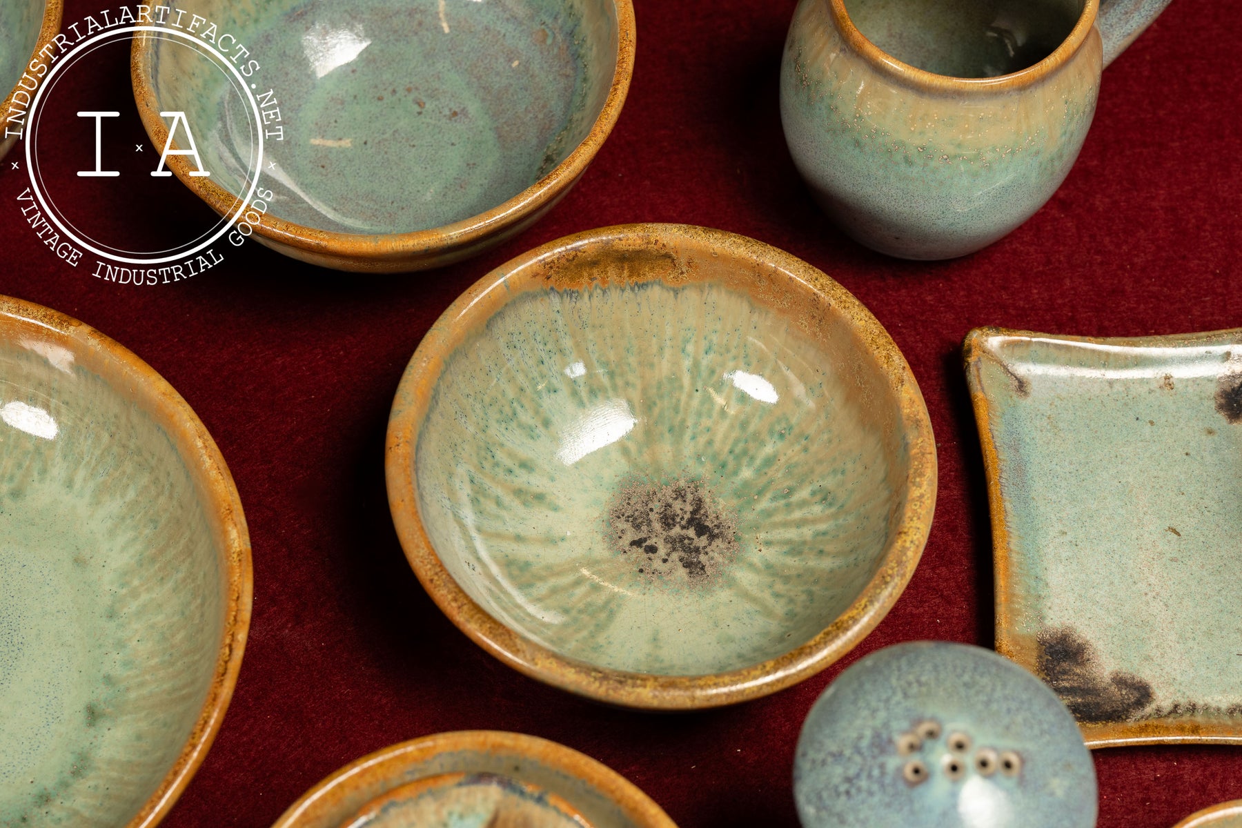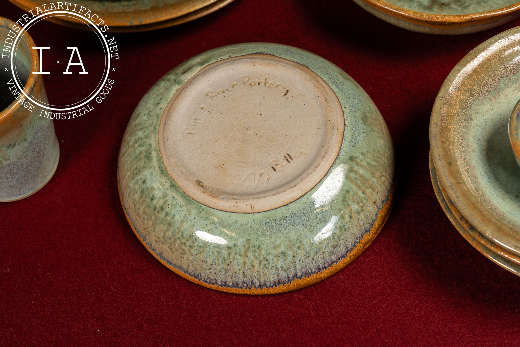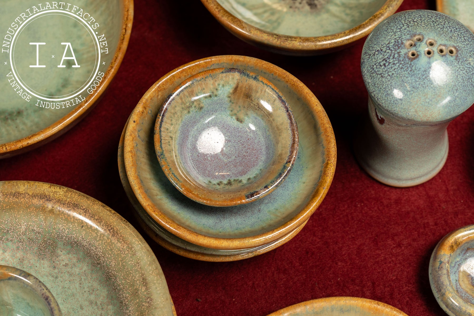 Thirty-six-piece dinnerware set in hand-thrown stoneware, produced by Pigeon River Pottery, the long-running Tennessee workshop established by Douglas Ferguson in 1954. The set features a striking multicolor glaze blend of earthy green, slate blue, and warm brown, each piece unique due to hand-dipping and kiln variation.
