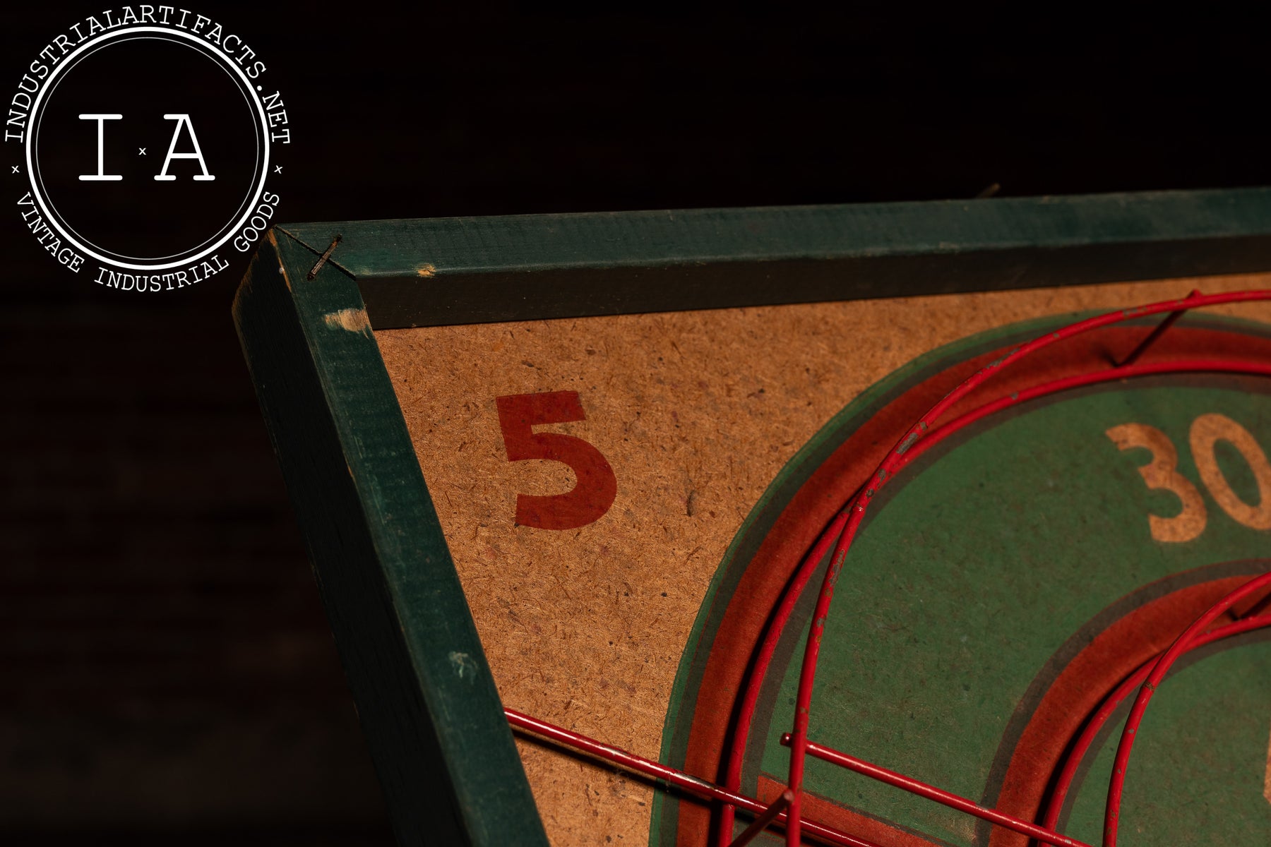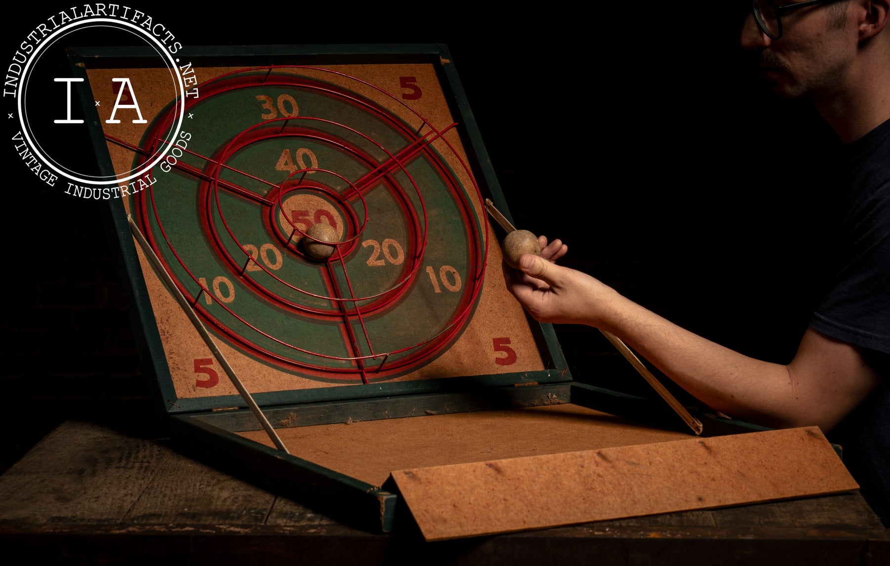 Original boxed Carrom Hi-Bol bowling game, a tabletop skee-ball style target game designed for indoor or outdoor play. The hinged wooden case opens to reveal a brightly painted scoring target with concentric rings and a metal wire guide system. Two balls are included, completing the set for functional use or display. Compact when closed yet expansive in play, the game reflects Carrom's tradition of producing family-friendly amusement devices with sturdy construction and simple, engaging design.