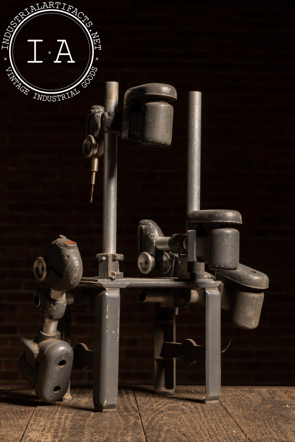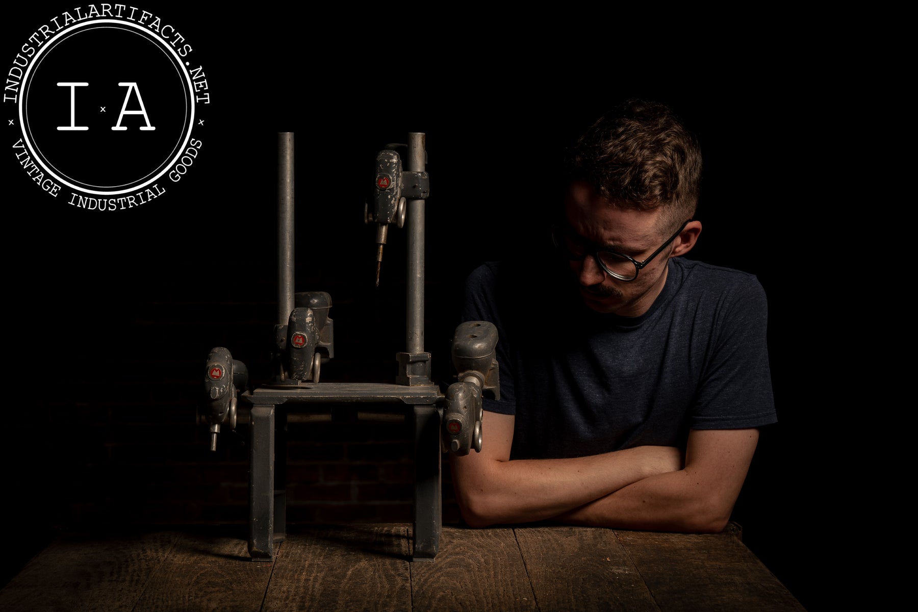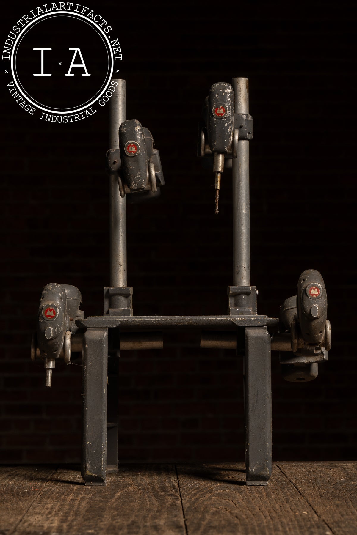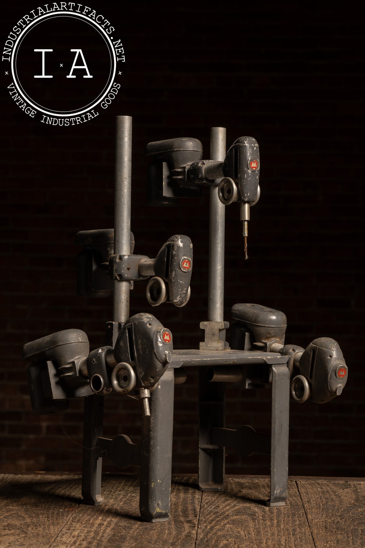 Cast metal salesman's sample of an Atlas shop-style gang drill press, scaled down to demonstrate the company's multi-head drilling system. The model features six individual drill heads mounted on a shared frame, each with adjustable arms and fittings, replicating the function and versatility of the full-size shop machines. Compact in scale yet carefully detailed, this sample was likely used by traveling salesmen to illustrate Atlas equipment offerings to small industrial shops and vocational schools.