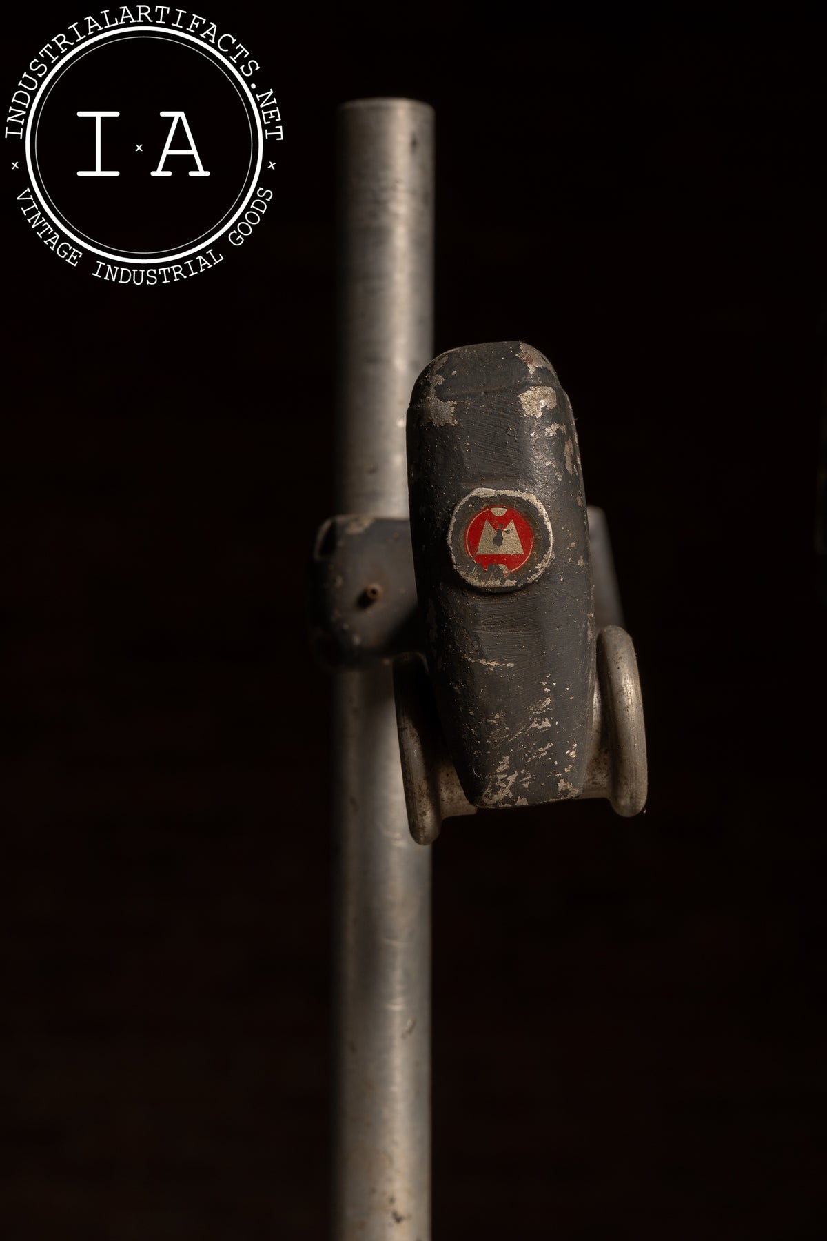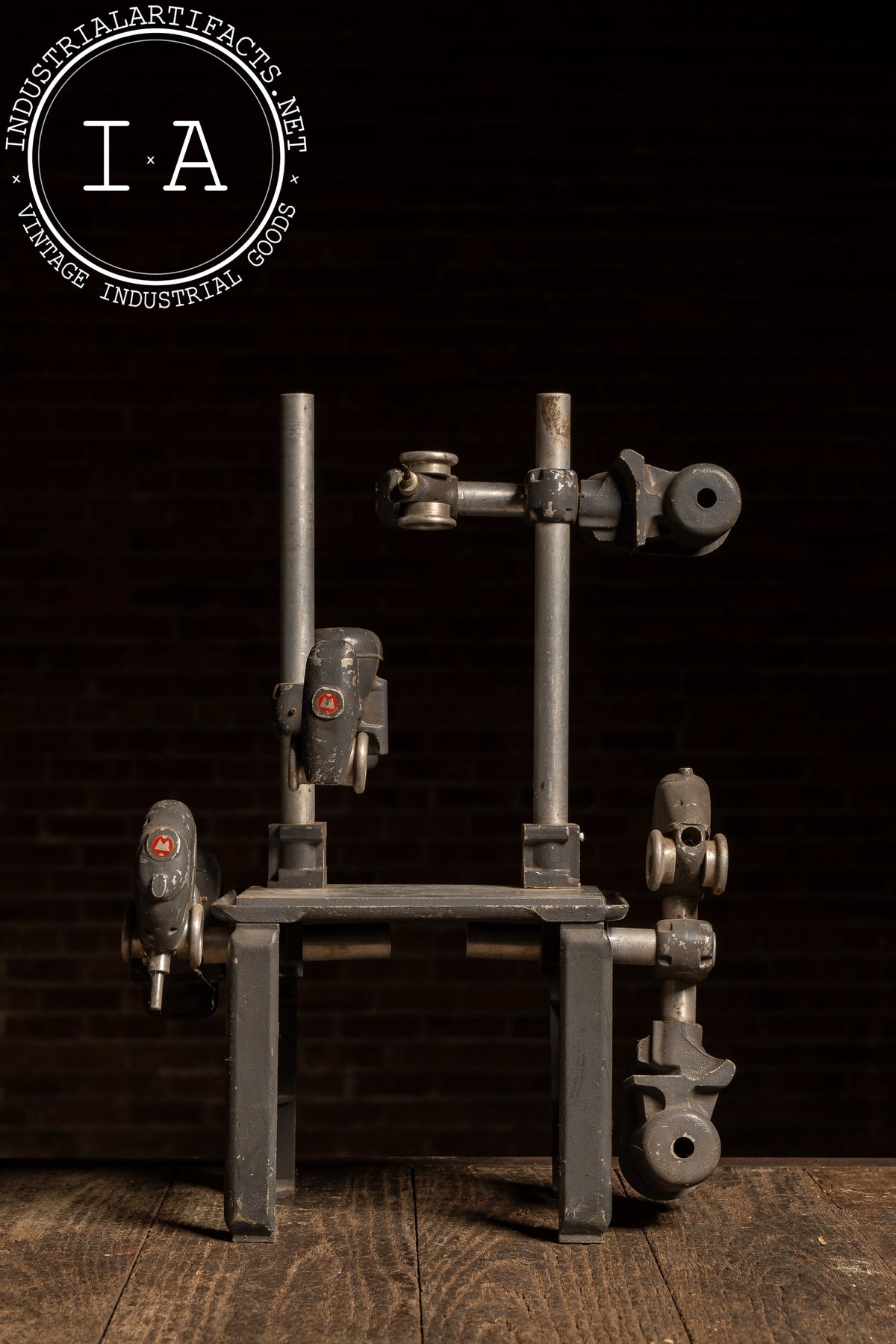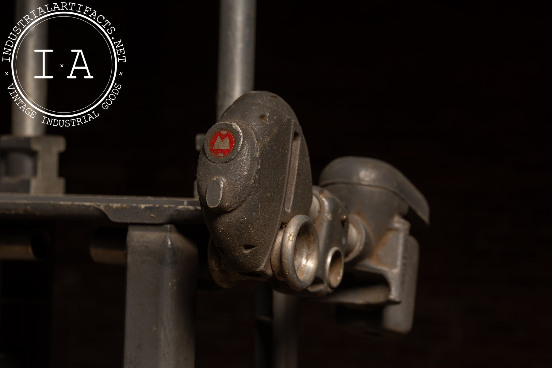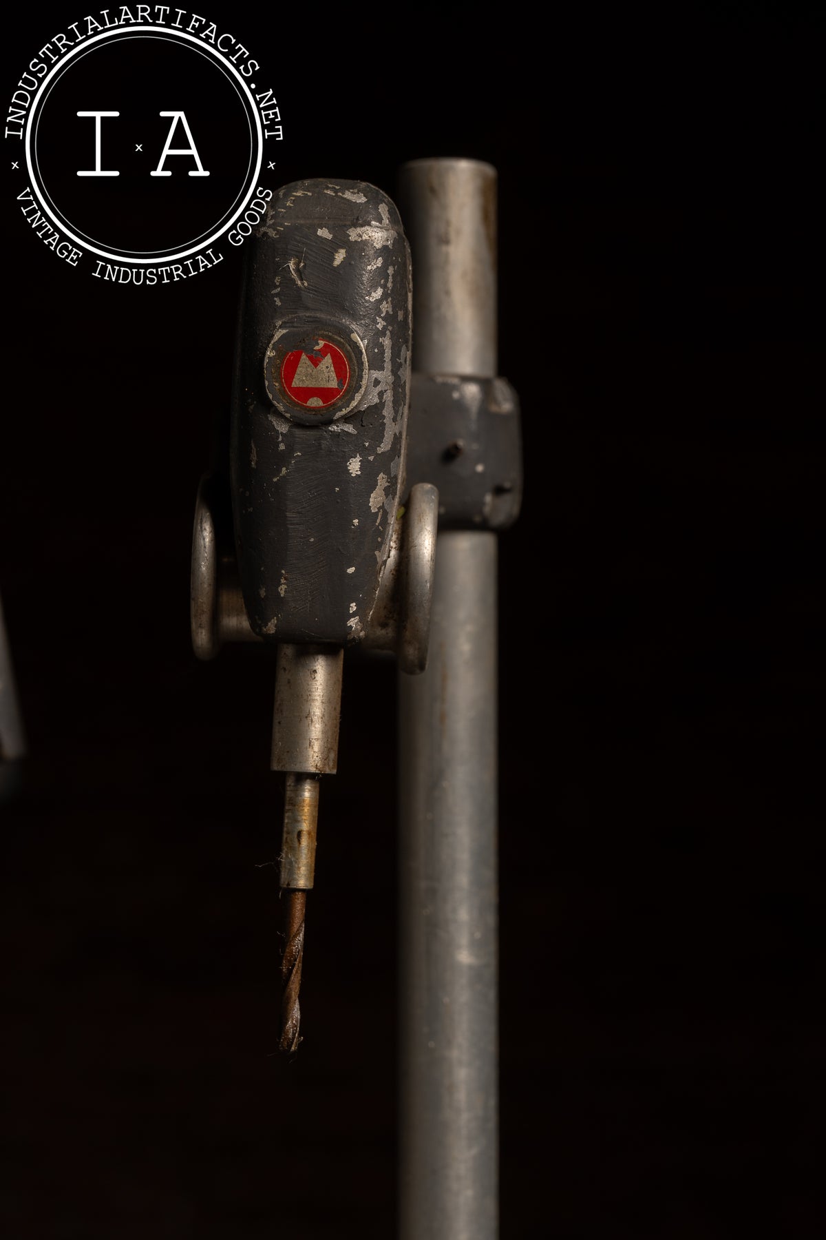 Cast metal salesman's sample of an Atlas shop-style gang drill press, scaled down to demonstrate the company's multi-head drilling system. The model features six individual drill heads mounted on a shared frame, each with adjustable arms and fittings, replicating the function and versatility of the full-size shop machines. Compact in scale yet carefully detailed, this sample was likely used by traveling salesmen to illustrate Atlas equipment offerings to small industrial shops and vocational schools.