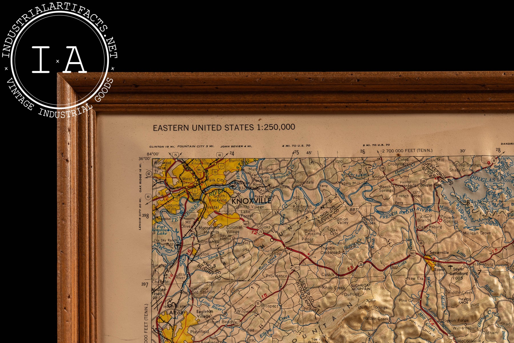 Large-format raised relief topographic map of the Knoxville quadrangle, covering portions of eastern Tennessee and adjoining areas of North Carolina, South Carolina, and Georgia. The map is based on U.S. Geological Survey data at a 1:250,000 scale and features vacuum-formed relief that translates contour lines into pronounced three-dimensional terrain. Mountain ranges, river valleys, and elevation changes across the Great Smoky Mountains region are rendered with striking depth, while printed overlays identify roads, waterways, towns, and boundaries. Yellow-highlighted urban areas emphasize regional population centers, with Knoxville prominently labeled near the center.