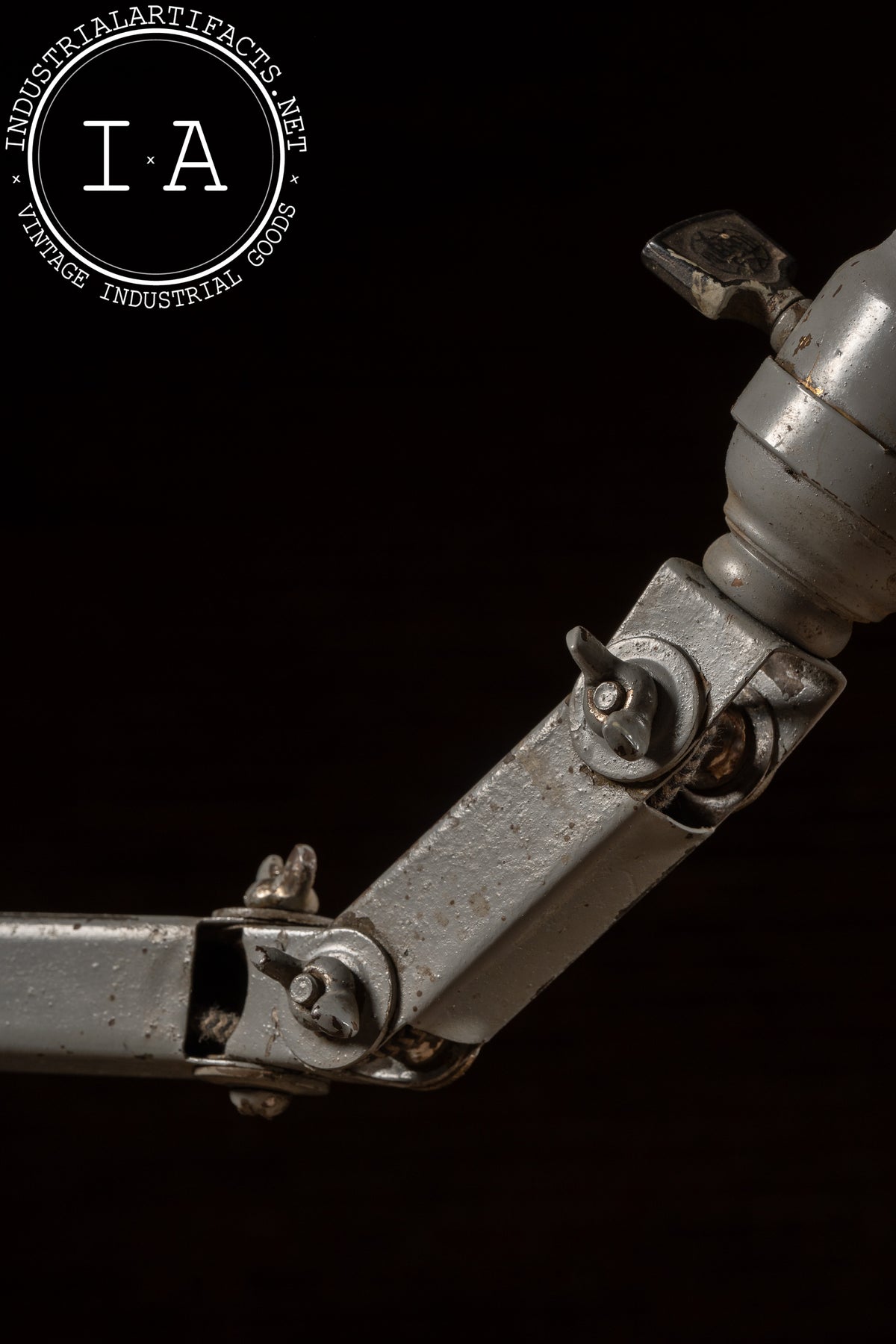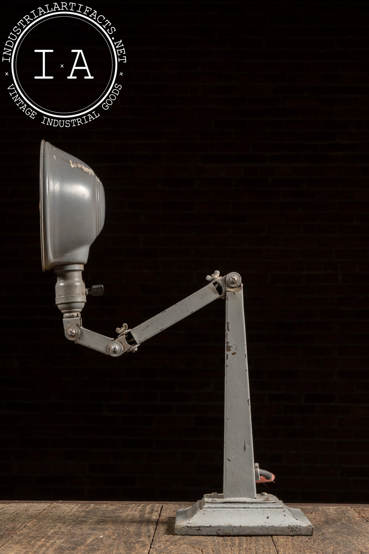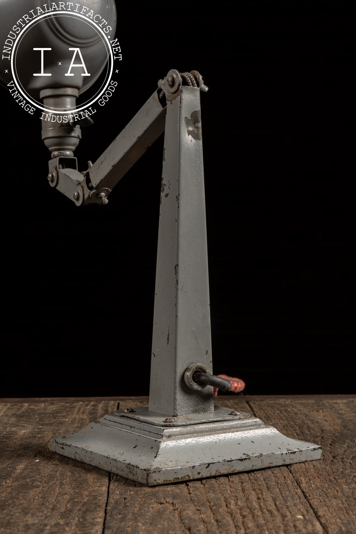 Among the variants built on the 6.5" × 6.5" base, No. 306 is the tallest configuration, featuring a long upper arm and mid-arm knuckle assembly designed for extended reach across workbenches and machinery. The geometry of the joints, the base profile, and the shade form match the catalog illustration precisely, reinforcing the attribution. Originally marketed for tool rooms, manufacturing floors, and drafting environments, these lamps were prized for their rigidity and precision movement-qualities the present example still retains. Recently rewired in-house, it provides clean, warm illumination while maintaining its untouched industrial paint and working mechanical joints.