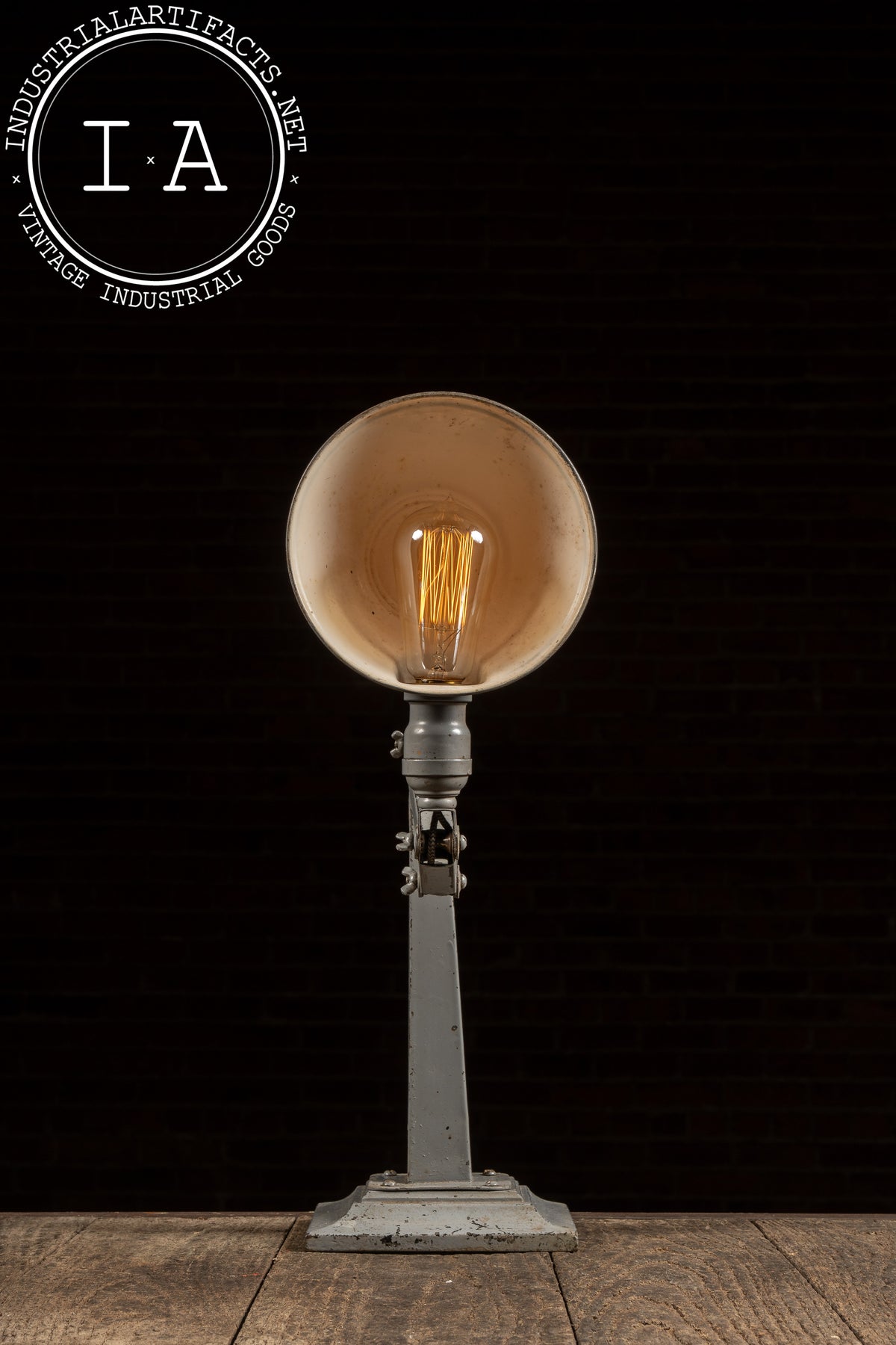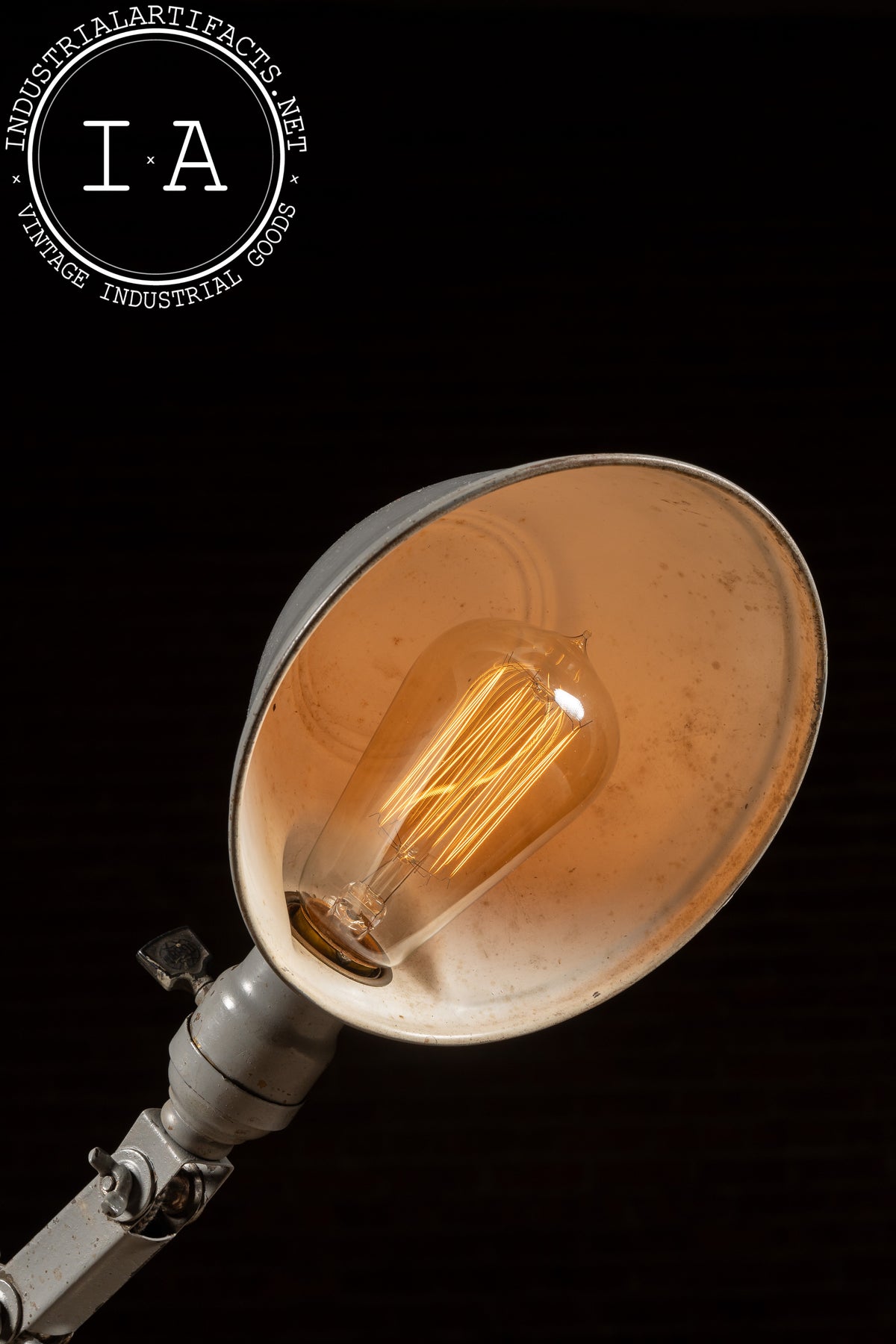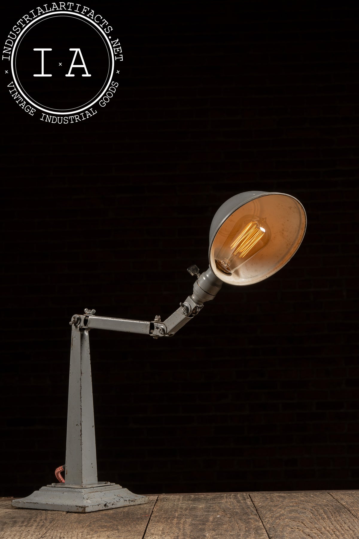 Among the variants built on the 6.5" × 6.5" base, No. 306 is the tallest configuration, featuring a long upper arm and mid-arm knuckle assembly designed for extended reach across workbenches and machinery. The geometry of the joints, the base profile, and the shade form match the catalog illustration precisely, reinforcing the attribution. Originally marketed for tool rooms, manufacturing floors, and drafting environments, these lamps were prized for their rigidity and precision movement-qualities the present example still retains. Recently rewired in-house, it provides clean, warm illumination while maintaining its untouched industrial paint and working mechanical joints.