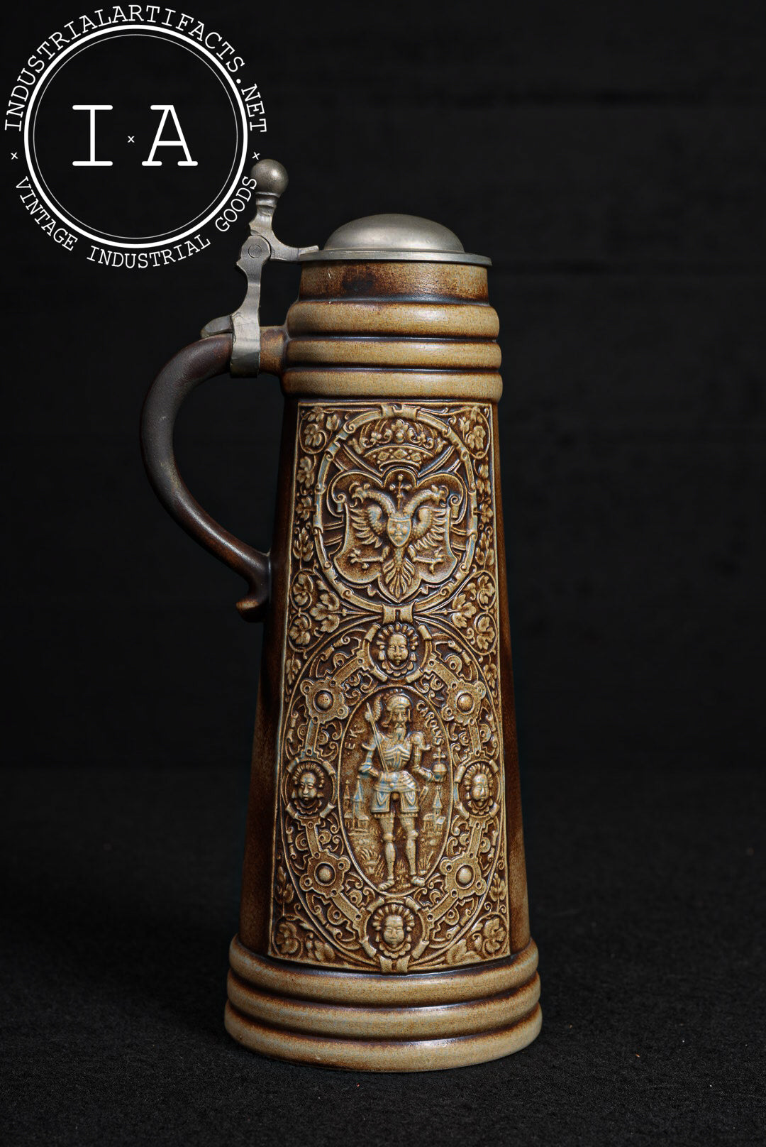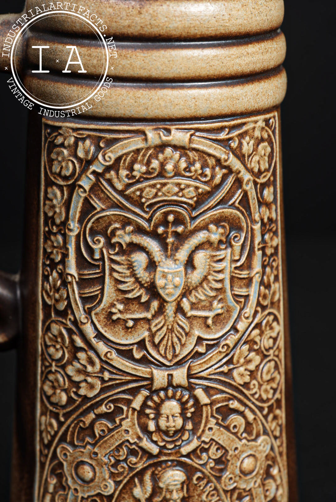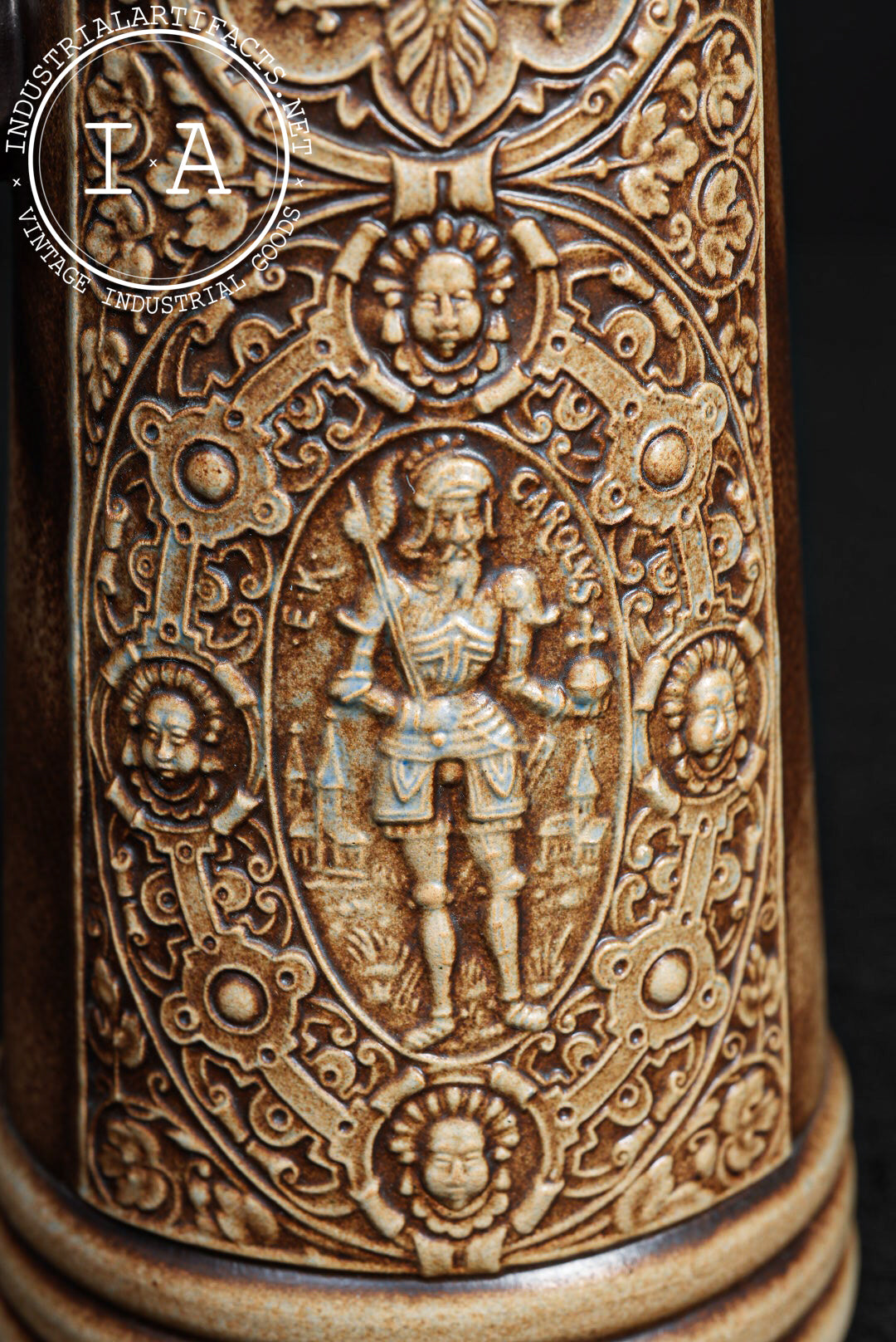 Tall, tapering stoneware beer stein featuring an ornate relief design with medieval motifs, including a central depiction of Emperor Carolus (Charlemagne) surrounded by scrollwork, cherubic masks, and architectural detailing. The textured brown glaze enhances the dimensionality of the raised decoration, while the stein is completed with a pewter lid and dark curved handle. A fine example of postwar German craftsmanship continuing the centuries-old Westerwald pottery tradition.