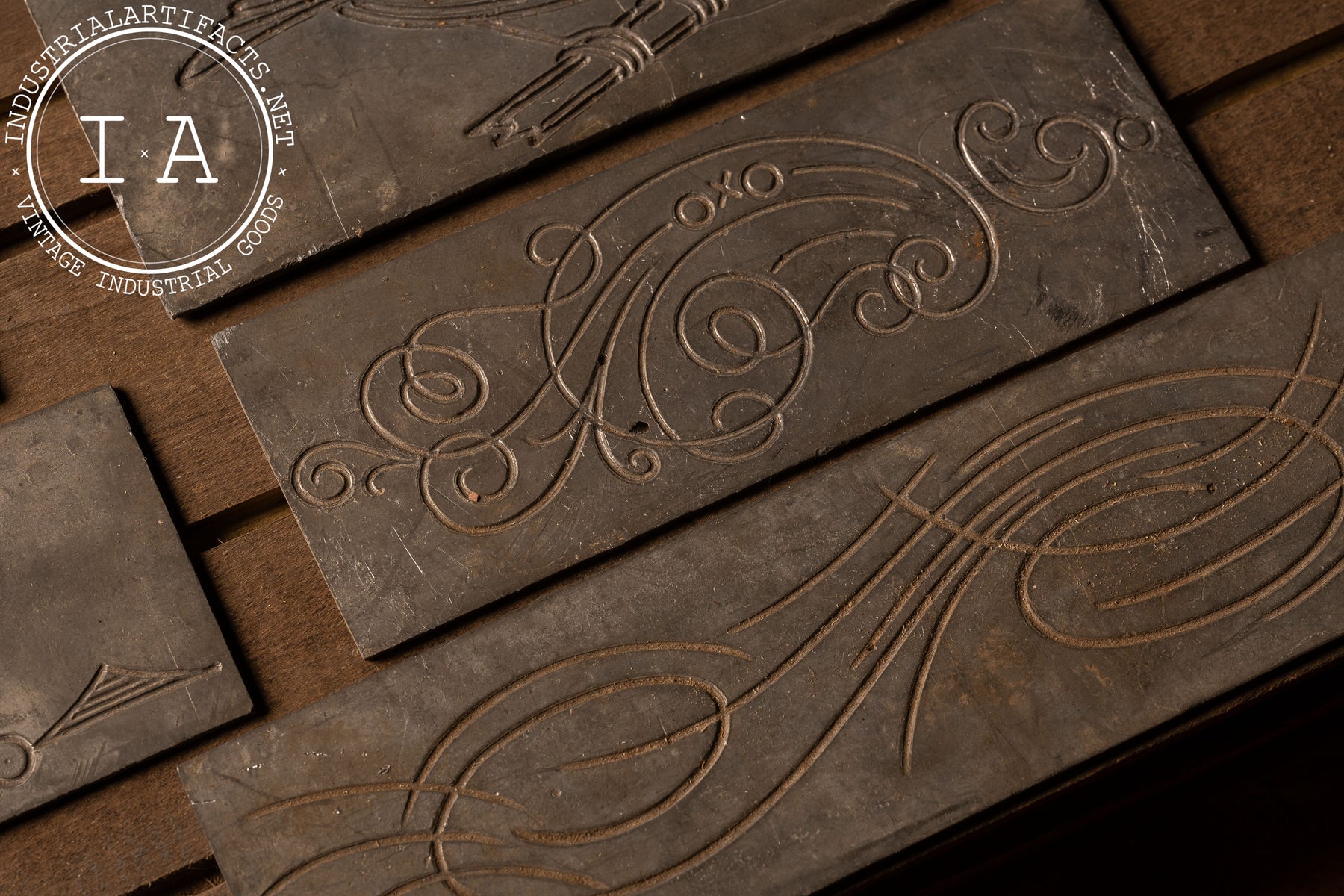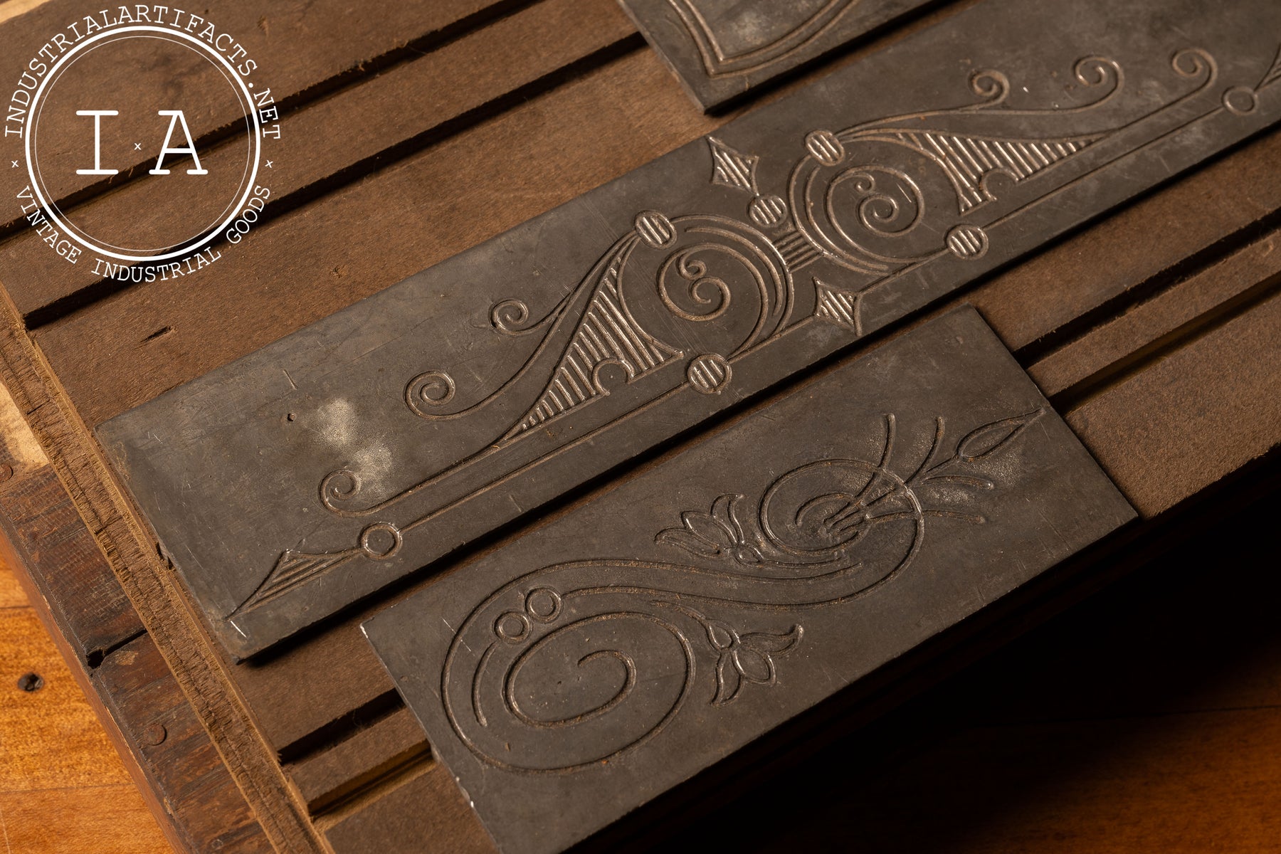 Wood-cased collection of engraved metal embellishment blocks, featuring ornate scrollwork, decorative flourishes, and emblematic motifs including a stylized bird and an F.L.T. (Friendship, Love, and Truth) chain-link design associated with the Independent Order of Odd Fellows (IOOF). Each plate is finely hand-etched for use in relief printing, mounted on fitted wood bases and stored within a custom sliding oak case marked with remnants of an early paper label.