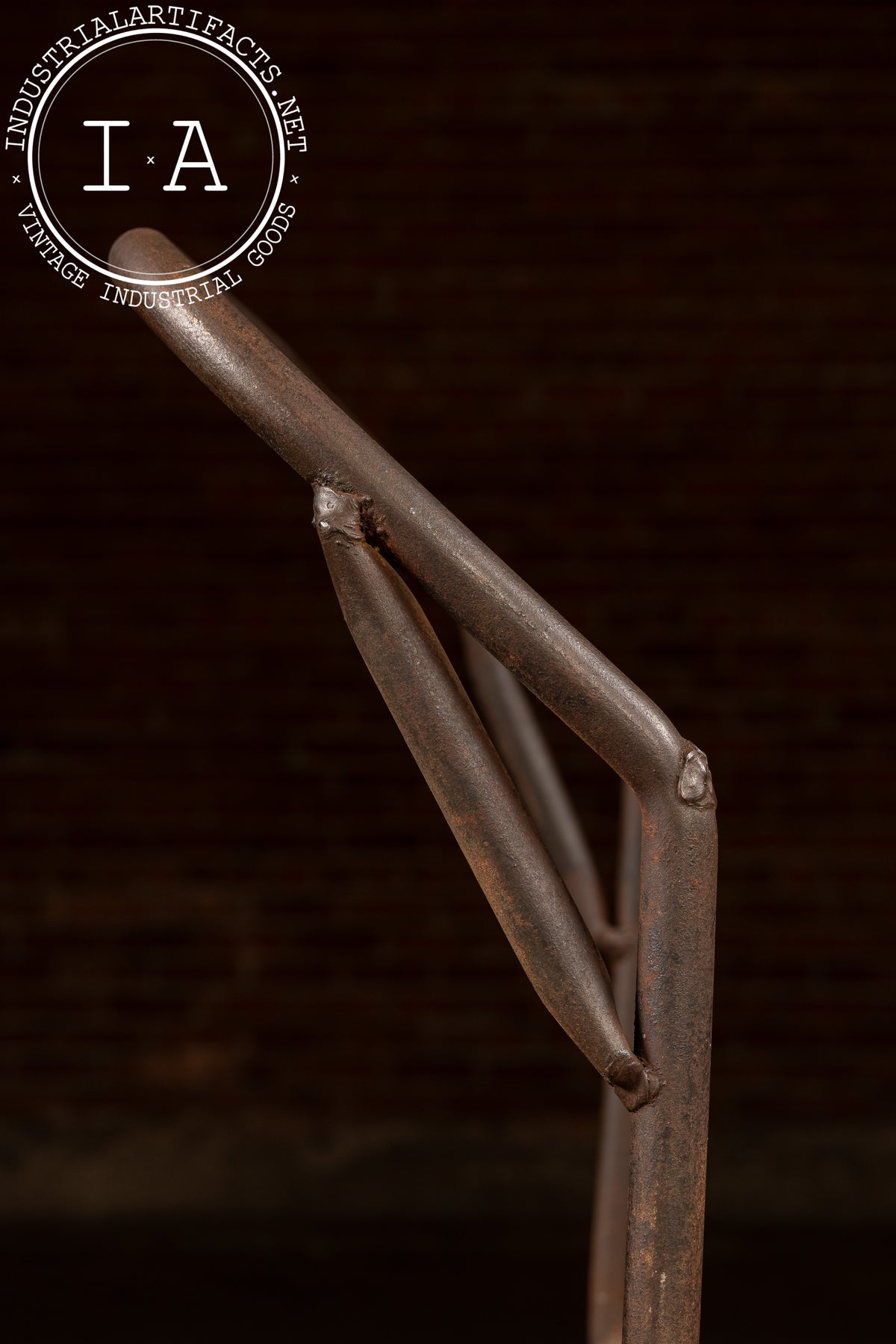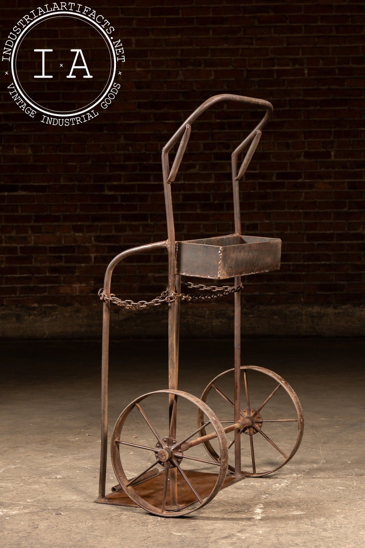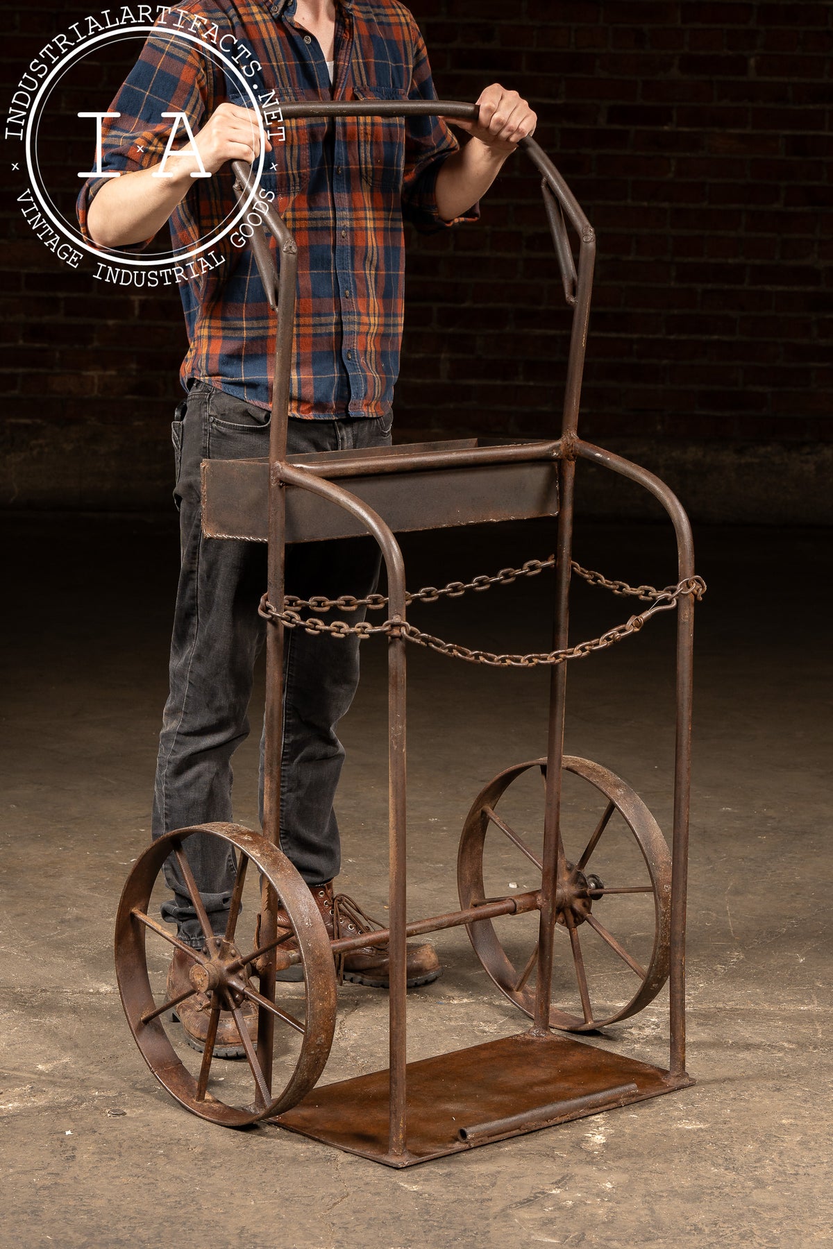 Riveted and welded steel cylinder cart featuring spoked cast-iron wheels, a curved handle frame, and an original safety chain across the front. Designed for hauling heavy gas or oxygen cylinders in industrial or automotive shops, the cart's construction reflects the early standardization of material handling equipment during America's machine-age manufacturing boom. Its narrow stance and tall handle allowed a single operator to maneuver pressurized tanks safely across uneven factory floors.