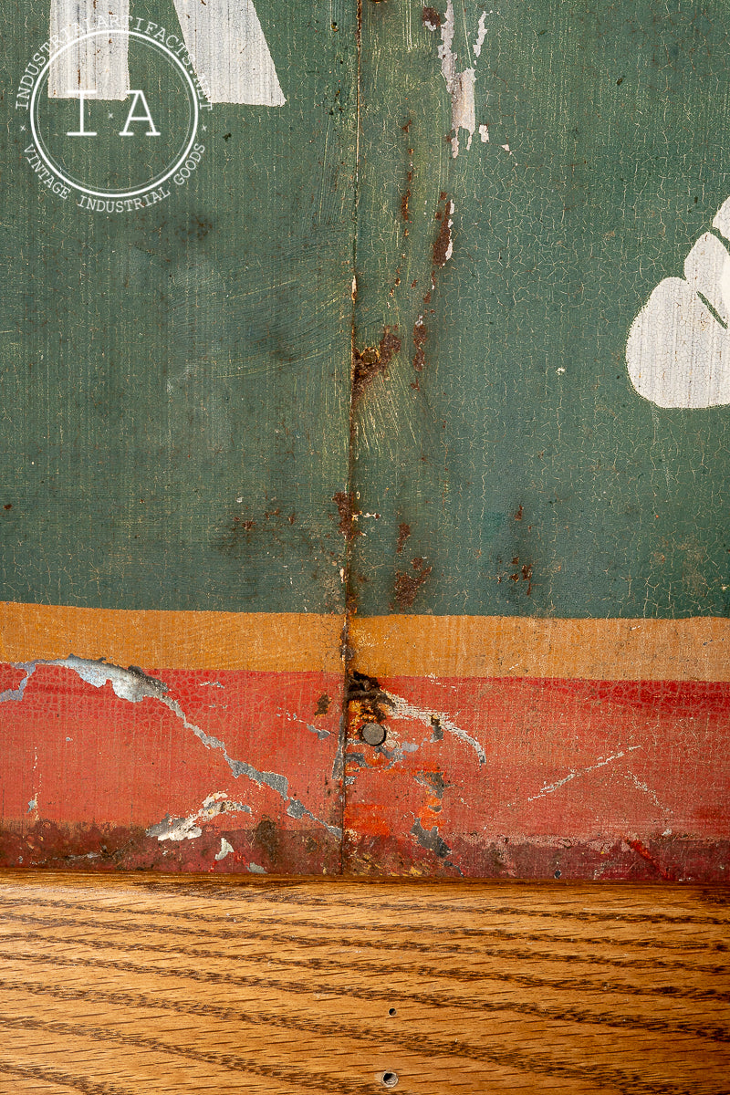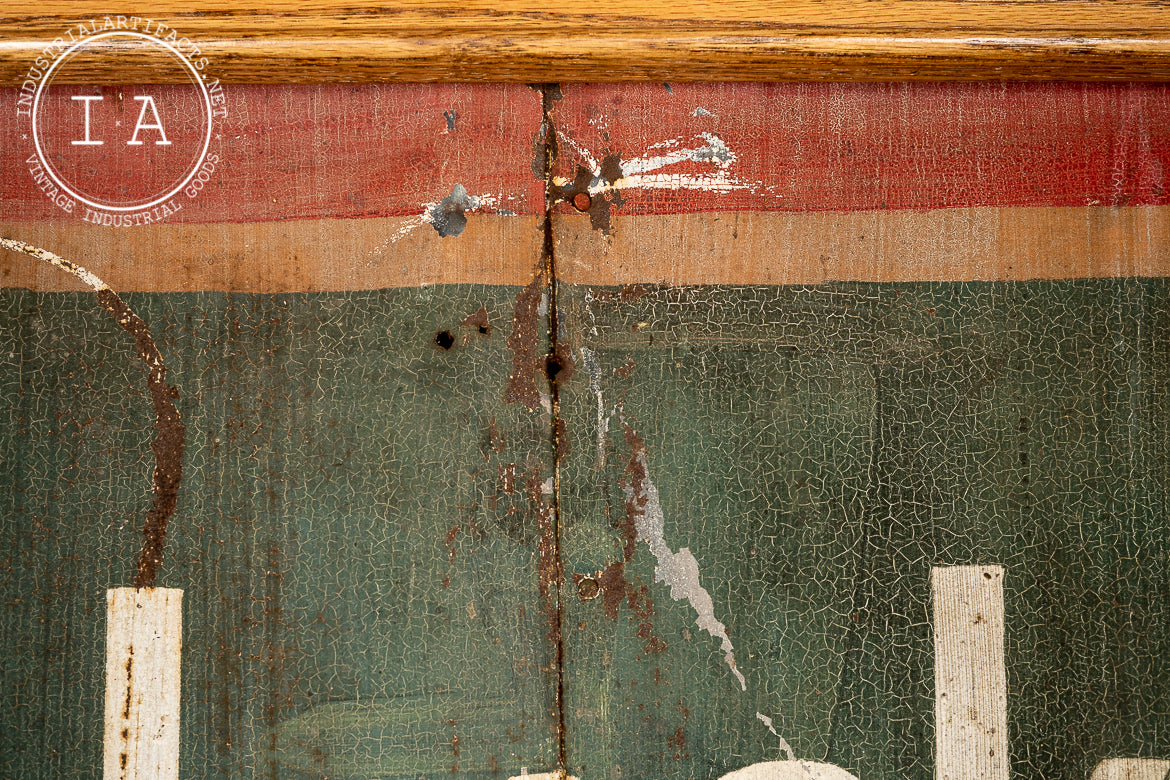 Large, hand-painted tin trade sign advertising Pillsbury's Best - The Balanced Flour. This early, pre-electric display features a bold diagonal red and green layout with the slogan "Forget Luck - Use Pillsbury's Best" rendered in block and serif lettering. A painted flour sack illustration anchors the lower field, representing the brand's signature product during its early 20th-century marketing campaigns. The panel has been mounted in a custom oak frame for structural stability and display, preserving the integrity of its original hand-brushed finish and early industrial hardware.
