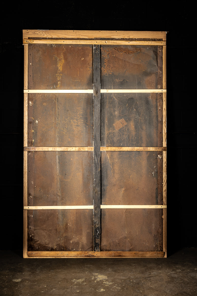 Surface wear, oxidation, and light loss are evident throughout, with age-toned patina across the tin and minor seam separations along the original joined panels. Paint remains stable and vividly legible.