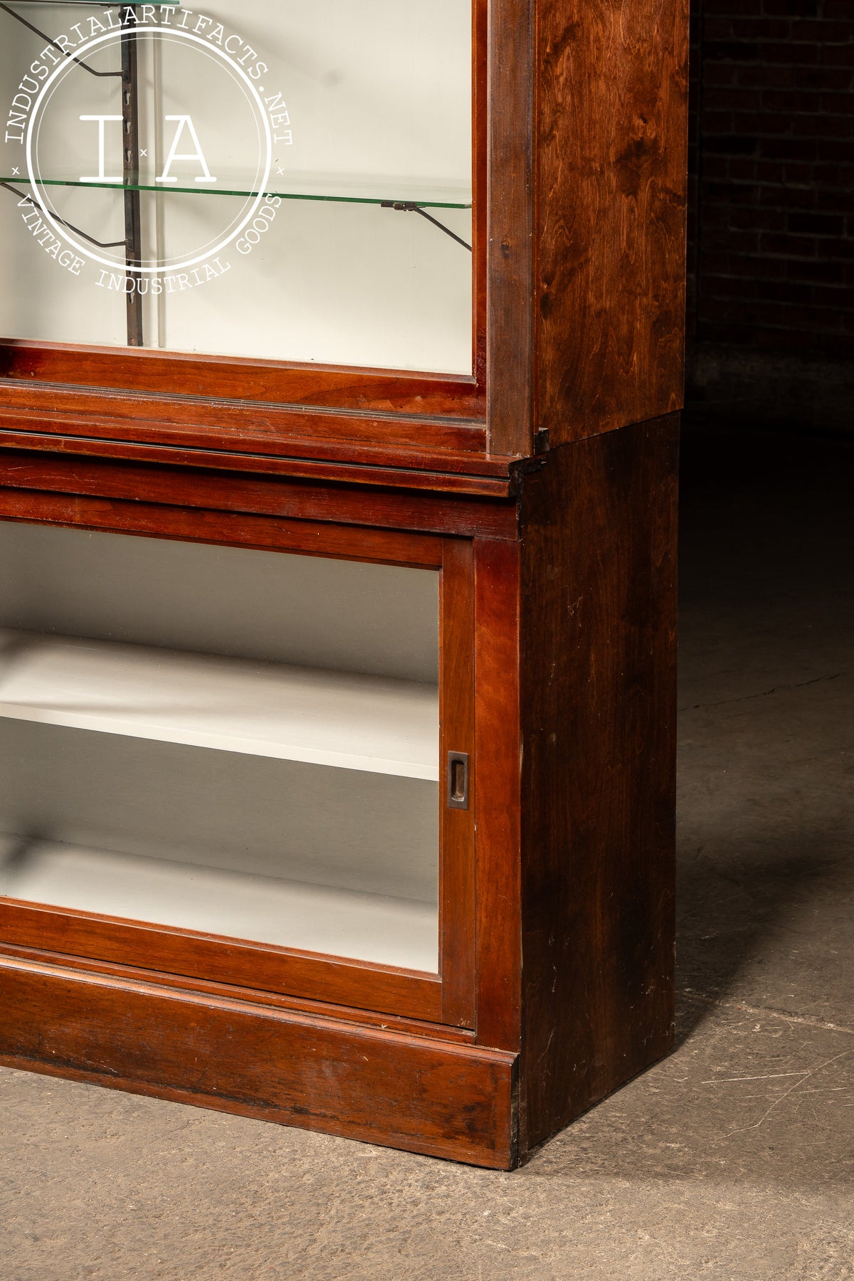 Two-piece oak display cabinet featuring sliding glass doors and adjustable interior shelving. The upper section houses three glass shelves supported by steel brackets, while the lower section offers enclosed storage with a removable interior shelf. The clean white-painted interior provides strong contrast for showcased items, reflecting light effectively for visual clarity-an aesthetic often favored in early mercantile and apothecary fixtures.