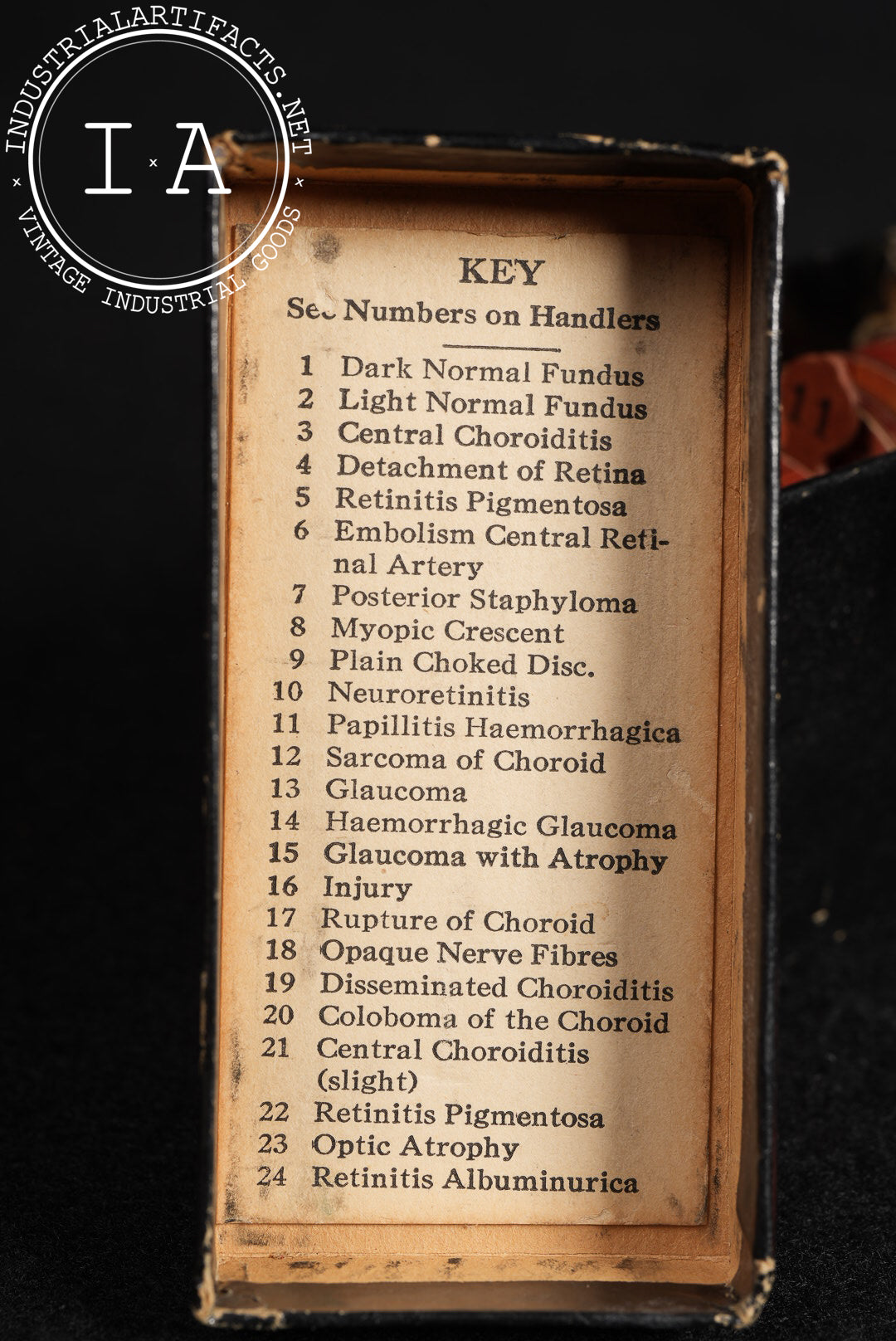Early 20th-century Fischer schematic eye apparatus housed in its original black storage box, complete with labeled reference key and a series of interchangeable painted retinal slides. The compact cast-metal instrument stands 5" tall with rotating arms to hold and display the diagnostic slides, each hand-painted to illustrate conditions of the human eye such as retinal detachment, glaucoma, papillitis, coloboma, and more.