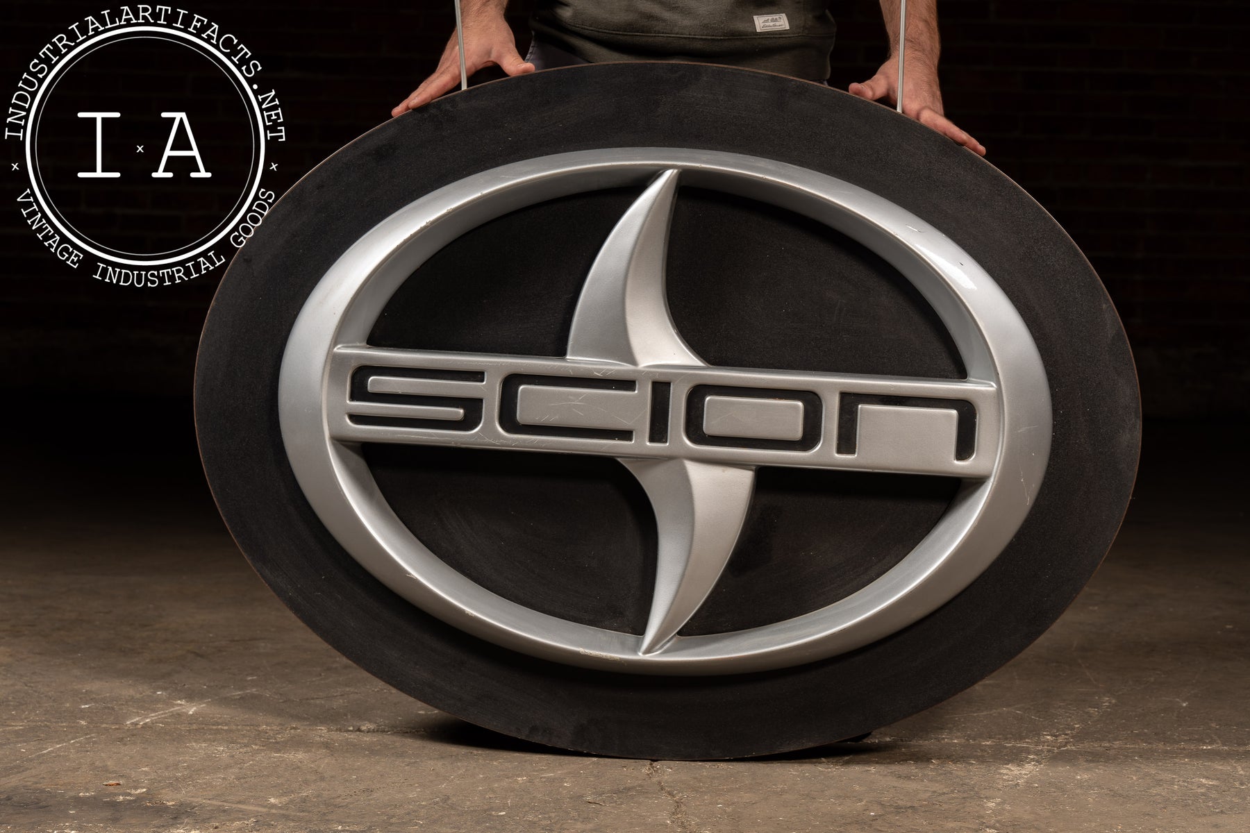 Oversized oval dealership sign featuring the distinctive Scion emblem in raised silver lettering over a black composite background. Constructed from molded acrylic and aluminum with a dimensional center crossbar and smooth metallic finish, this piece was produced for official Toyota Scion dealerships during the brand's active years (2003-2016). The bold, minimalist design mirrors the clean aesthetic of Scion's marketing identity-aimed at younger drivers and rooted in Japanese modernist influence.