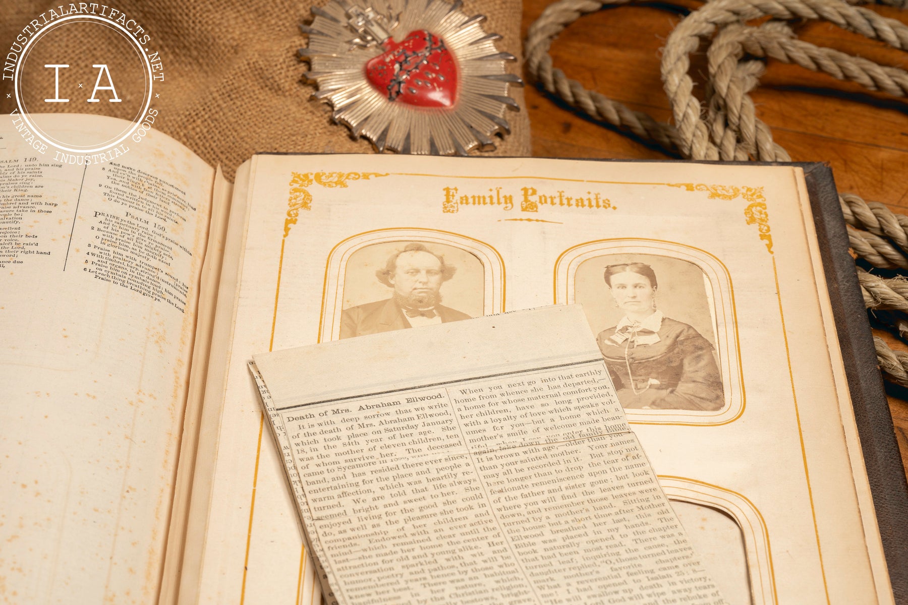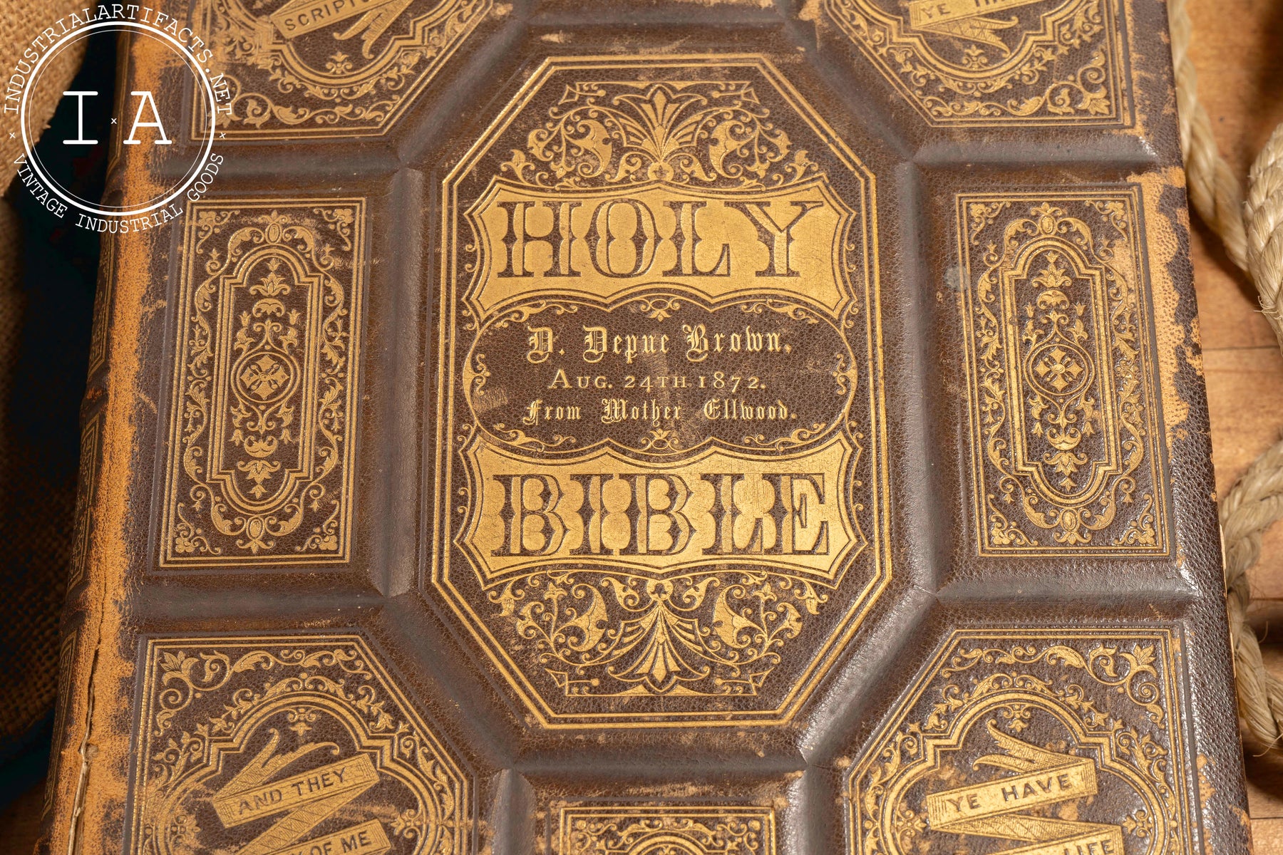 Antique illustrated bible that once belonged to the Ellwood family of Dekalb, IL. The Ellwoods are one of Dekalb's Founding Families as the patriarch Issac, along with Joseph Glidden and Jacob Haish, invented what is now known as the first true barbed wire. In addition to this, Ellwood was also instrumental in Dekalb becoming the home of Northern Illinois University.