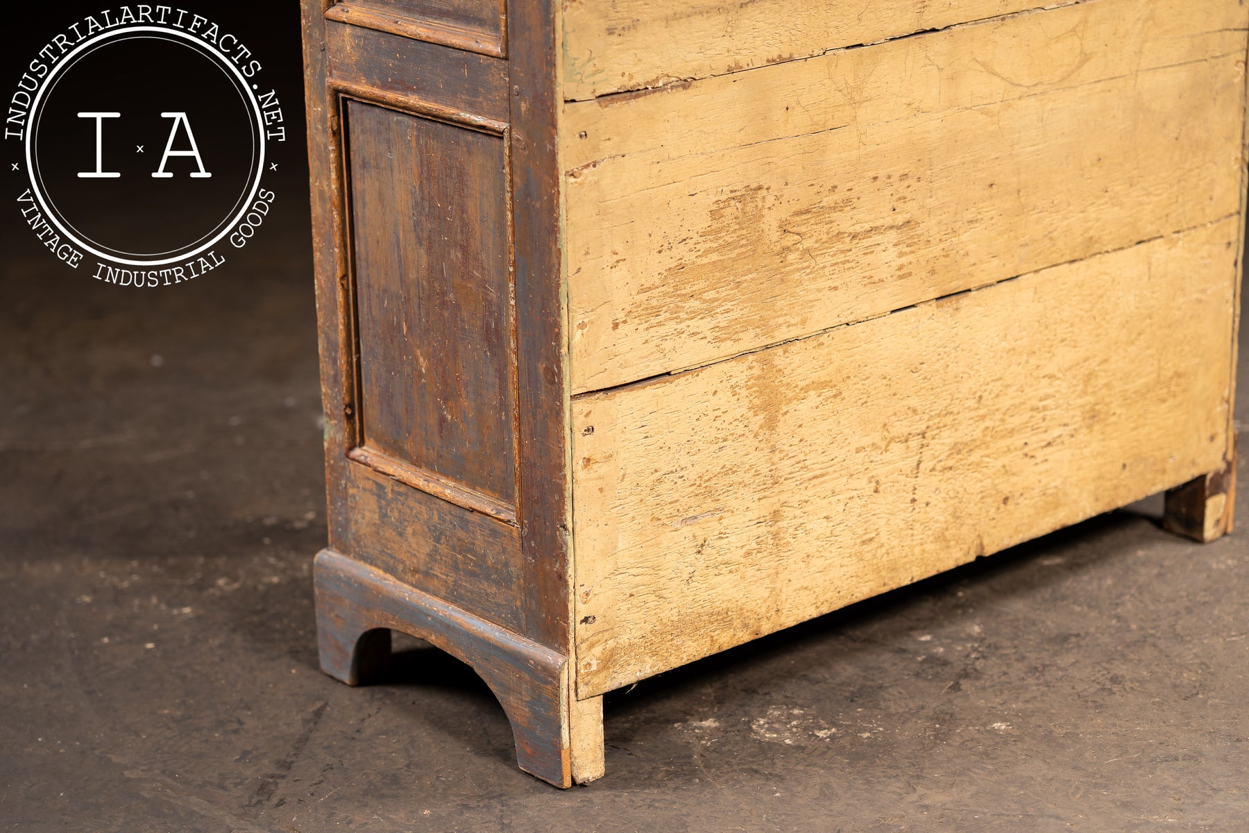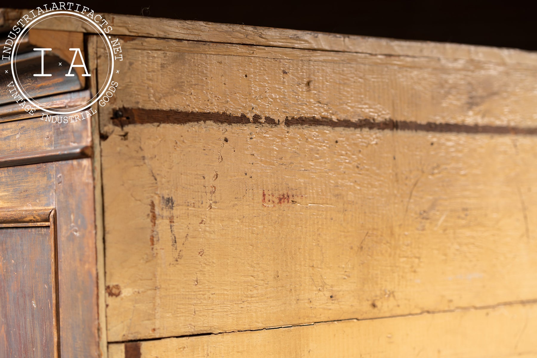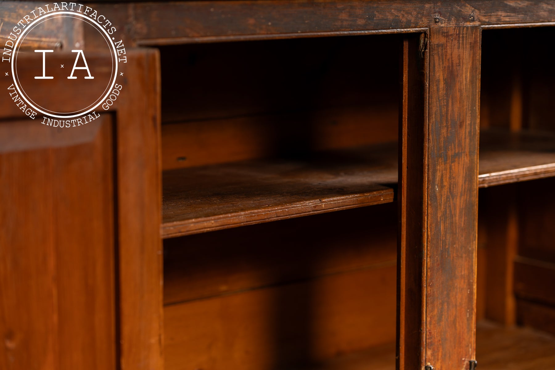 Built during the late Victorian era, this form was commonly produced by regional cabinetmakers throughout the Midwest and Northeast for household or pantry storage. The honest joinery, pegged construction, and hand-planed boards reflect small-shop craftsmanship of the period. The finish has mellowed to a rich, earthy tone, where remnants of its original red-brown paint mix with bare pine grain along edges and corners.