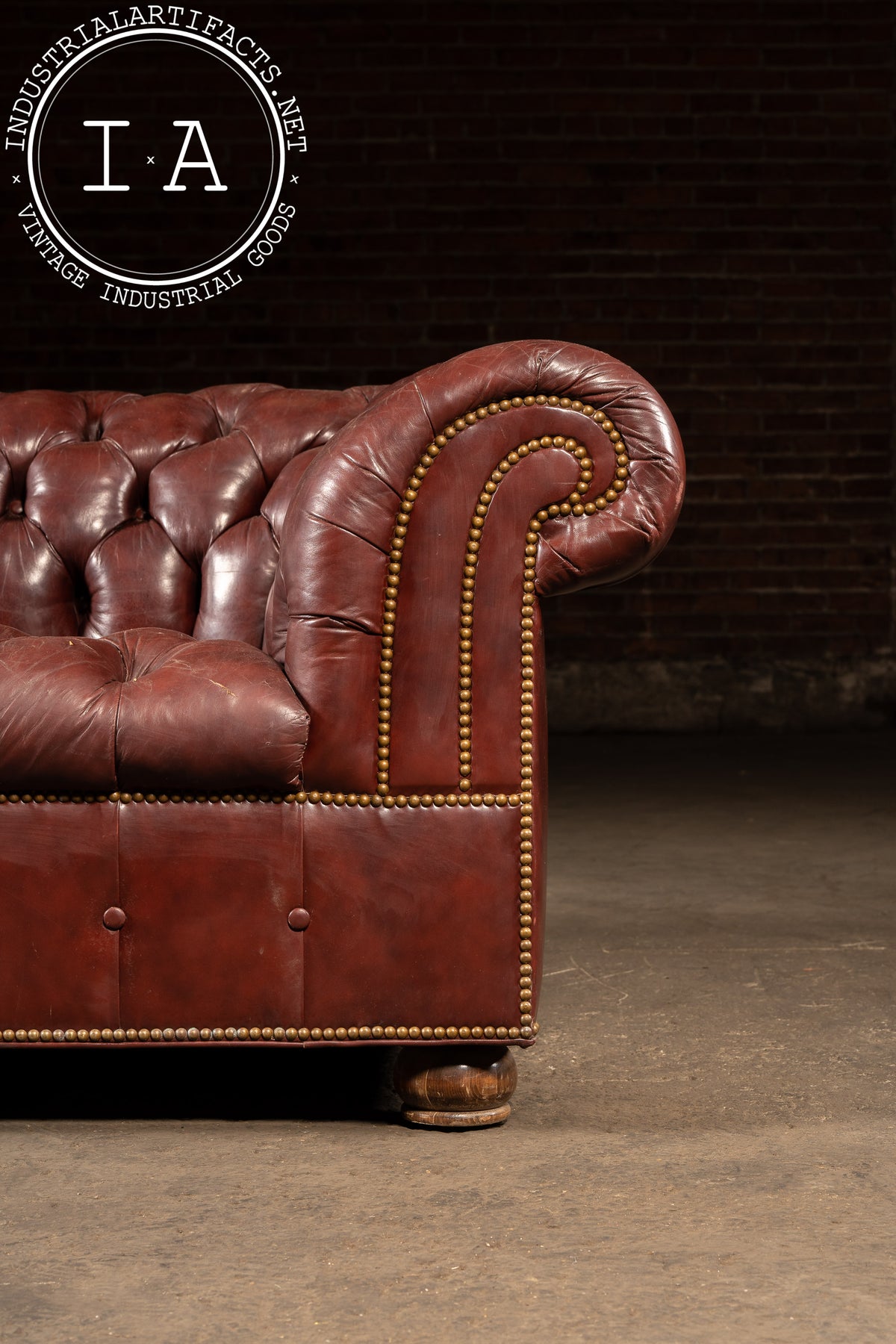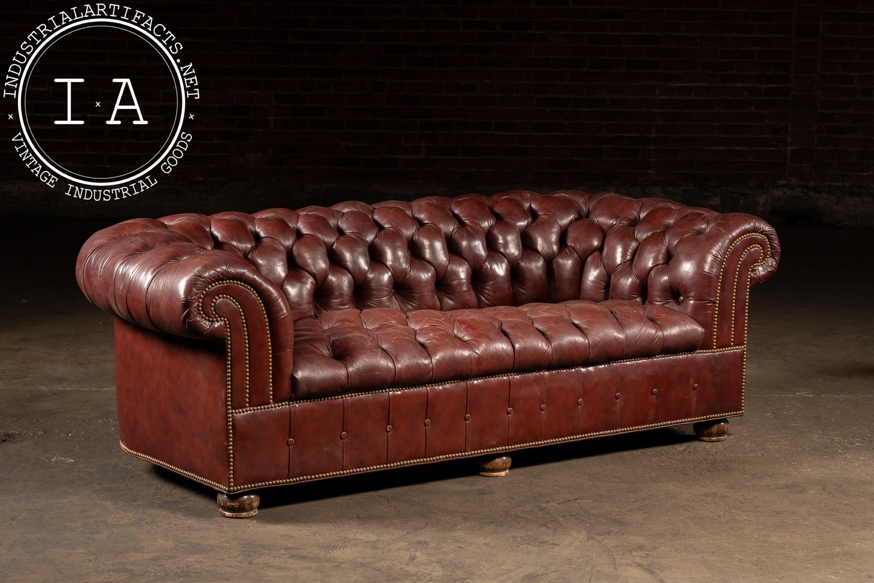 Deep tufting across the seat and back provides the sofa's signature plush texture, while turned wood bun feet anchor the form. The thick leather upholstery carries a warm patina developed over decades of use, lending it an inviting, time-worn presence.