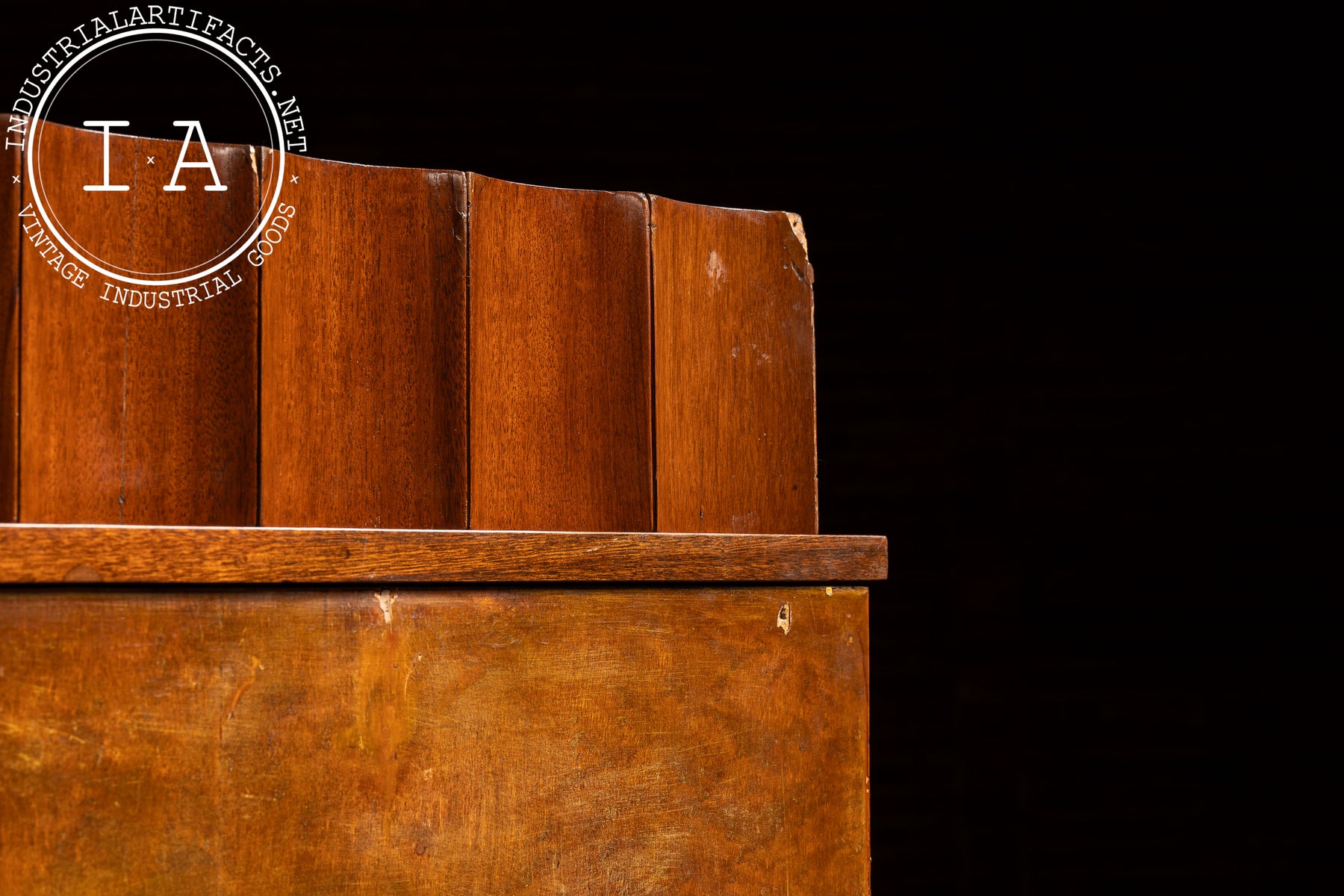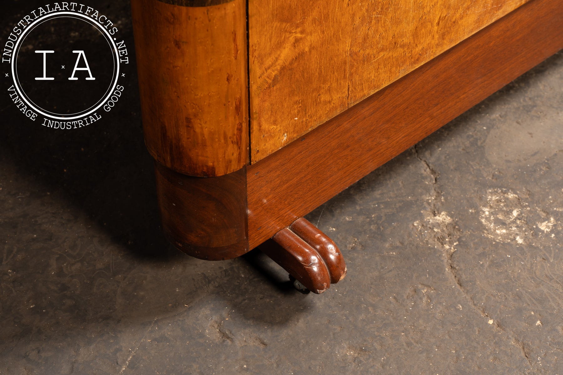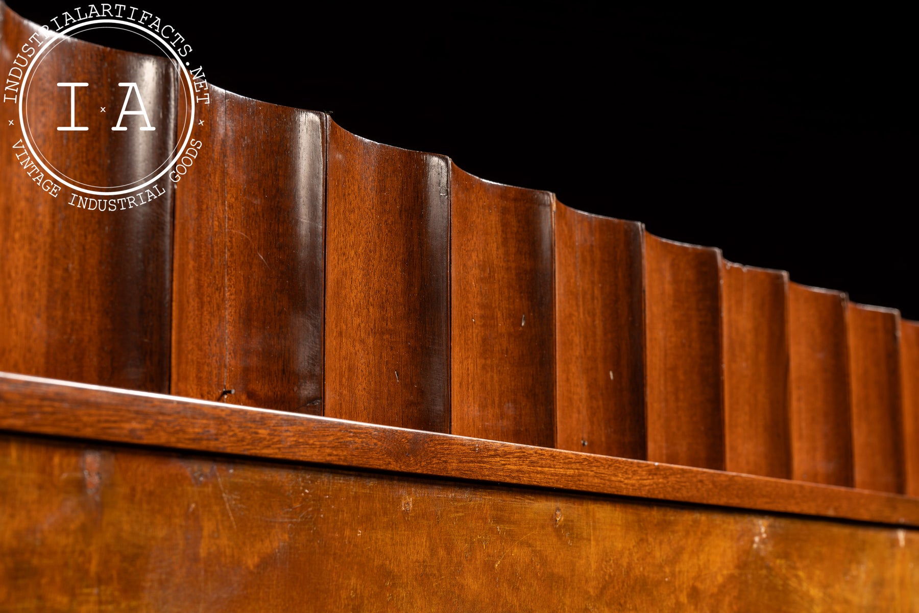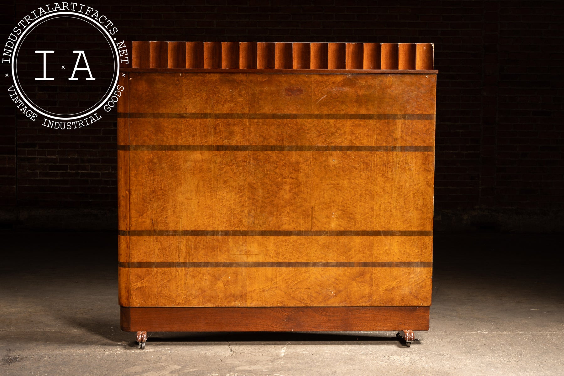 Striking Art Deco room divider crafted from richly figured birdseye maple with contrasting walnut banding and a fluted upper gallery. The piece rests on carved wooden feet fitted with original casters, allowing it to roll smoothly for easy reconfiguration within a space. Its streamlined geometry, bold horizontal striping, and warm honeyed finish are hallmarks of American Deco design-functional modernism softened by organic material expression.