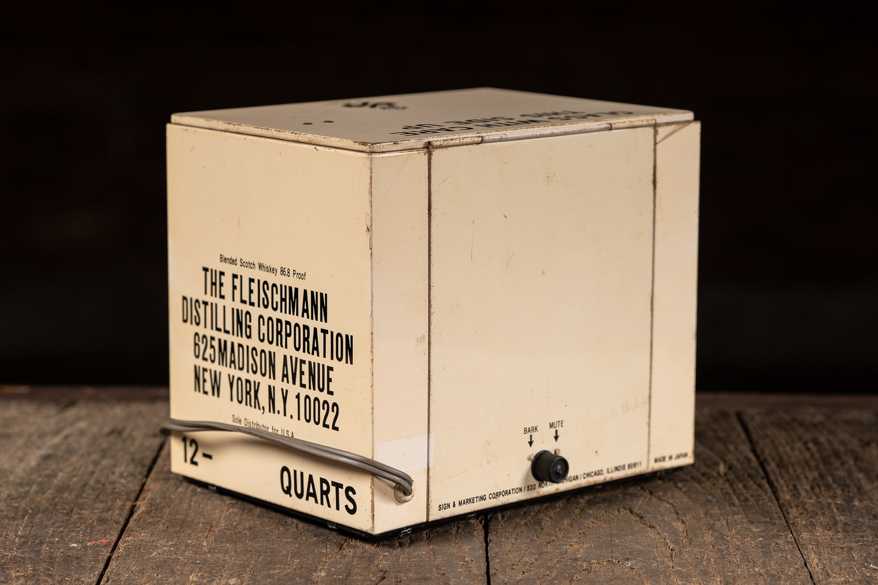 Vintage animatronic liquor display featuring the iconic "Black & White" Scottie and Westie dogs emerging from a branded tin whisky crate. When activated, the lid lifts to reveal the pair of plush mechanical pups that move and emit a squeaky "bark." Produced as a point-of-sale advertising display for James Buchanan's Black & White Scotch Whisky, these animated figures were placed on liquor store counters and bars to draw customer attention with their charming motion and sound.