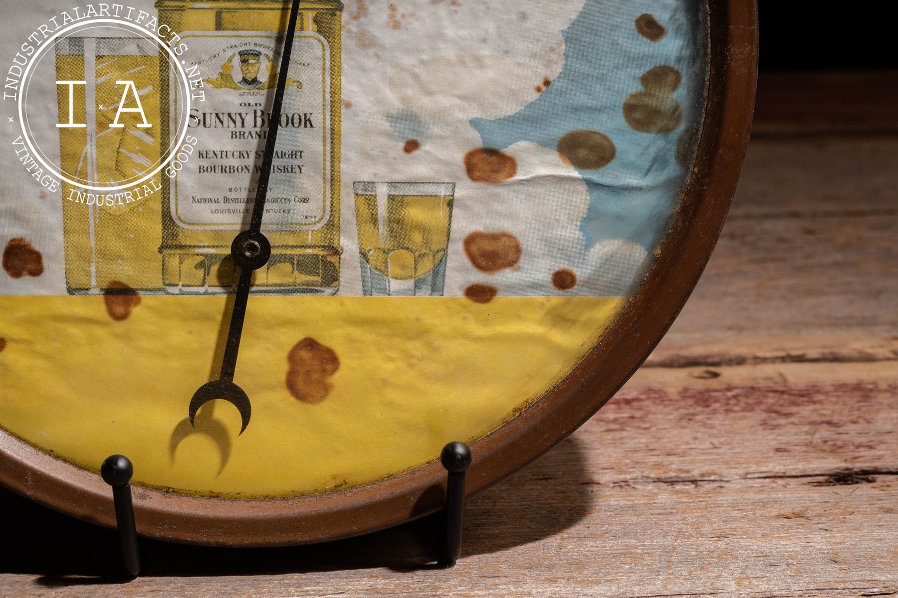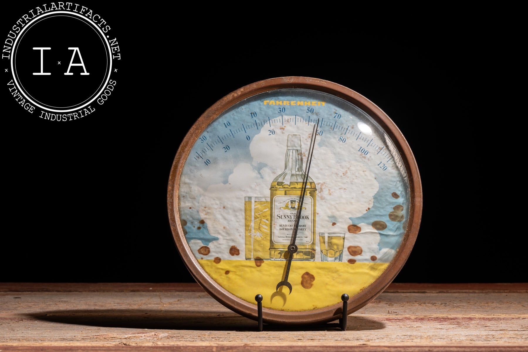 Round wall thermometer featuring a colorful lithographed advertising dial for Sunny Brook Kentucky Straight Bourbon Whiskey. The central graphic shows a bottle flanked by two filled glasses against a soft sky backdrop, with a bold "FAHRENHEIT" scale arcing across the top. The metal bezel frames a convex glass cover, while the black needle remains intact and legible across the temperature range. The graphic retains strong visual presence despite age, with scattered spotting and patina that lend it an honest, time-earned character. The reverse retains the original NAPCO (National Advertising Products Co.) label, a firm known for producing promotional advertising pieces for businesses during the early twentieth century.