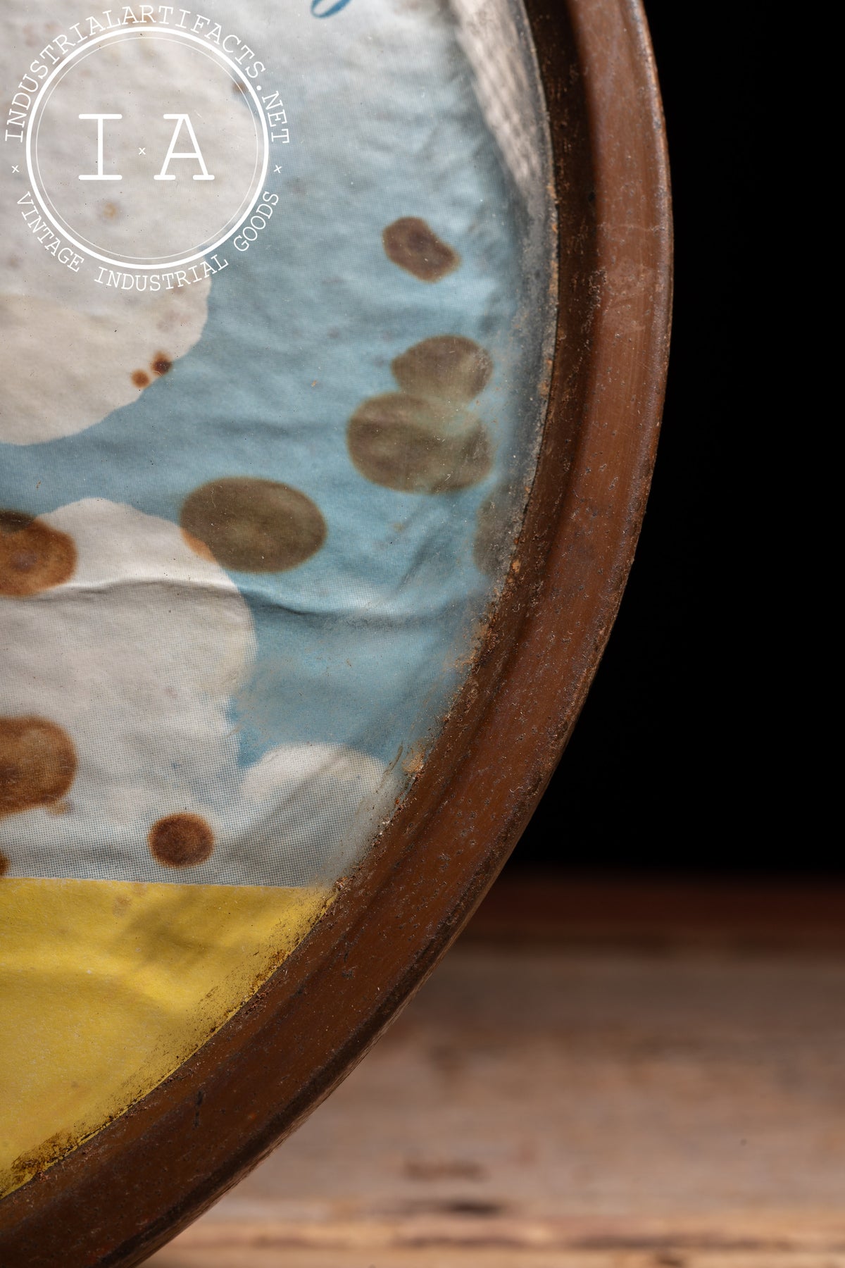 Shows moderate wear throughout including surface oxidation to the metal bezel, spotting and staining across the dial, and light discoloration to the graphic. Glass appears intact with minor surface wear.