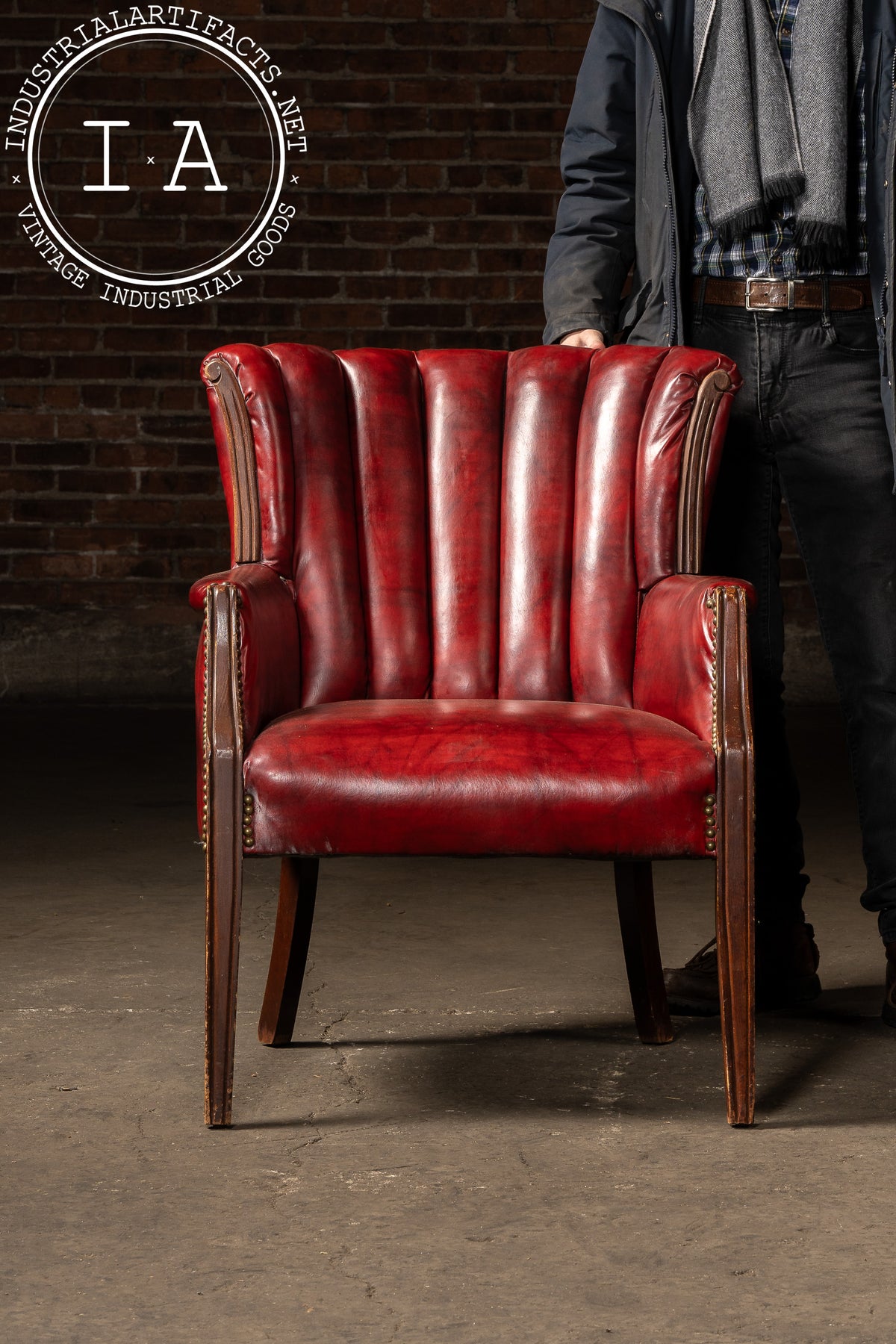 This style of leather chair was commonly produced for offices, libraries, clubs, and private studies during the early-to-mid 20th century, when channel backs and richly dyed leathers conveyed both status and durability. The leather has aged attractively, developing tonal variation and patina that emphasizes the vertical channeling and rounded arm forms. Its scale makes it especially versatile, reading as substantial without overwhelming a room.