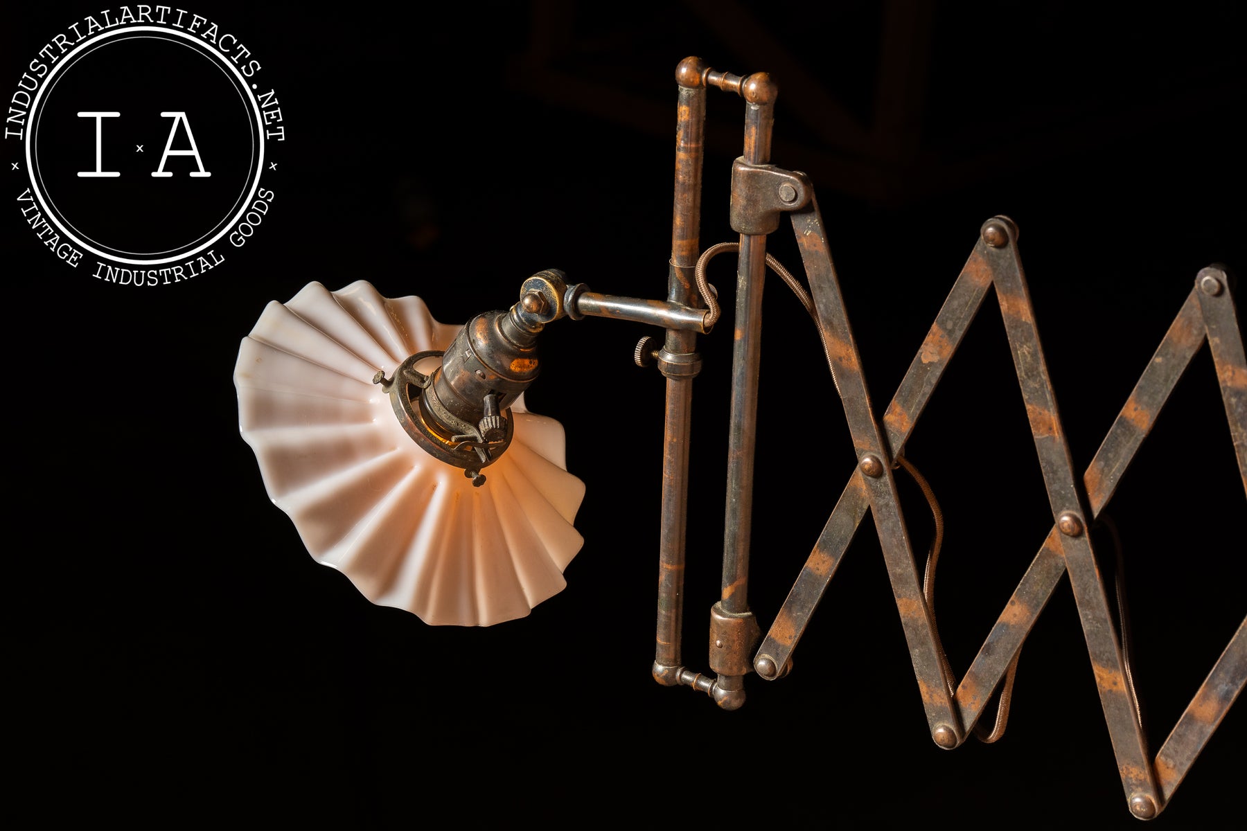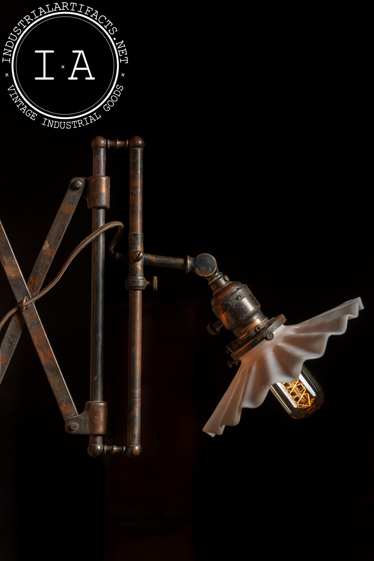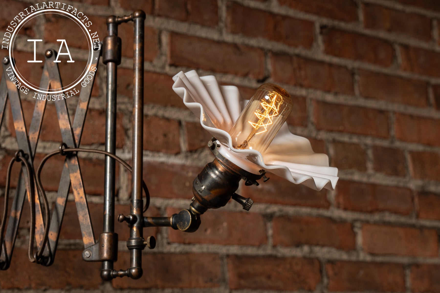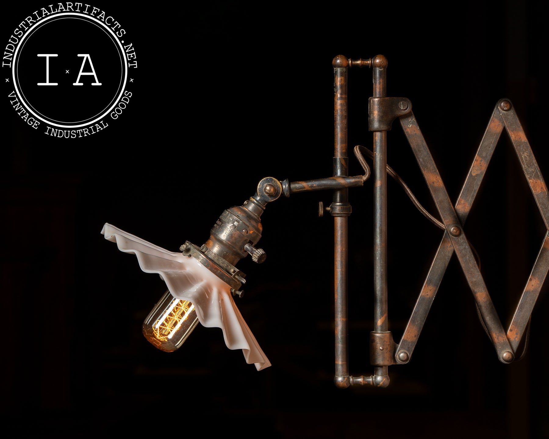 Rare japanned copper scissor-arm wall lamp with cast iron bracket, brass socket, and ruffled milk glass petticoat shade.
