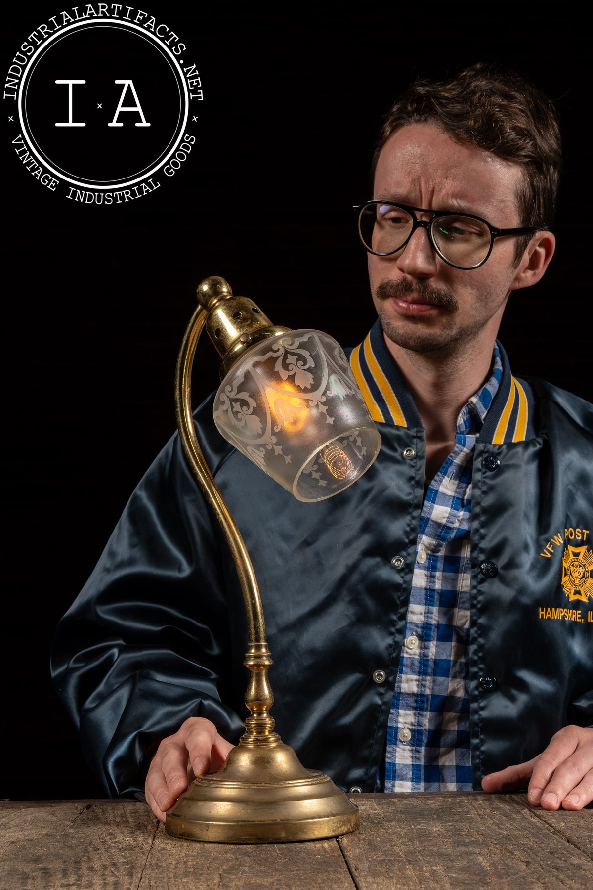 A vintage brass table lamp with a curved neck, featuring an etched and frosted glass shade. This lamp is in excellent condition and has modern wiring for use in your space. The shade is slightly opalescent in appearance.