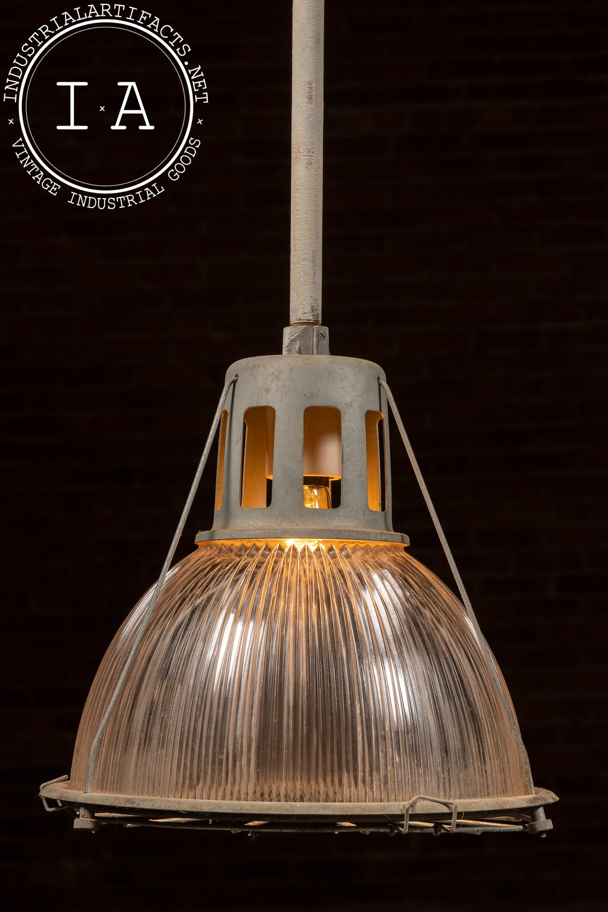 Classic ribbed-glass industrial pendant light manufactured by Holophane, model 685. Features a fluted prismatic glass shade designed to diffuse and direct light evenly, suspended from a vented aluminum housing and rigid downrod mount. The fixture retains its original industrial finish with mild surface wear, displaying the honest patina characteristic of factory and warehouse use.